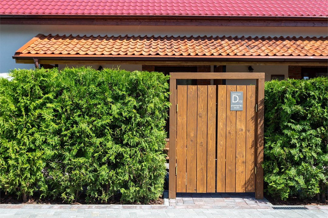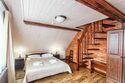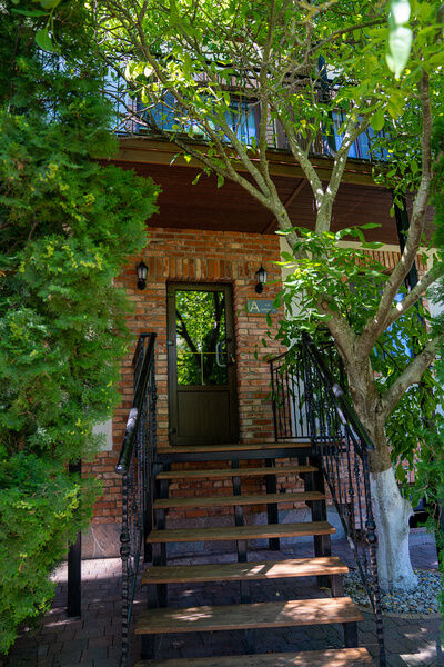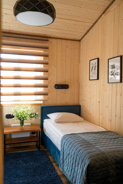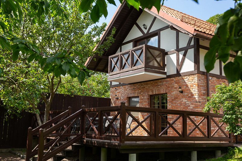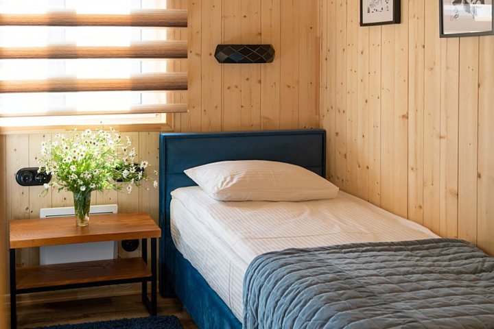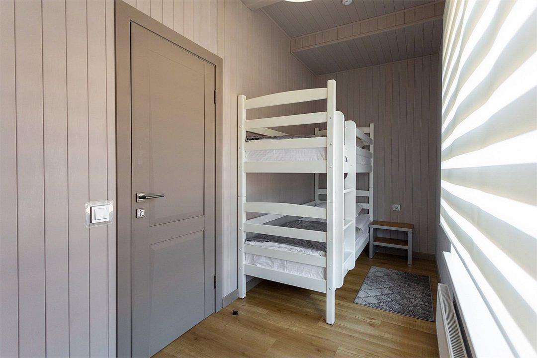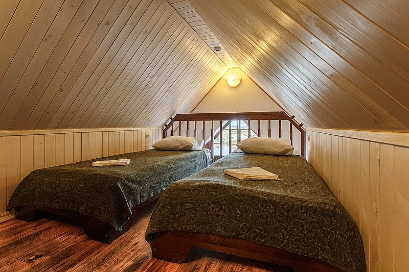 На втором этаже расположены две спальни: одна с четырьмя одноместными кроватями, вторая — с двуспальной кроватью и одной одноместной. В стоимость входит также собственная беседка и мангальная зона.