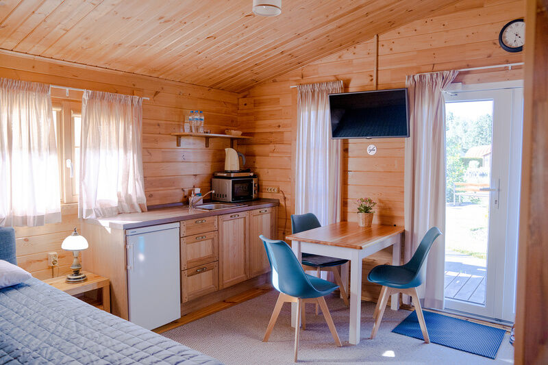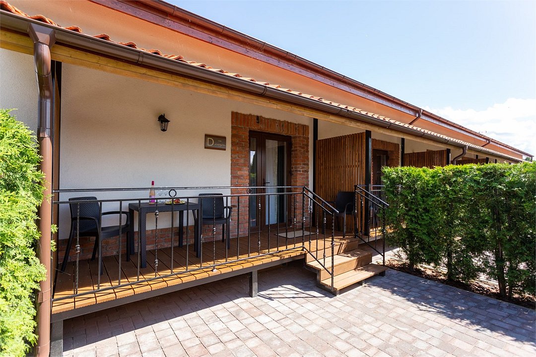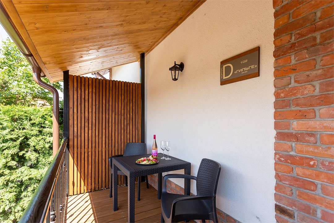 Здесь есть все необходимое для комфортного времяпровождения. В номере двуспальная кровать и двухъярусная кровать, собственный санузел. Из окон открывается вид на территорию отеля. Также имеется своя терраса и отдельный вход. Номера данной категории находятся в корпусе «Гильге».