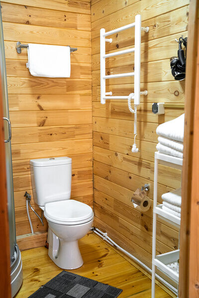 Кроме того, баня на дровах укомплектована современными удобствами, включая санузел, душ и банный чан, что позволяет наслаждаться не только традиционными банными процедурами, но и комфортом современности.
