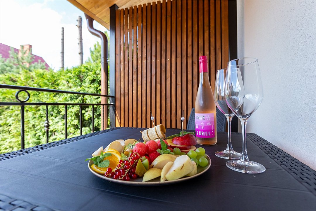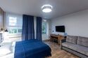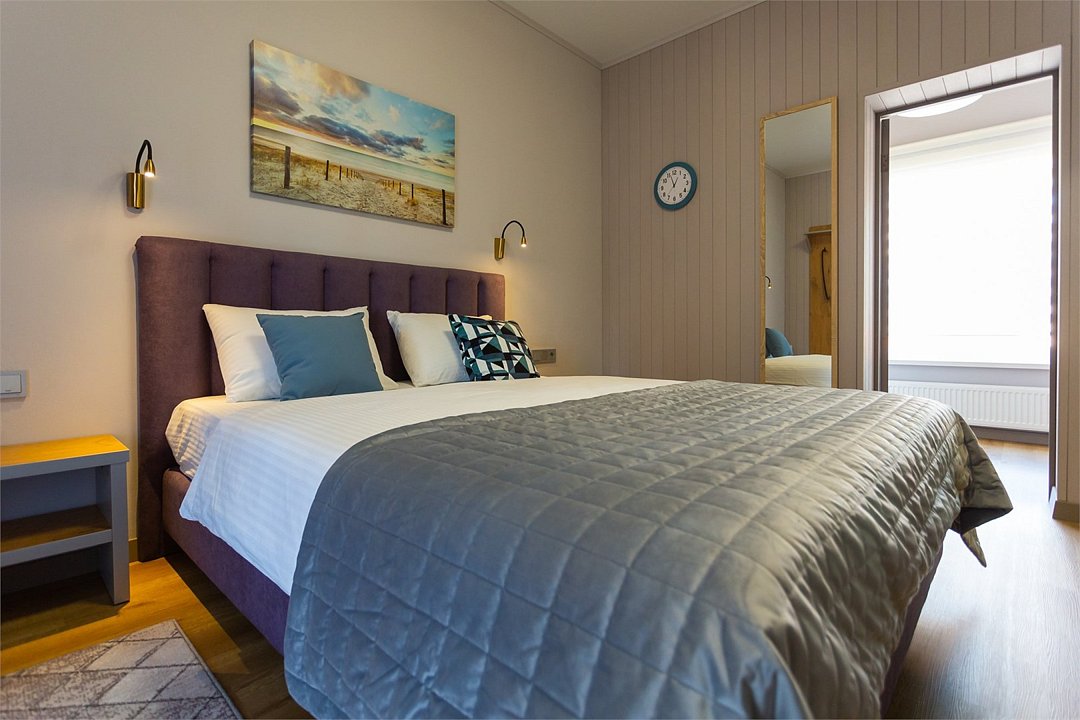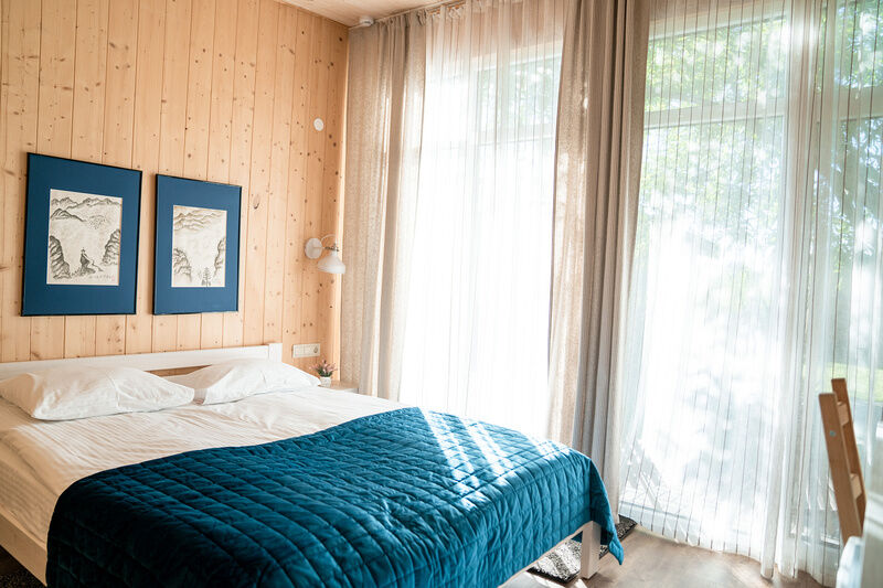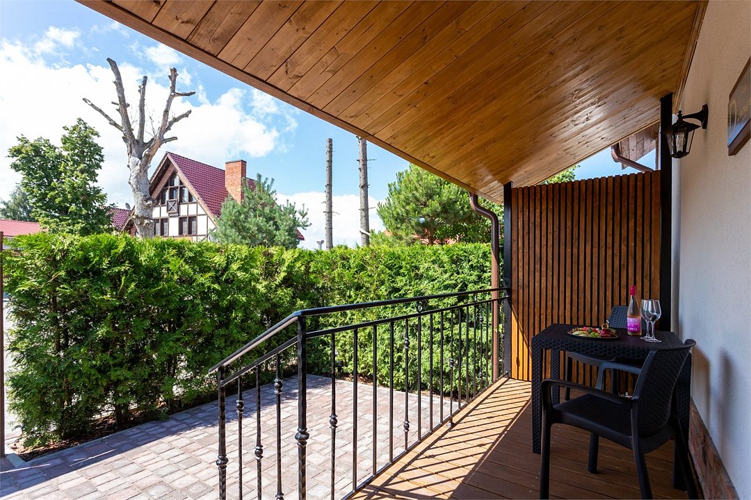 Номер оснащен двуспальной кроватью и кухонной зоной, также имеется балкон. Из номера открывается прекрасный вид на живописную территорию отеля. Номера данной категории находятся в корпусах «Немонин» или «Дейма».