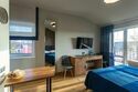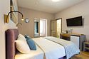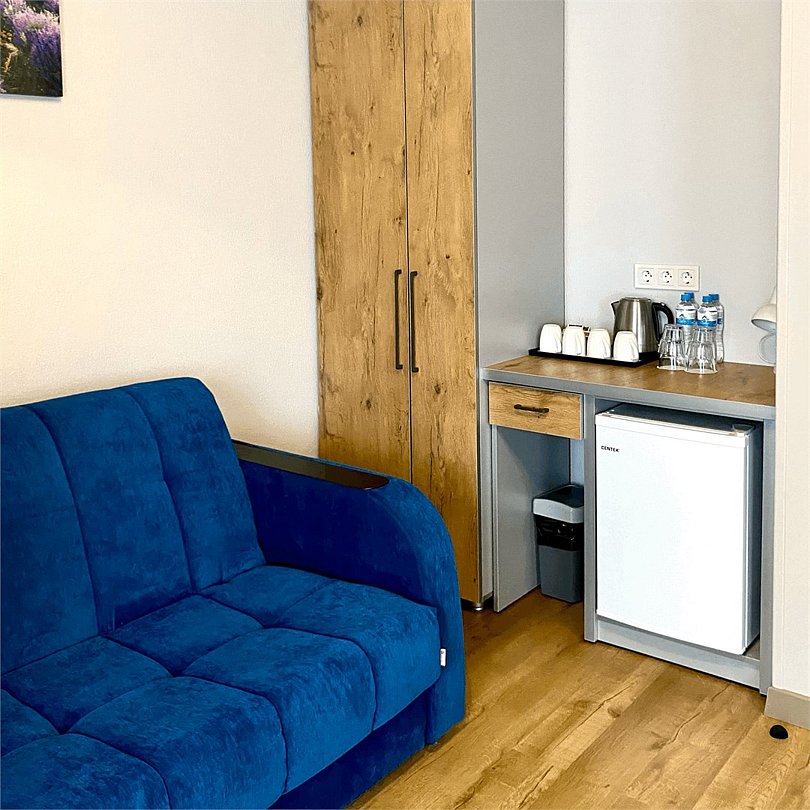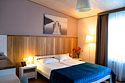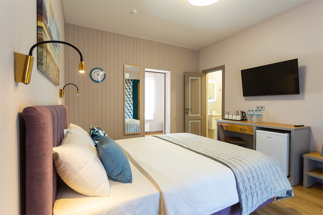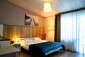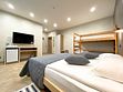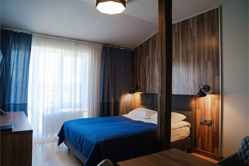 Здесь есть все необходимое для комфортного времяпровождения. В номере двуспальная кровать, собственным санузлом. Также имеется раскладной двуспальный диван, есть возможность бронирования с дополнительными спальными местами. Из окон открывается вид на территорию отеля. Отдельный вход. Номер данной категории находится в корпусе «Гильге».