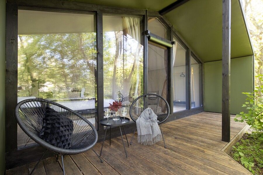 Каждый номер оснащен собственной просторной террасой с удобным навесом, функциональными креслами и небольшим столом, позволяющими наслаждаться отдыхом на свежем воздухе, наслаждаясь звуками природы и шумом прибоя. Для удобства гостей рядом расположены благоустроенные санузлы и душевые кабины, а на территории глэмпинга доступен Wi-Fi.