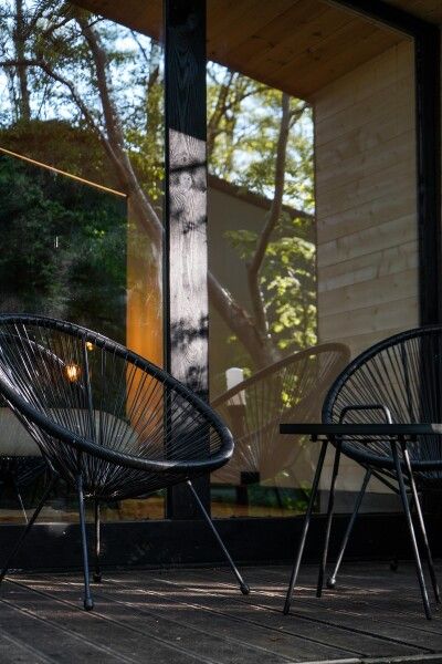 Комфортабельное бунгало площадью 22 м2 с просторной уличной террасой. Интерьер выполнен в скандинавском стиле. Удобства находятся на улице.