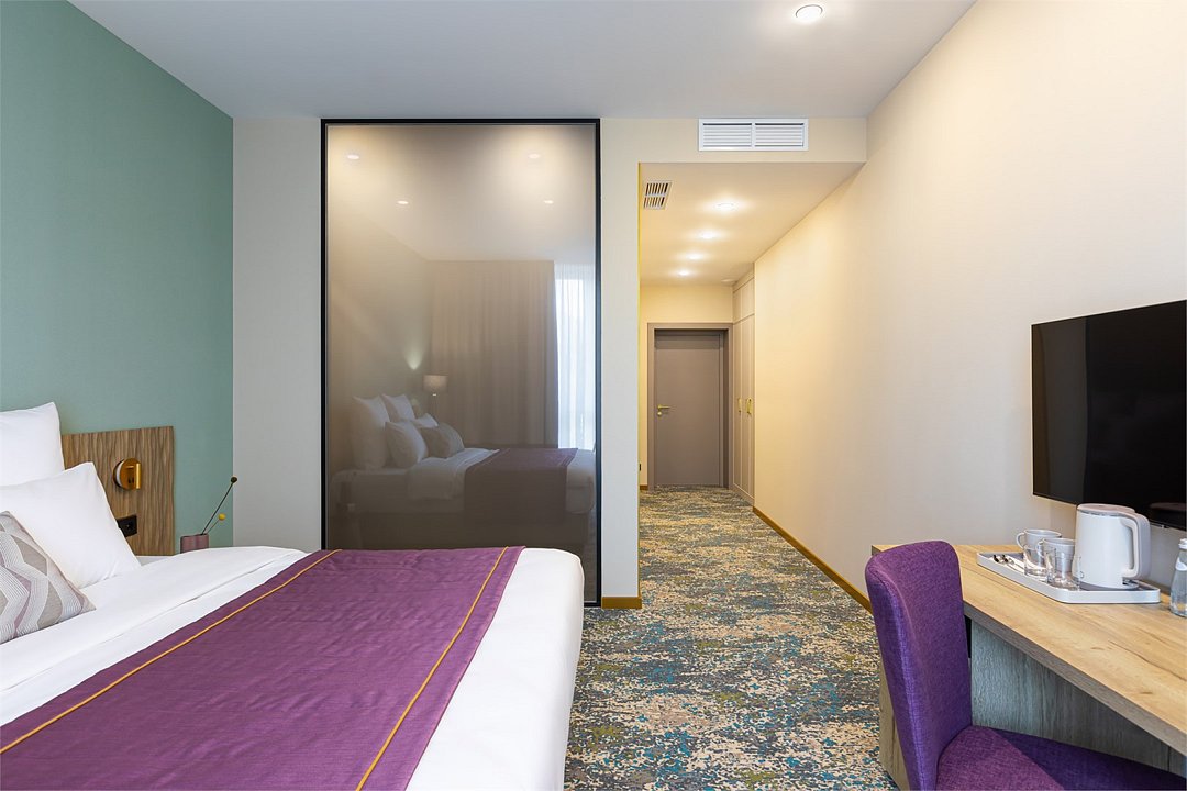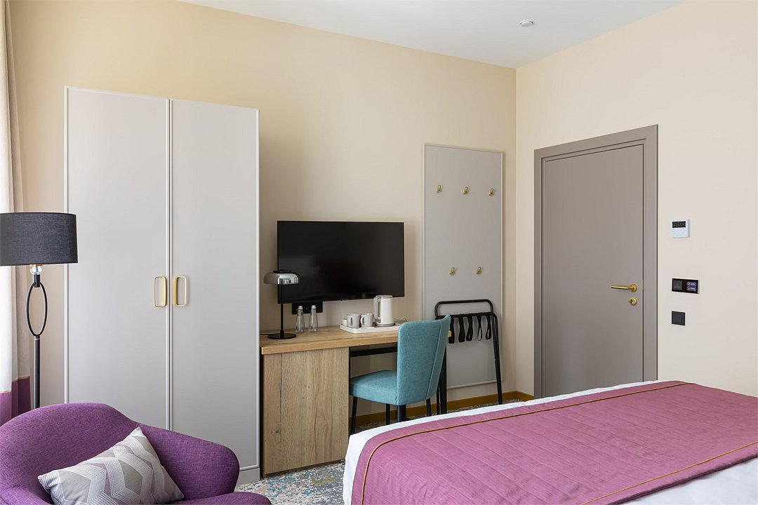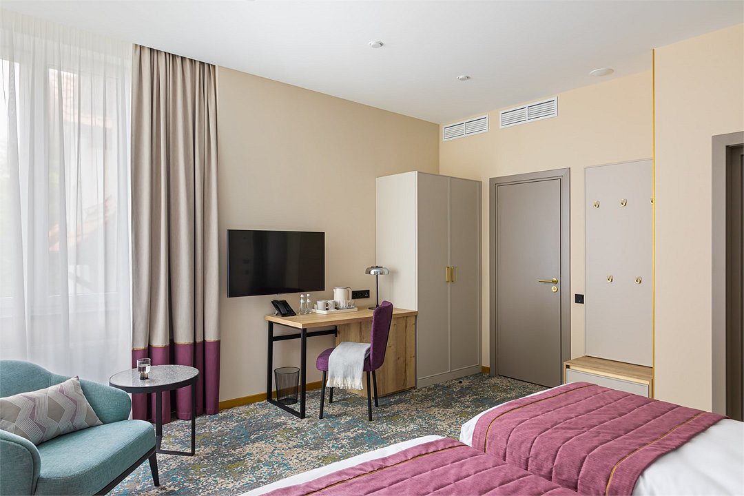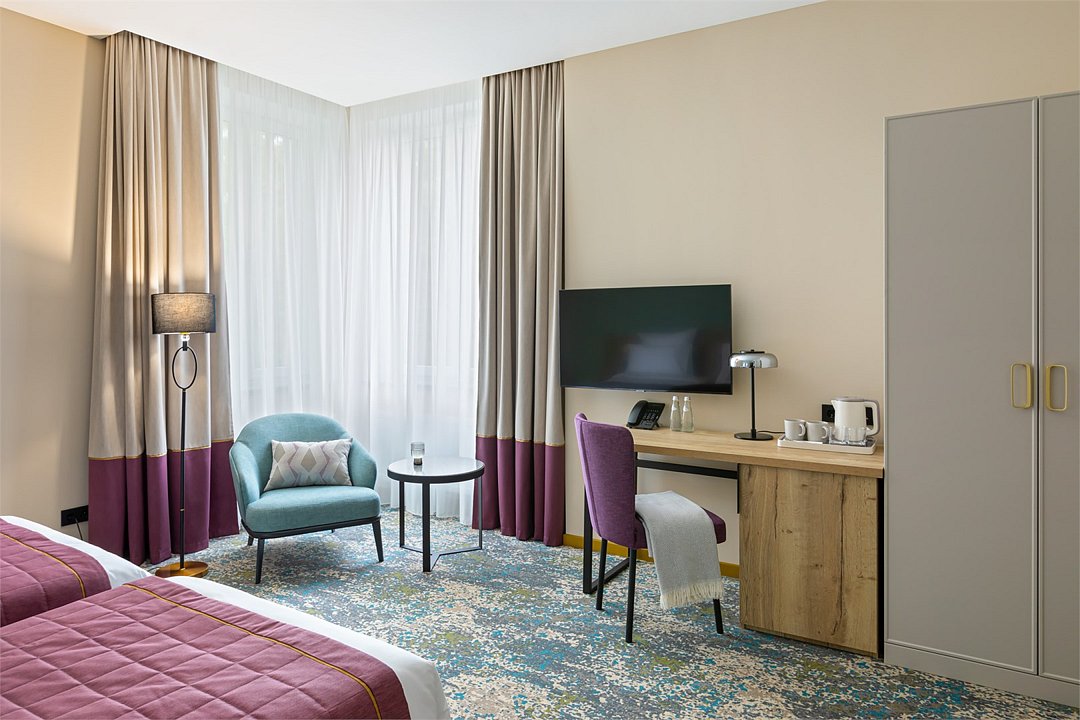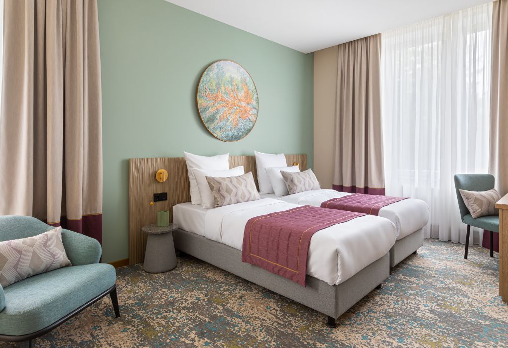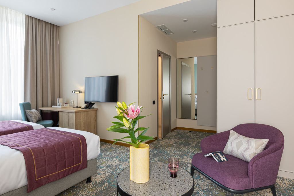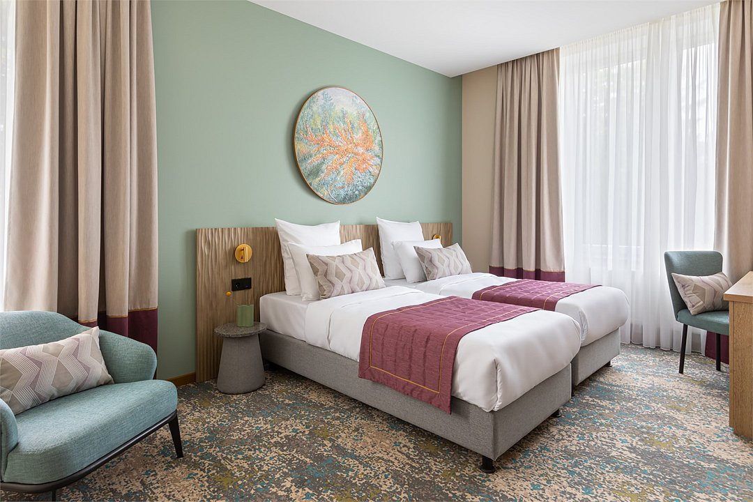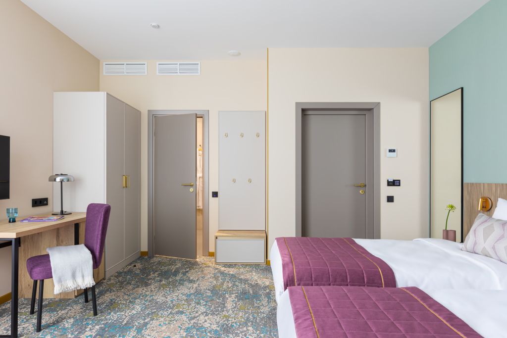 Номера выполнены в спокойных тонах, они идеально подходят для деловых поездок, друзей или семей, которым необходимы раздельные спальные места. В номере две комфортабельные раздельные кровати с ортопедическими матрасами, французским постельным бельём из мягкого хлопка, шторы блэкаут, чтобы вы могли насладиться максимальным комфортом. Также есть просторный шкаф, эргономичный рабочий стол, где вы можете поработать или запланировать свои дальнейшие путешествия.Услуги и удобства