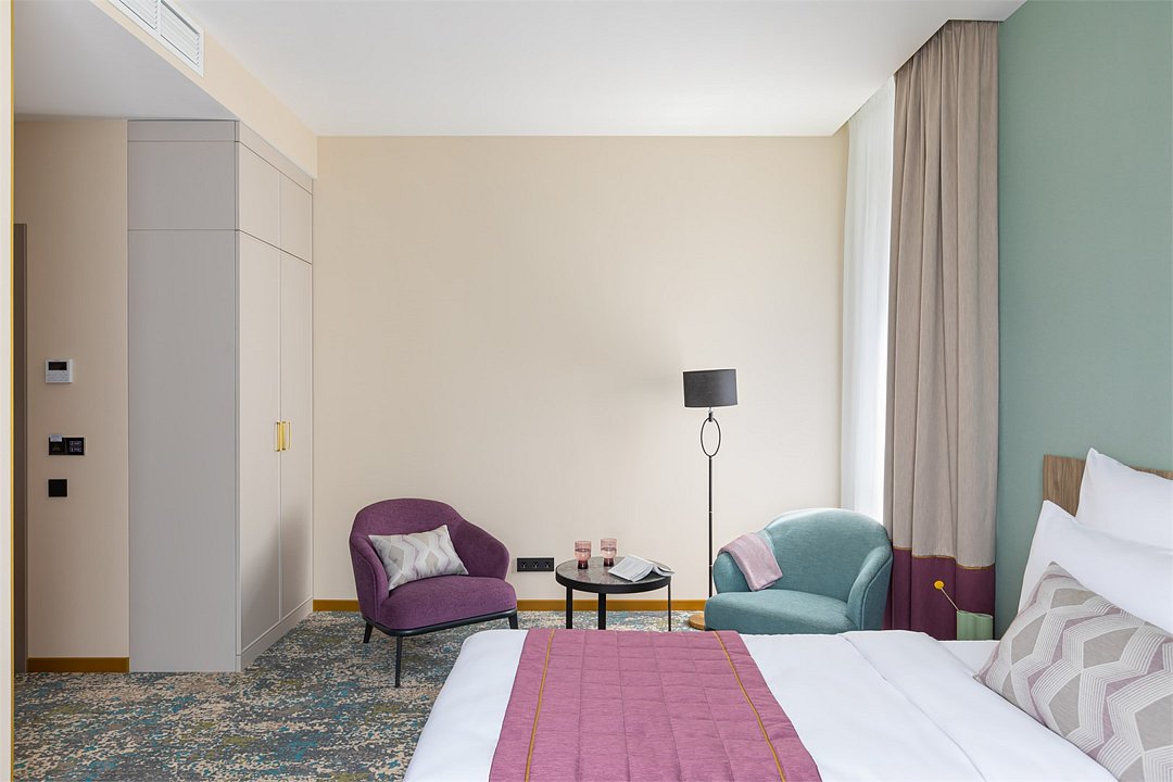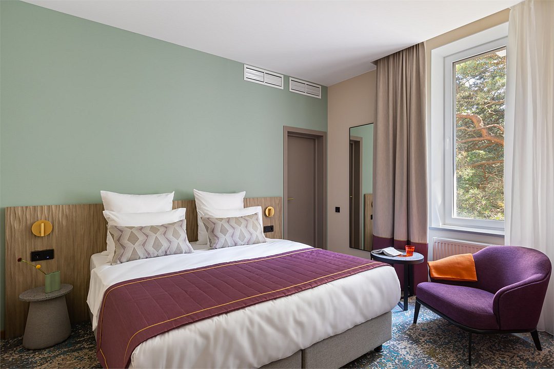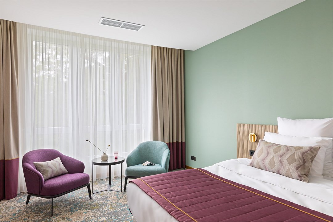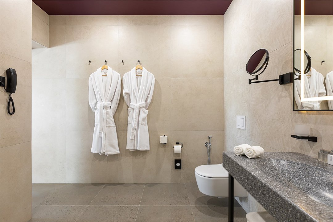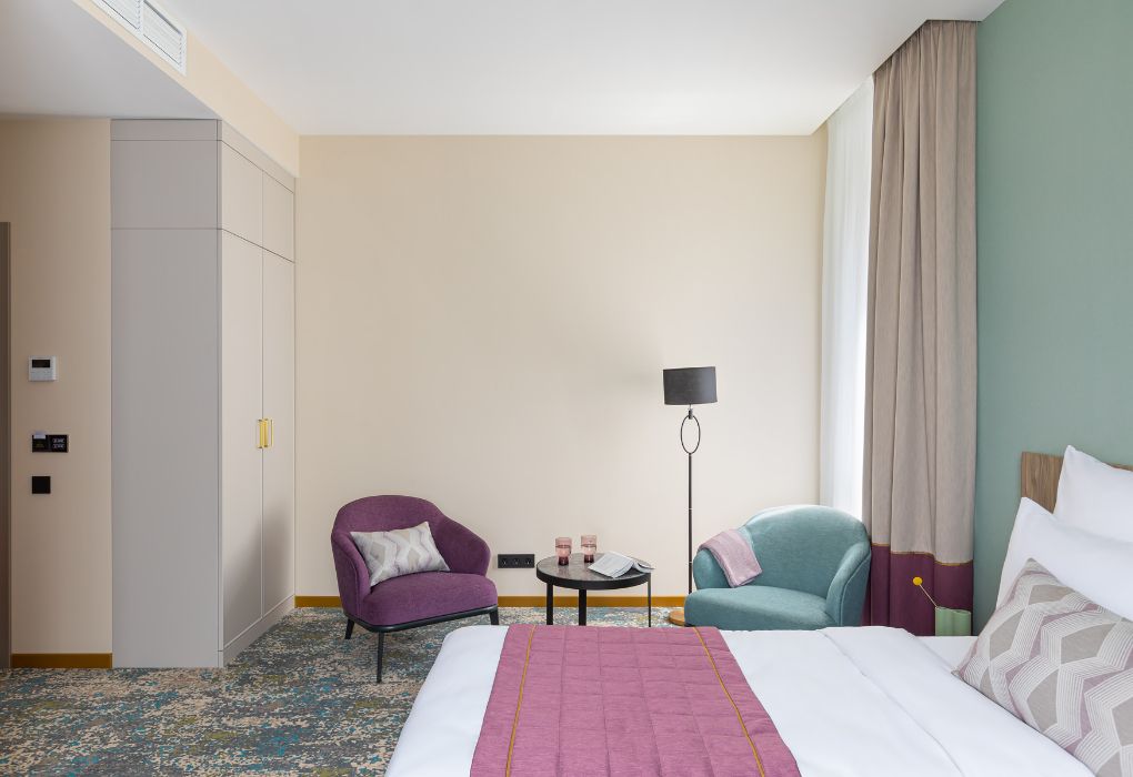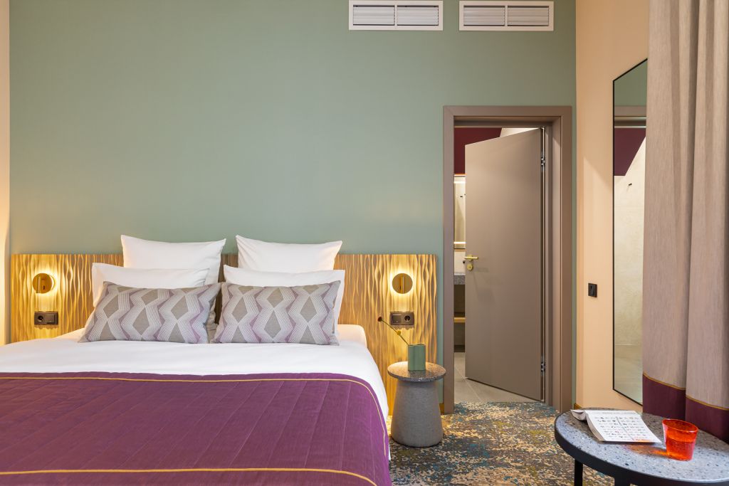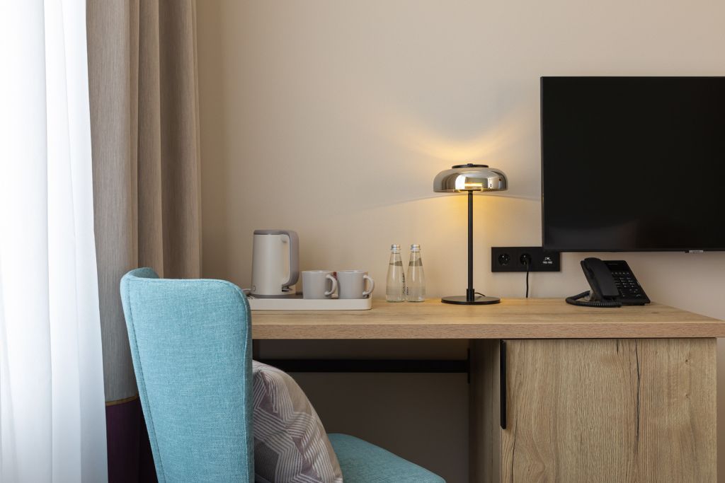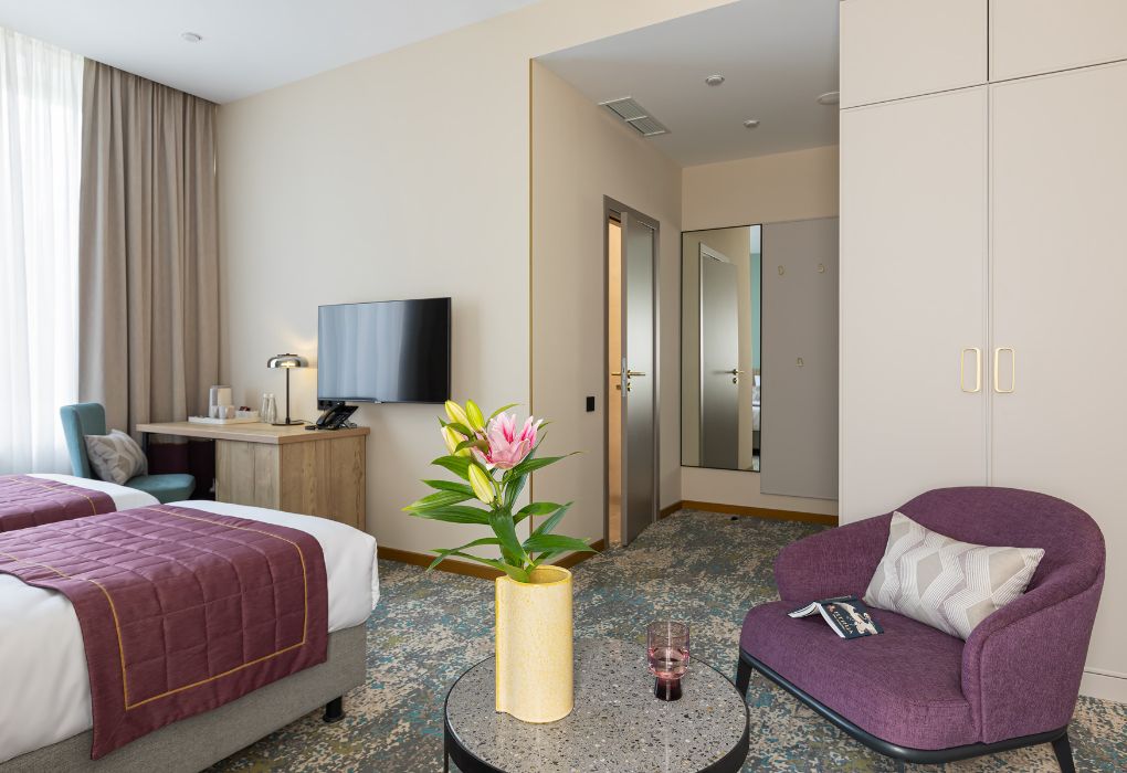Номера выполнены в спокойных тонах, они идеально подходят для деловых поездок, друзей или семей, которым необходимы раздельные спальные места. В номере две комфортабельные раздельные кровати с ортопедическими матрасами, французским постельным бельём из мягкого хлопка, шторы блэкаут, чтобы вы могли насладиться максимальным комфортом. Также есть просторный шкаф, эргономичный рабочий стол, где вы можете поработать или запланировать свои дальнейшие путешествия.Услуги и удобства