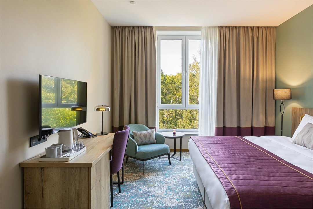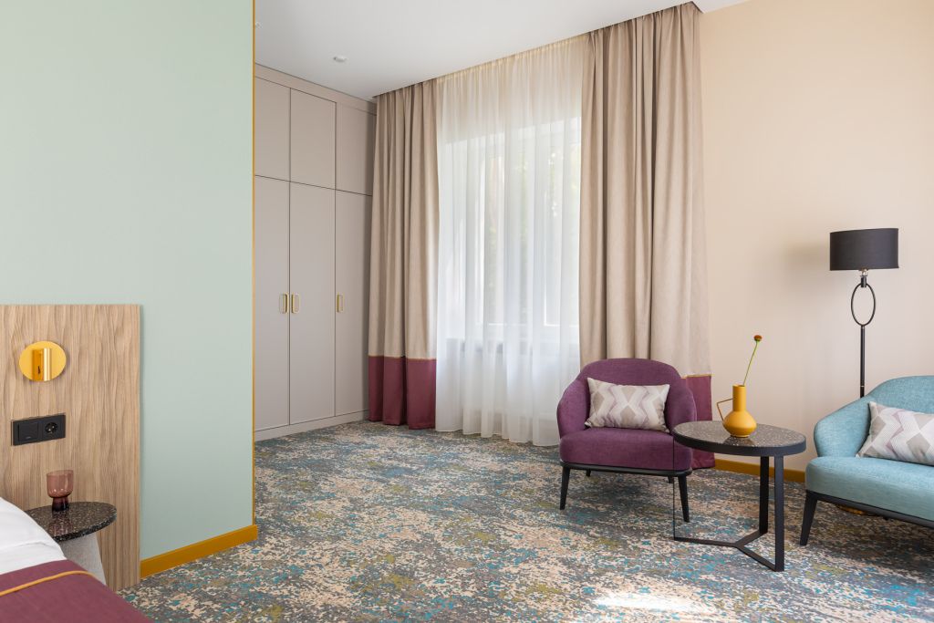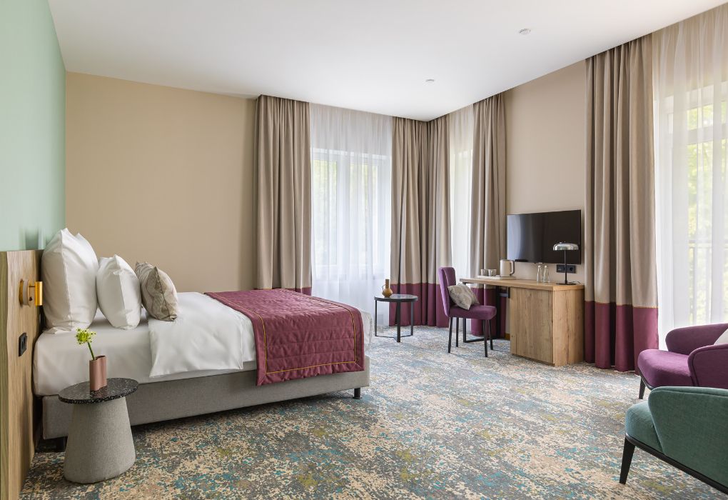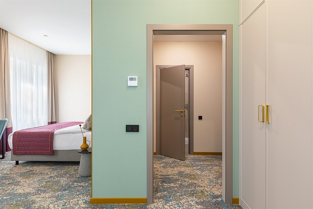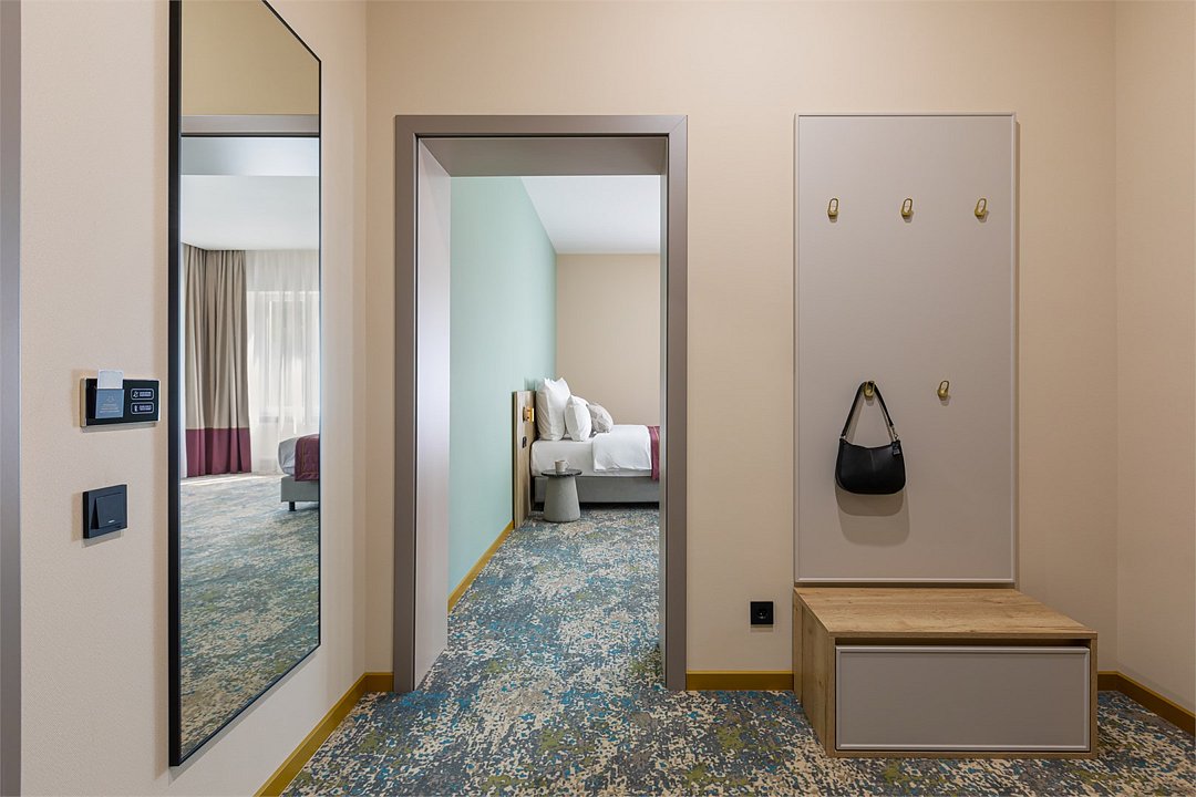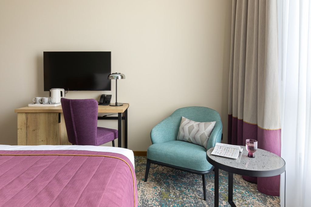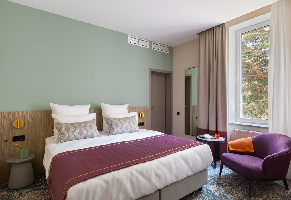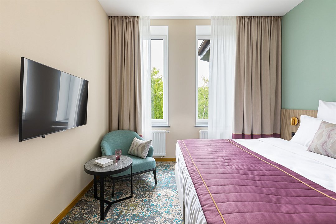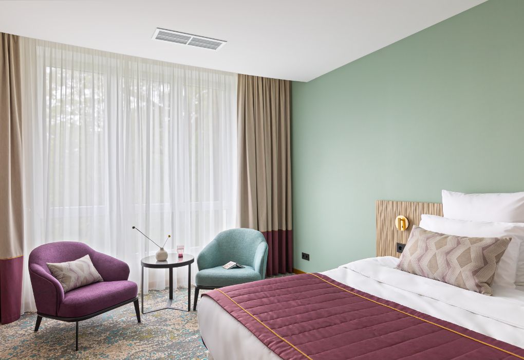 Номера выполнены в спокойных тонах, они идеально подходят для деловых поездок, друзей или семей, которым необходимы раздельные спальные места. В номере две комфортабельные раздельные кровати с ортопедическими матрасами, французским постельным бельём из мягкого хлопка, шторы блэкаут, чтобы вы могли насладиться максимальным комфортом. Также есть просторный шкаф, эргономичный рабочий стол, где вы можете поработать или запланировать свои дальнейшие путешествия.Услуги и удобства