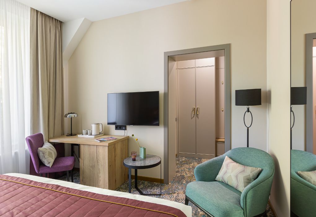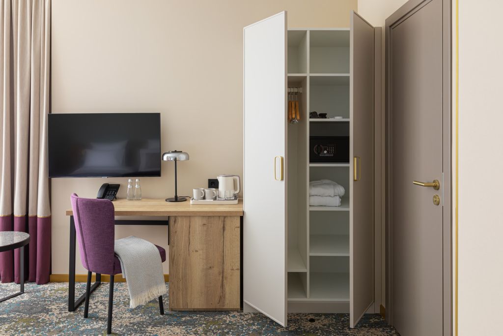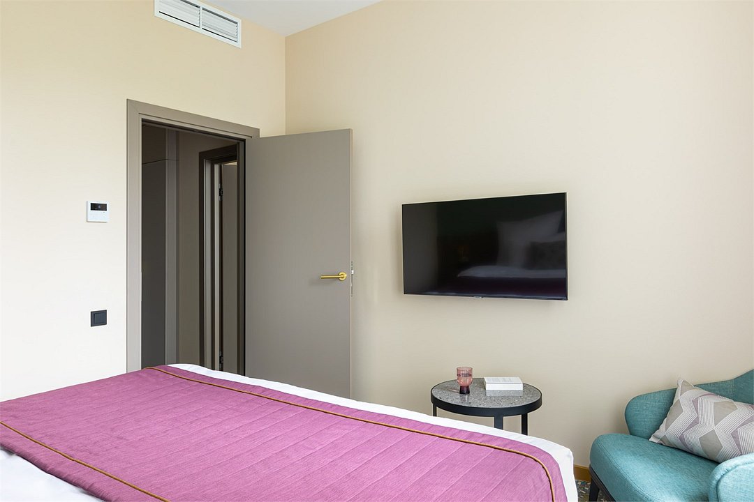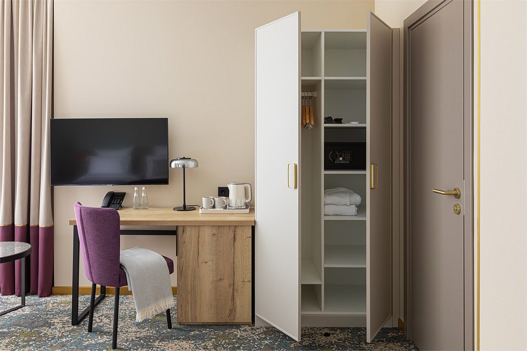 телевизор, Wi-Fi, интернет, телефон, кондиционер, светильник, фен, электронные замки, кофемашина, микроволновая печь, обогреватель, душевая кабина, теплый пол, халаты, тапочки, косметические средства, двуспальная кровать, гипоаллергенное белье, ортопедический матрас, диван, кресла, стулья, шкаф для одежды, вешалки, журнальный столик, обеденный стол, багажная тумба, зеркало, мини-бар, сейф, посудомоечная машина, унитаз, раковина, обеденная зона, гостиная зона, вид на город, меню подушек, кухонная посуда, стаканы, столовые приборы, туалетные средства, туалет, раскладной диван, внутренний телефон, мини-холодильник, мини-кухня, номер для некурящих, рабочий стол, чайная станция, двуспальный раскладной диван-кровать, уборка номера, услуги прачечной (платно), бутилированная вода, без питомцевВ гостиничном номере