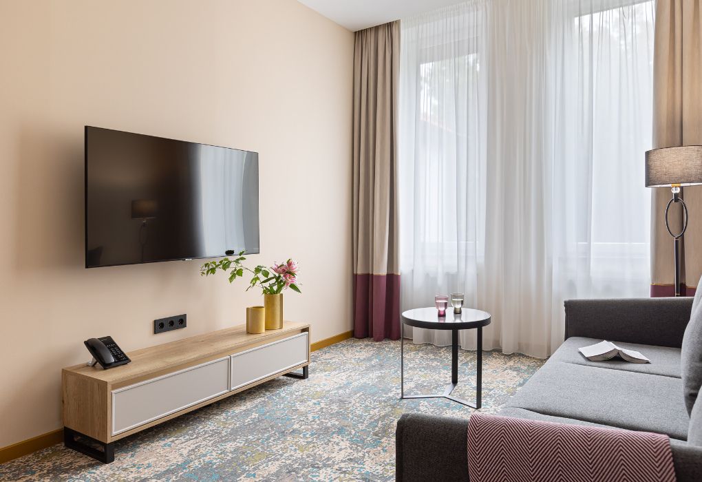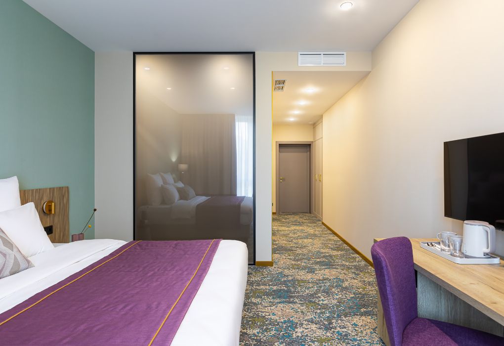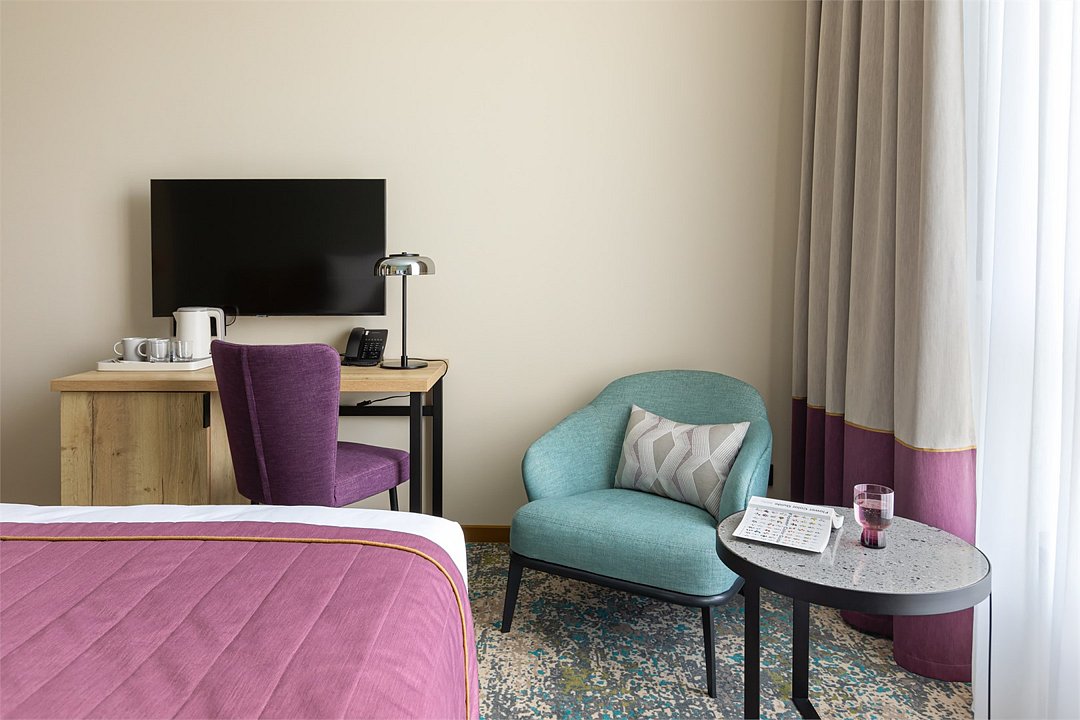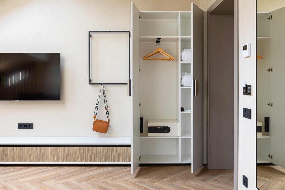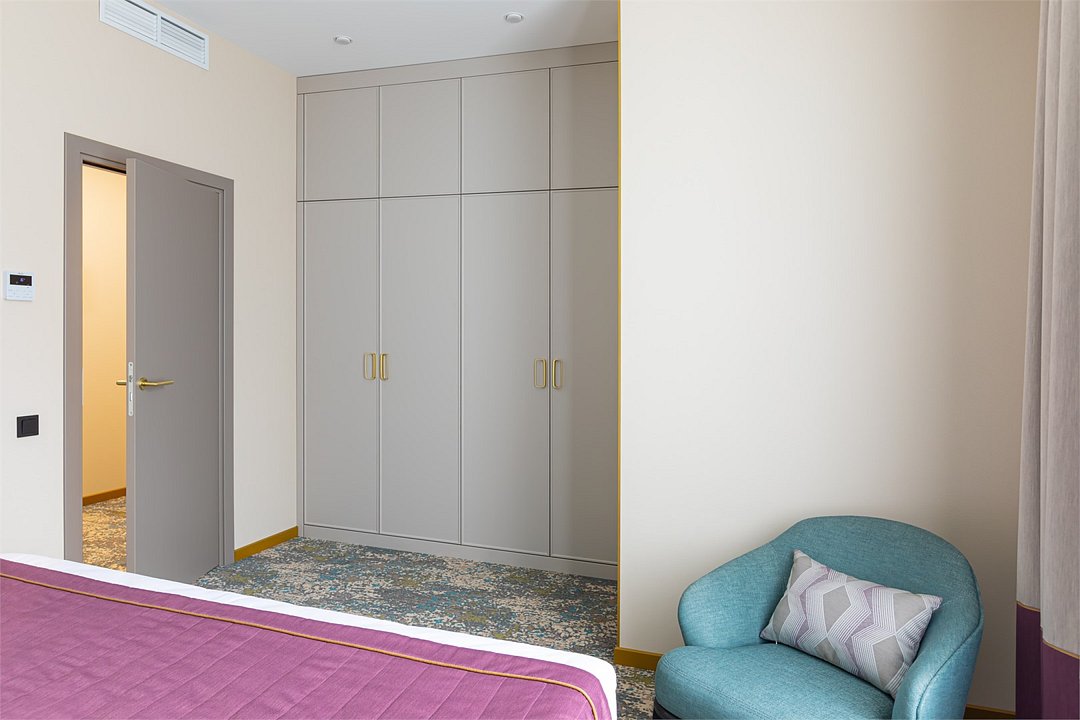 телевизор, Wi-Fi, интернет, телефон, кондиционер, светильник, фен, электронные замки, кофемашина, микроволновая печь, обогреватель, душевая кабина, теплый пол, халаты, тапочки, косметические средства, двуспальная кровать, гипоаллергенное белье, ортопедический матрас, диван, кресла, стулья, шкаф для одежды, вешалки, журнальный столик, обеденный стол, багажная тумба, зеркало, мини-бар, сейф, посудомоечная машина, унитаз, раковина, обеденная зона, гостиная зона, вид на город, меню подушек, кухонная посуда, стаканы, столовые приборы, туалетные средства, туалет, раскладной диван, внутренний телефон, мини-холодильник, мини-кухня, номер для некурящих, рабочий стол, чайная станция, двуспальный раскладной диван-кровать, уборка номера, услуги прачечной (платно), бутилированная вода, без питомцевВ гостиничном номере