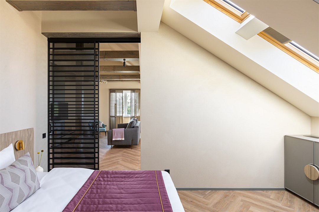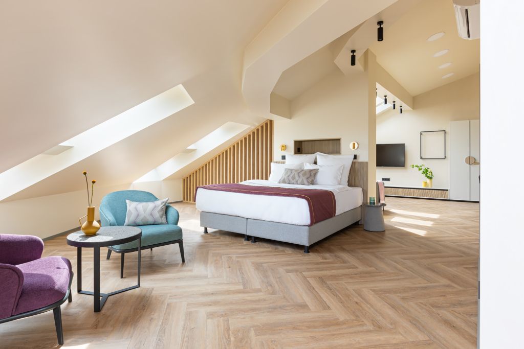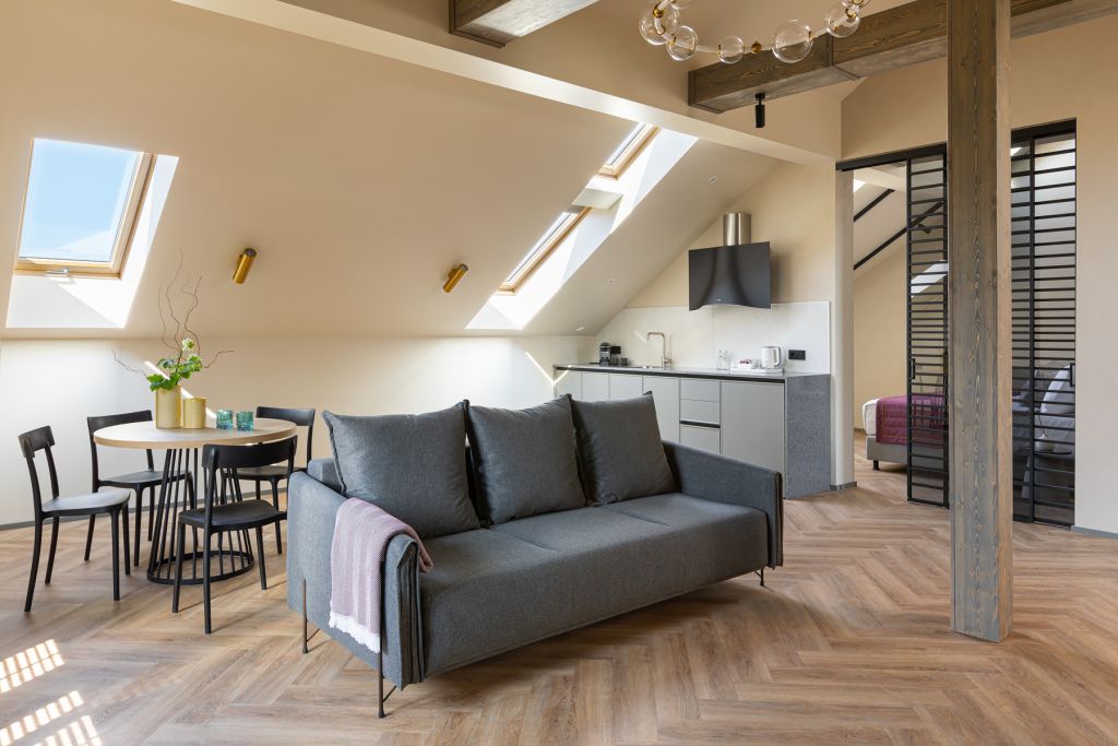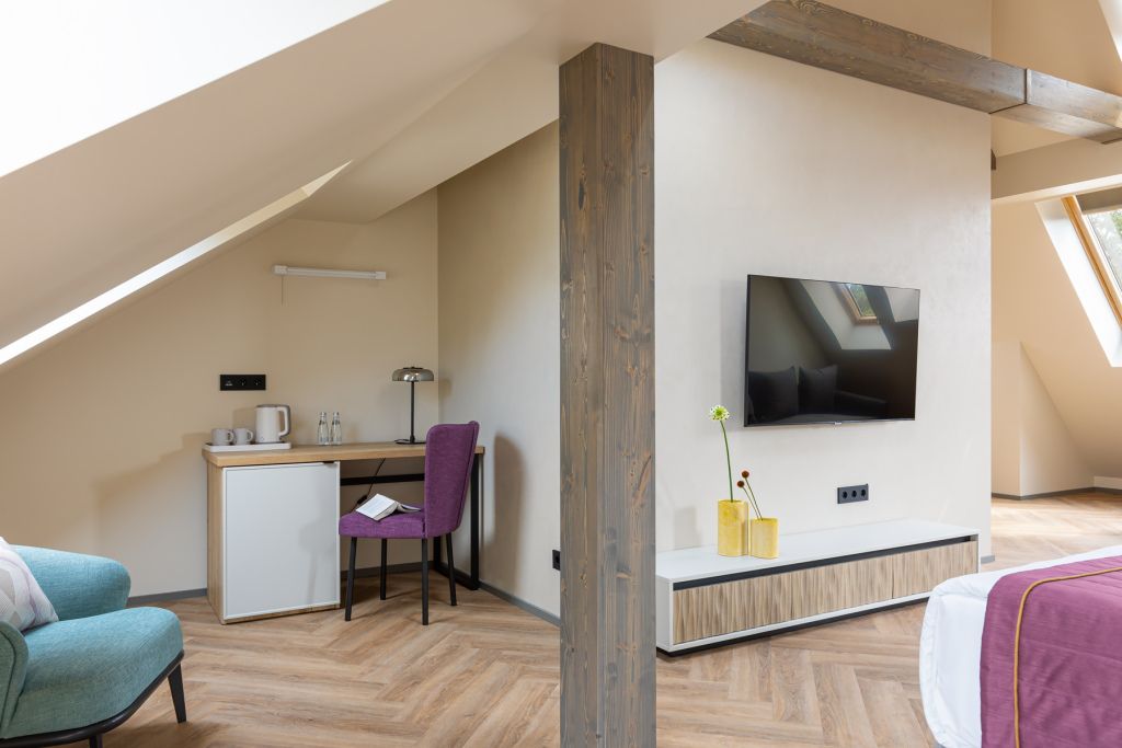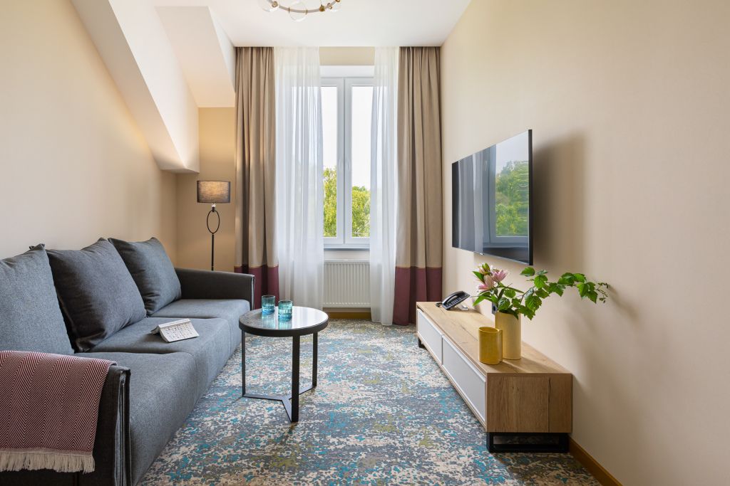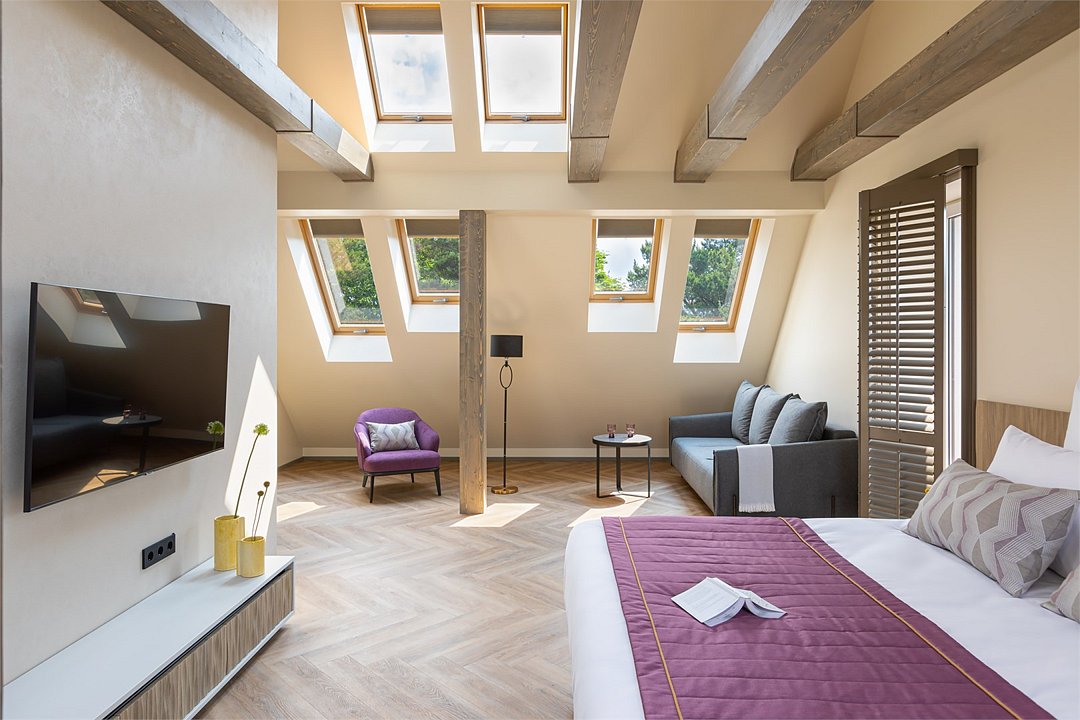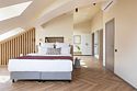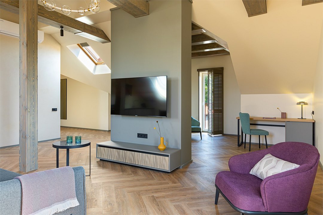 Стильный номер на мансардном этаже предлагает широкий простор (площадь номера 67 кв метров) и комфорт, чтобы удовлетворить все Ваши потребности во время пребывания. В спальной зоне располагается два кресла и журнальный столик, эргономичное рабочее место, а так же удобная двуспальная кровать, обеспечивающая отличный отдых и приятный сон. В гостиной есть небольшая кухня, комфортный диван и обеденная зона. В любое время здесь можно расслабиться, выпить вкусный кофе, посмотреть телевизор и провести время с семьёй или друзьями.Услуги и удобства