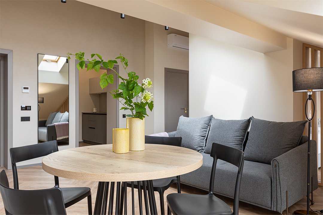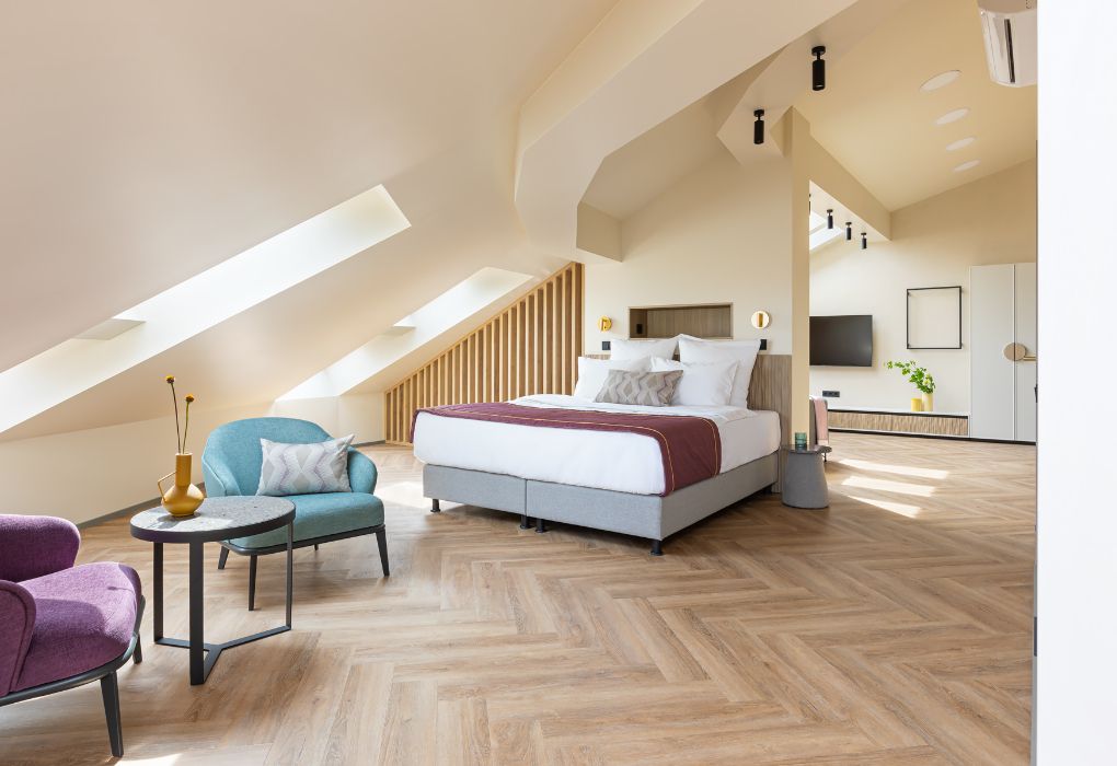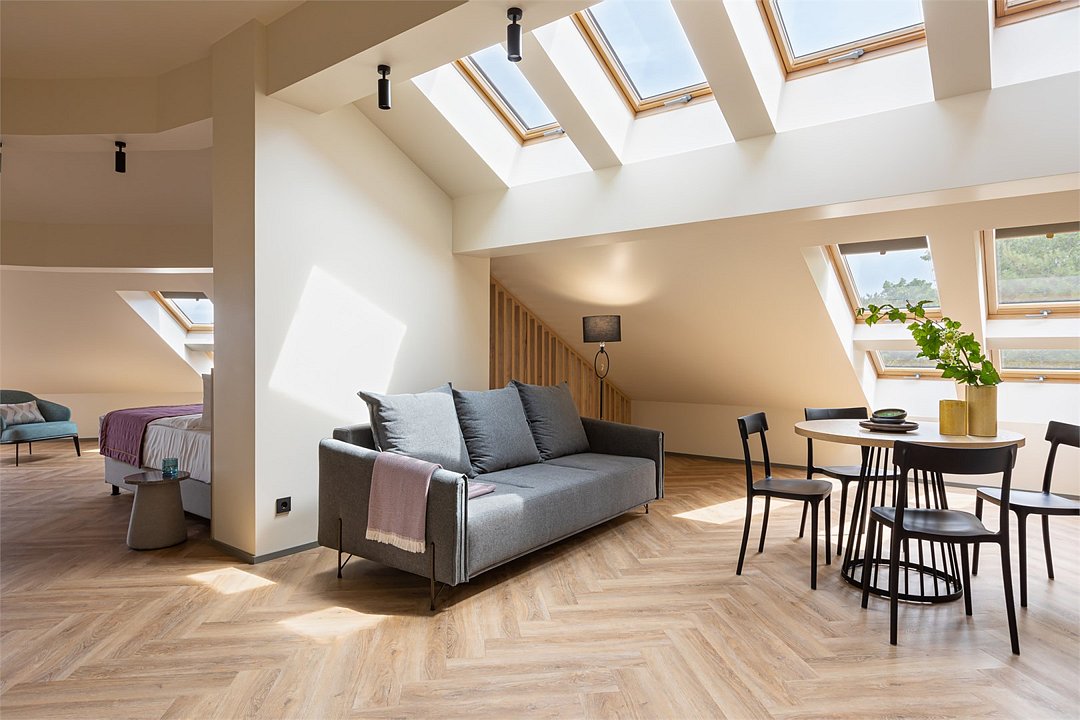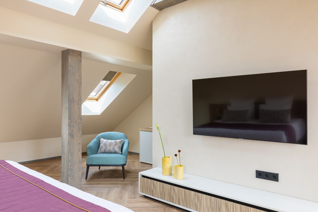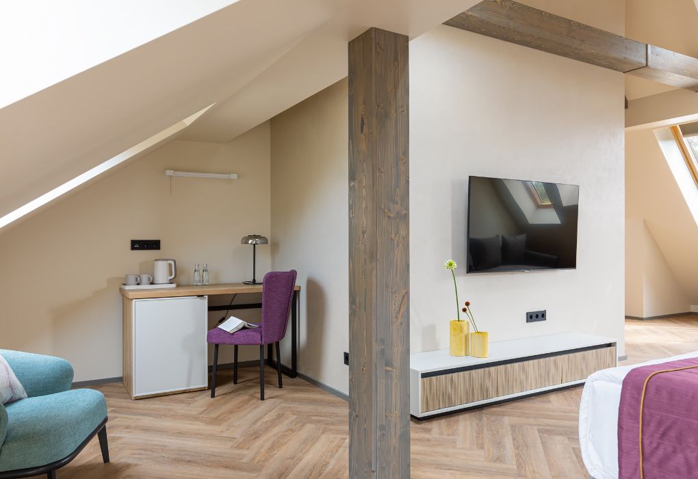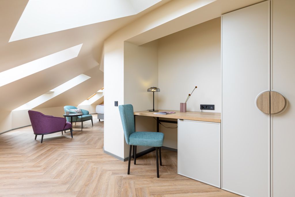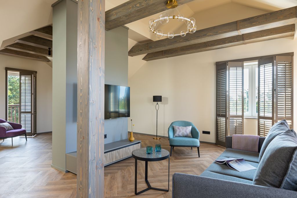 Стильный номер на мансардном этаже предлагает широкий простор (площадь номера 67 кв метров) и комфорт, чтобы удовлетворить все Ваши потребности во время пребывания. В спальной зоне располагается два кресла и журнальный столик, эргономичное рабочее место, а так же удобная двуспальная кровать, обеспечивающая отличный отдых и приятный сон. В гостиной есть небольшая кухня, комфортный диван и обеденная зона. В любое время здесь можно расслабиться, выпить вкусный кофе, посмотреть телевизор и провести время с семьёй или друзьями.Услуги и удобства