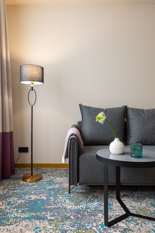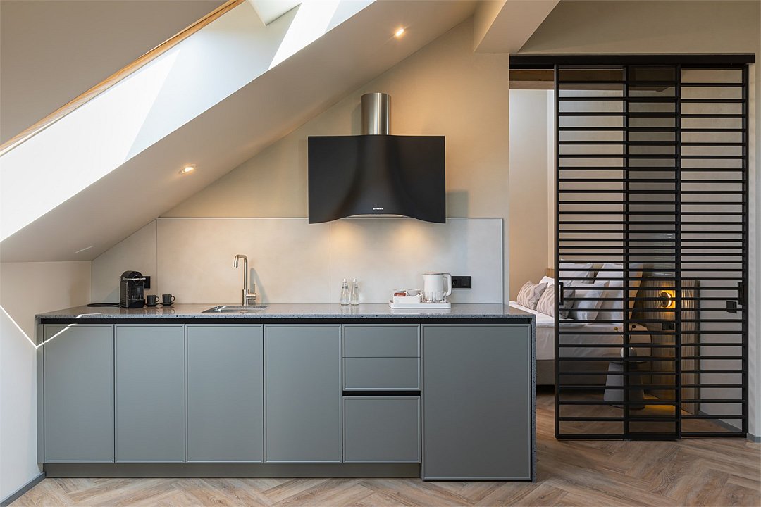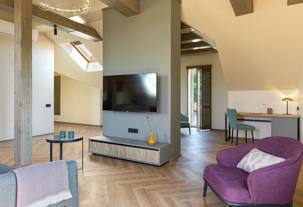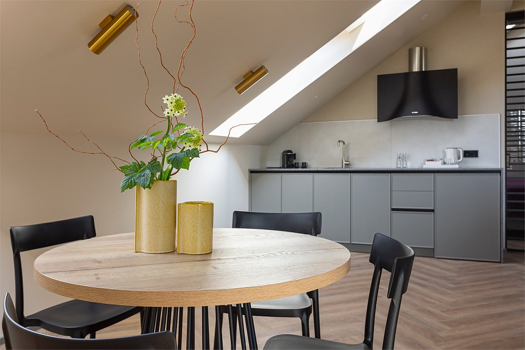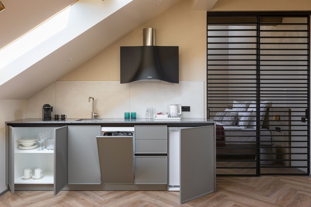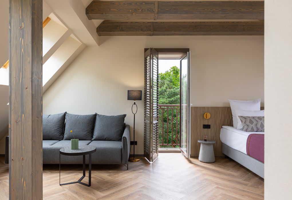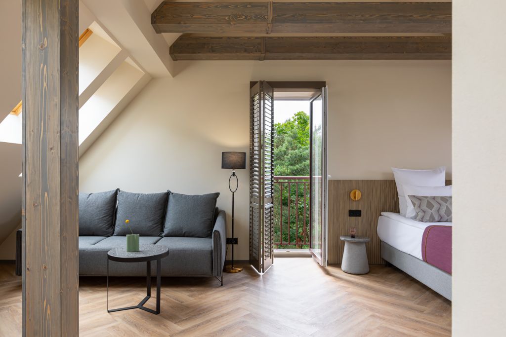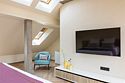 Стильный номер на мансардном этаже предлагает широкий простор (площадь номера 67 кв метров) и комфорт, чтобы удовлетворить все Ваши потребности во время пребывания. В спальной зоне располагается два кресла и журнальный столик, эргономичное рабочее место, а так же удобная двуспальная кровать, обеспечивающая отличный отдых и приятный сон. В гостиной есть небольшая кухня, комфортный диван и обеденная зона. В любое время здесь можно расслабиться, выпить вкусный кофе, посмотреть телевизор и провести время с семьёй или друзьями.Услуги и удобства