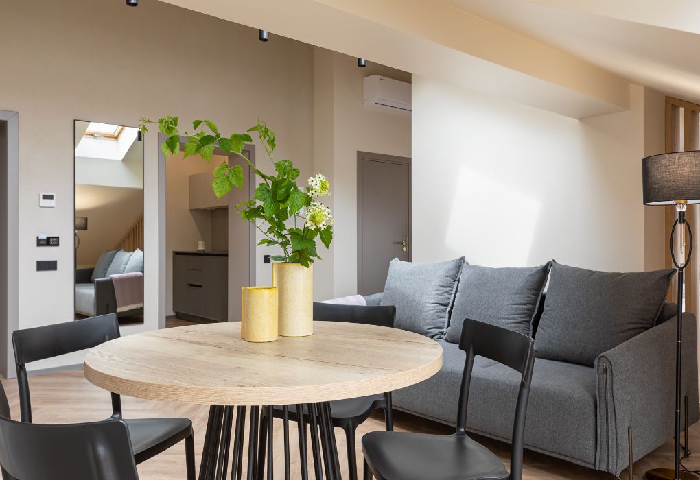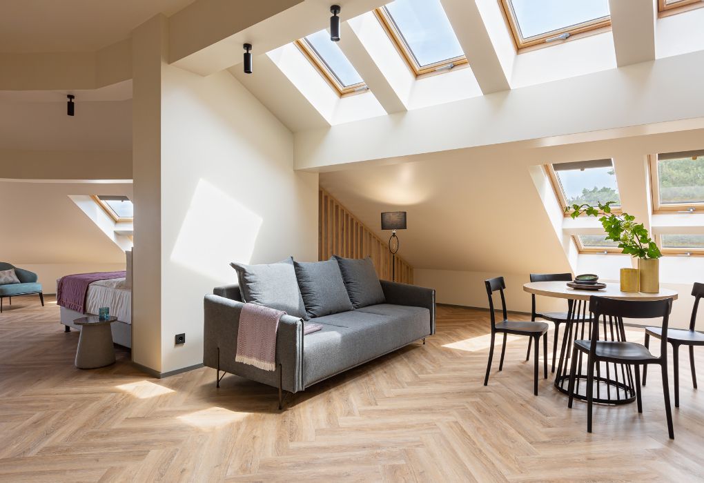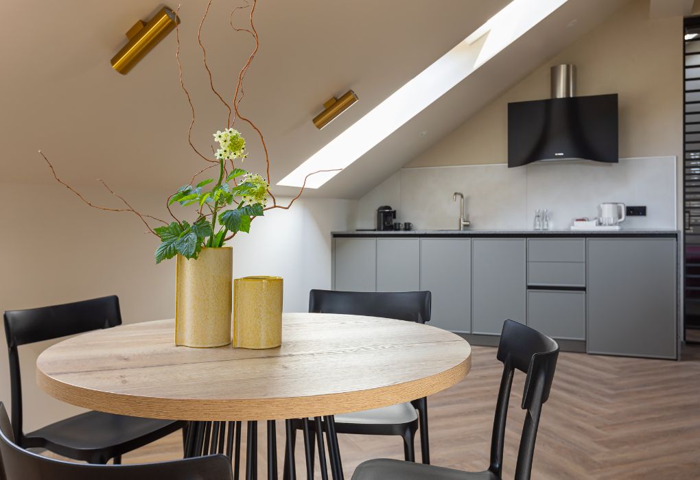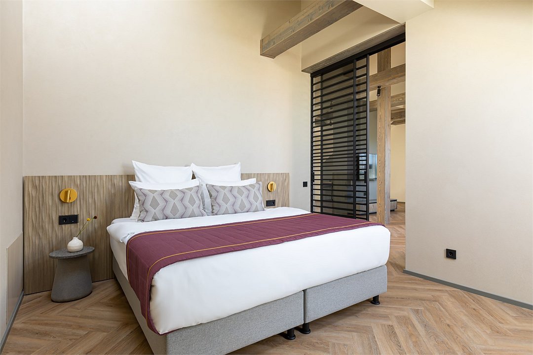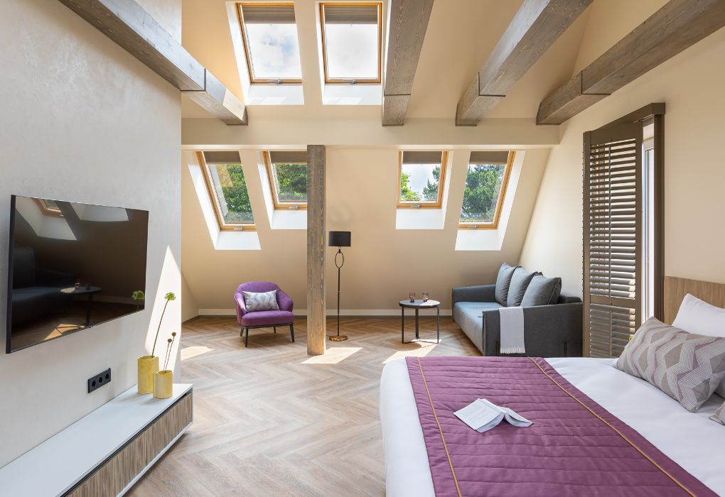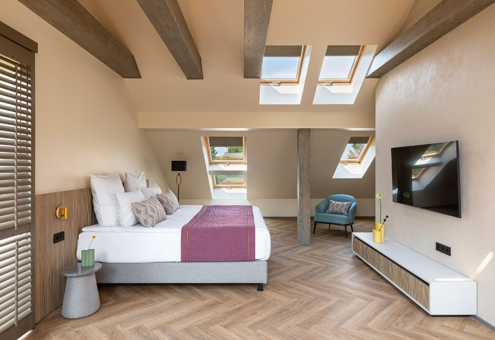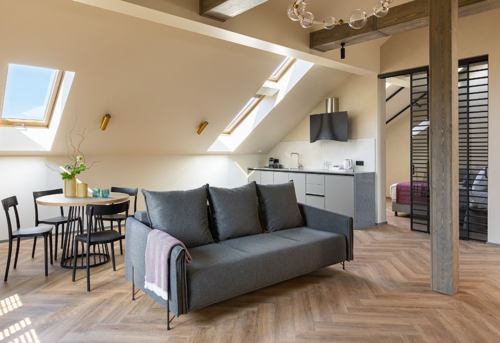 Стильный номер на мансардном этаже предлагает широкий простор (площадь номера 67 кв метров) и комфорт, чтобы удовлетворить все Ваши потребности во время пребывания. В спальной зоне располагается два кресла и журнальный столик, эргономичное рабочее место, а так же удобная двуспальная кровать, обеспечивающая отличный отдых и приятный сон. В гостиной есть небольшая кухня, комфортный диван и обеденная зона. В любое время здесь можно расслабиться, выпить вкусный кофе, посмотреть телевизор и провести время с семьёй или друзьями.Услуги и удобства