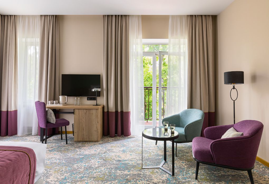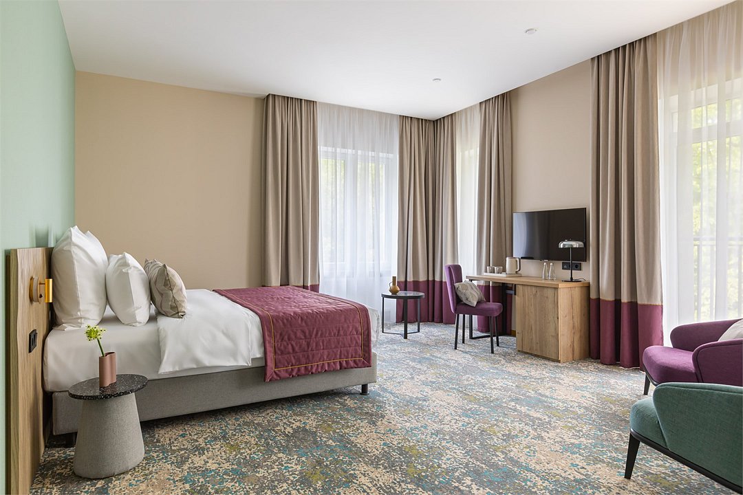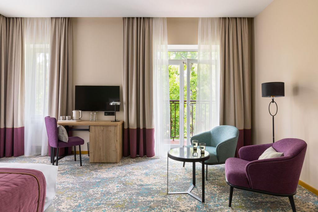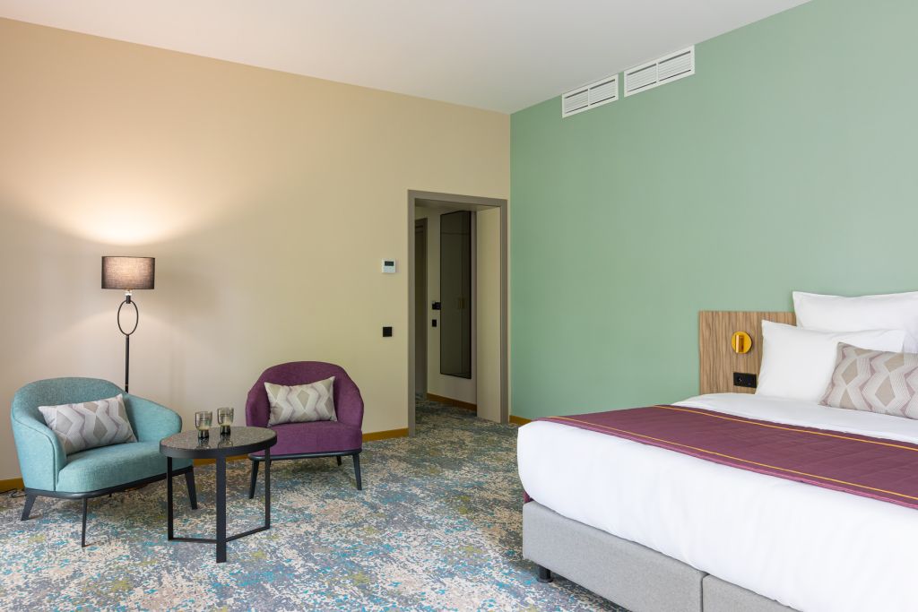 Роскошные номера для самых требовательных путешественников выполнены в превосходном стиле и оснащены по последнему слову техники. Люксы состоят из двух изолированных комнат: большой уютной спальни и гостиной с диваном и эргономичной рабочей зоной. По вечерам можно принять ванну и расслабиться, а после, закутавшись в банный халат отдохнуть у телевизора или поработать с ноутбуком.Услуги и удобства