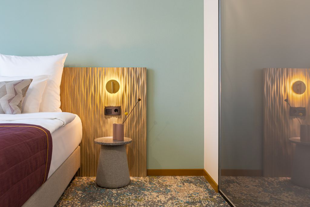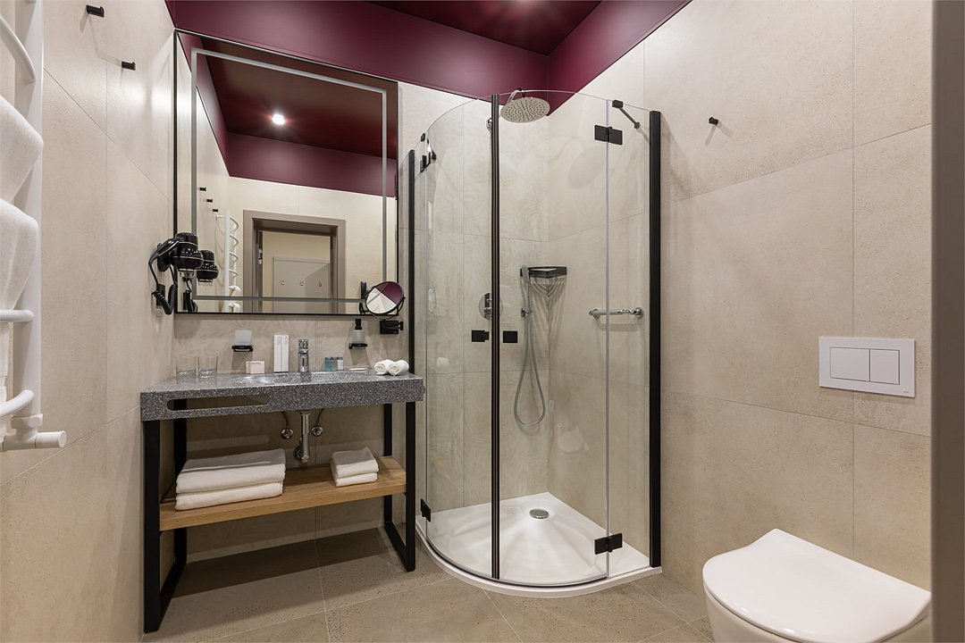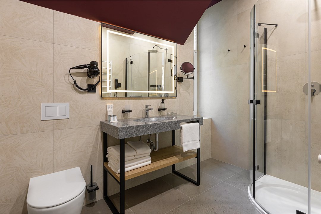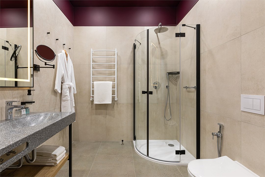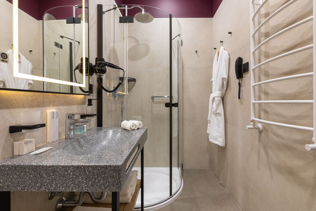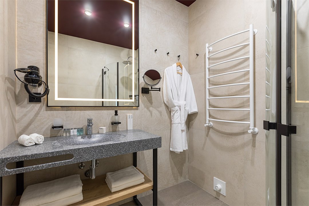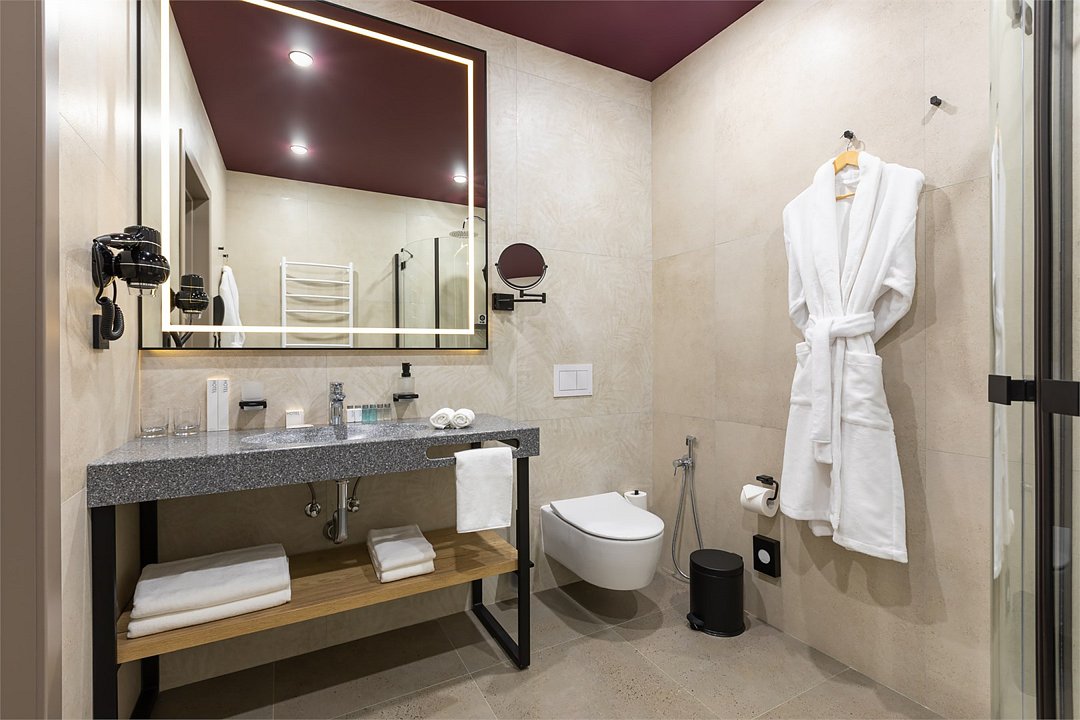 В дизайнерских номерах Стандарт есть все необходимое для комфортного пребывания и спокойного сна: двуспальная кровать с французским постельным бельём из мягкого хлопка, шторы блэкаут, рабочий стол, мини-бар и чайный набор, ванная комната с полным набором ванных принадлежностей.Услуги и удобства