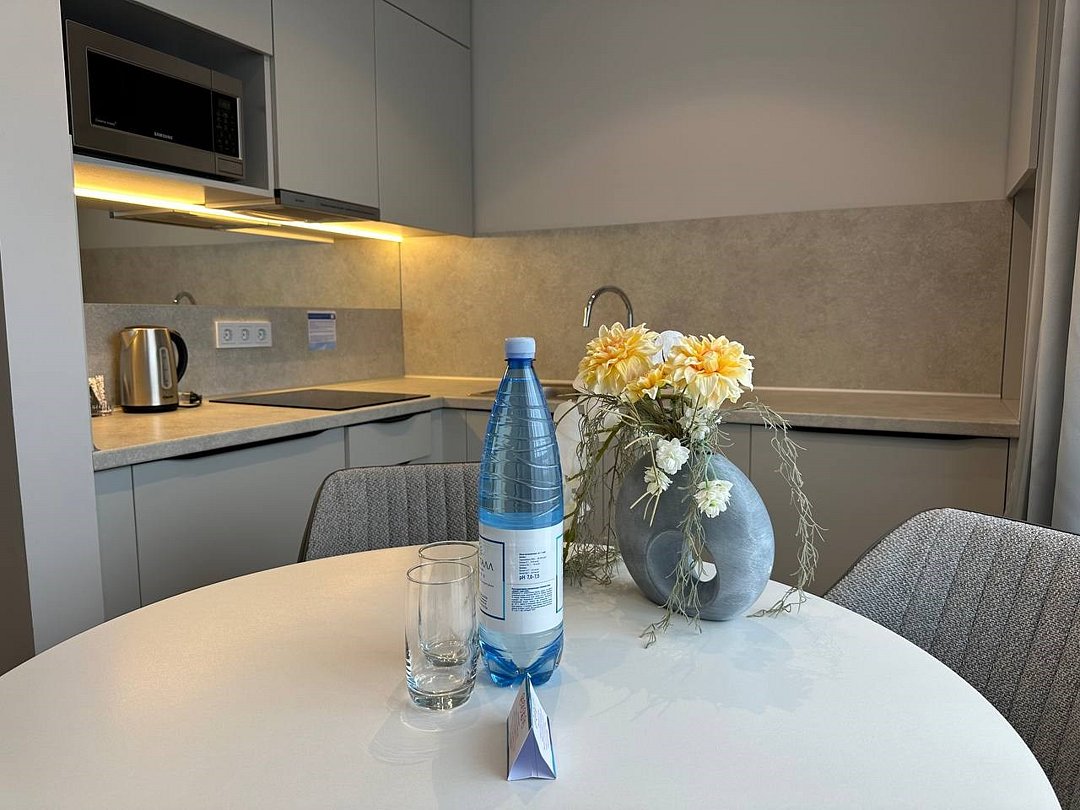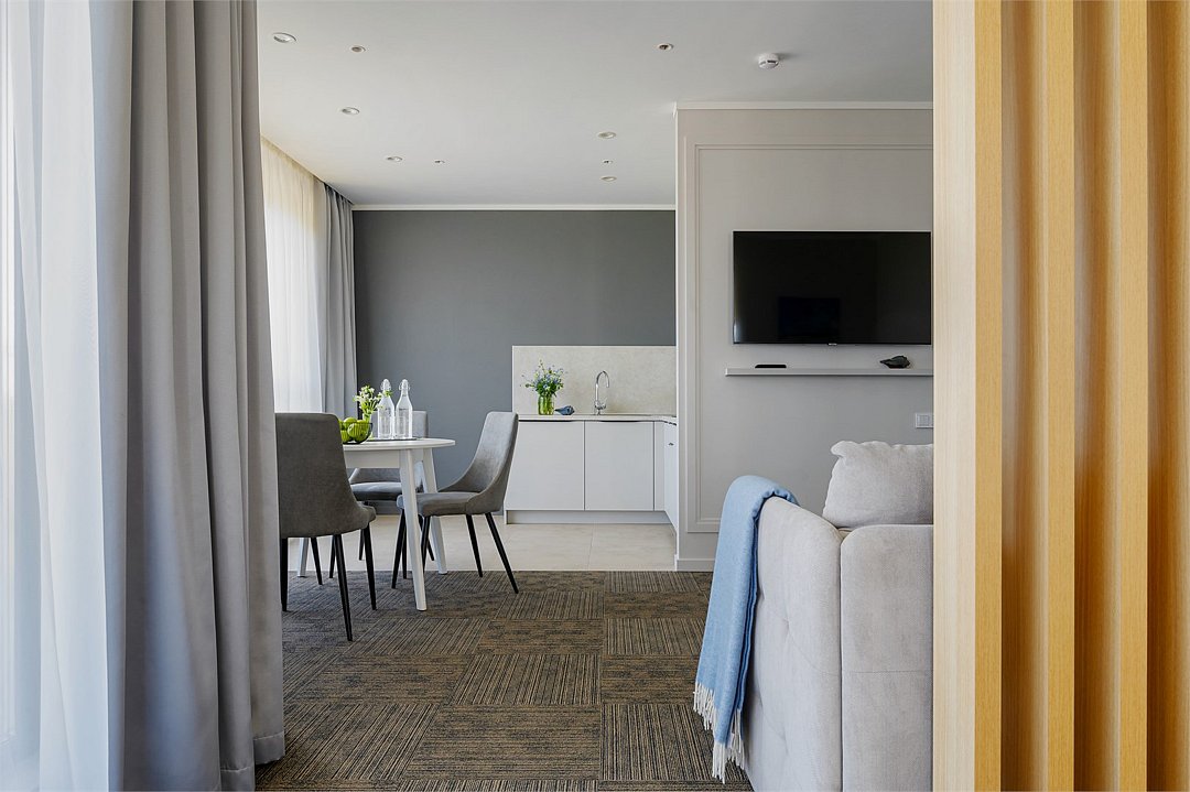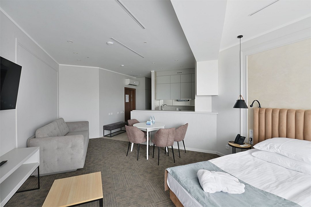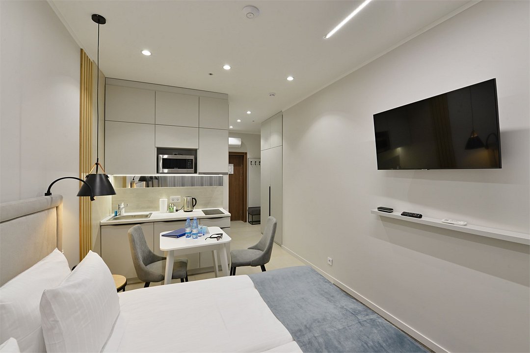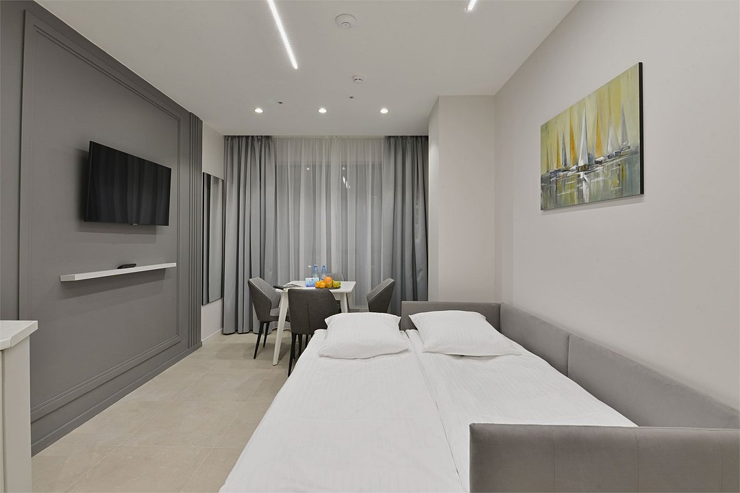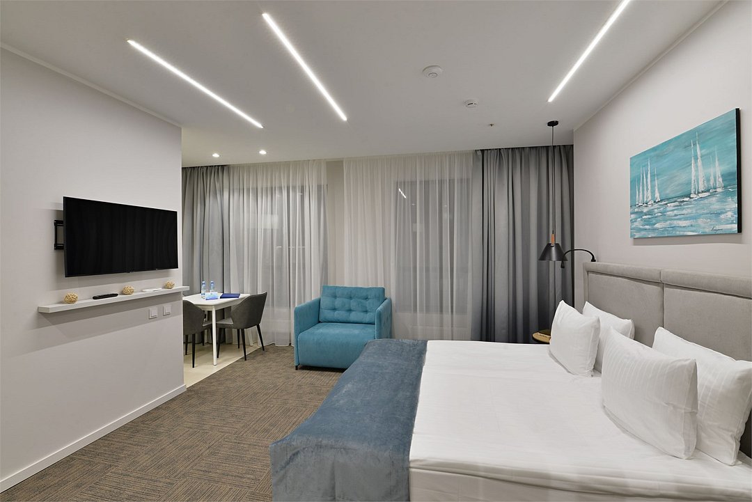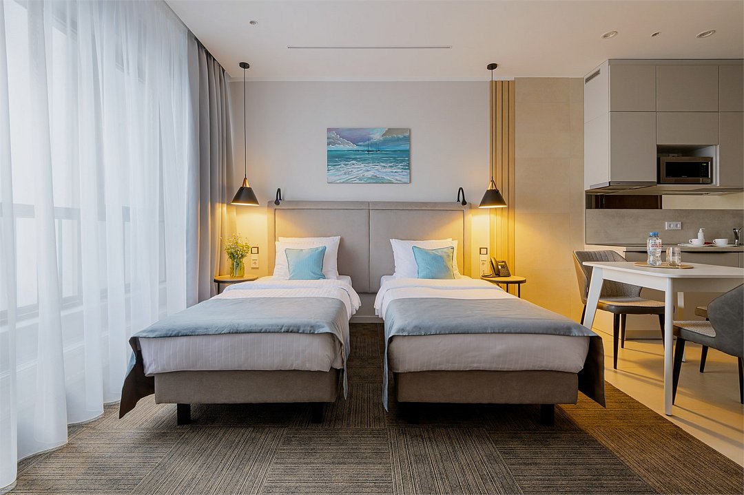 Просторные номера площадью 30-36 м², расположенные на третьем, четвёртом и пятом этажах отеля, рассчитаны на размещение до четырёх гостей. В большинстве номеров есть балкон с видом на город, парк или в сторону моря. В каждом номере — удобная кровать King size, мини-кухня и продуманная планировка. При необходимости в номере можно организовать дополнительное спальное место в виде дивана/диван-кровати или кресла-кровати.Услуги и удобства