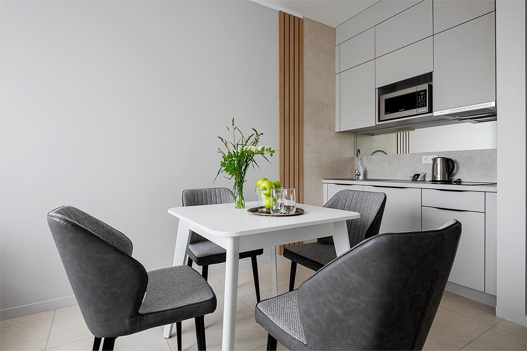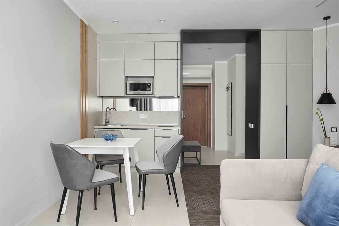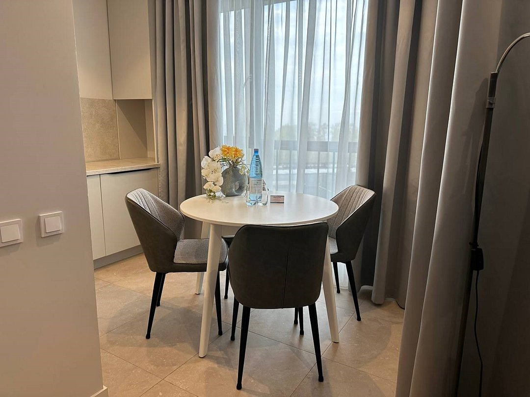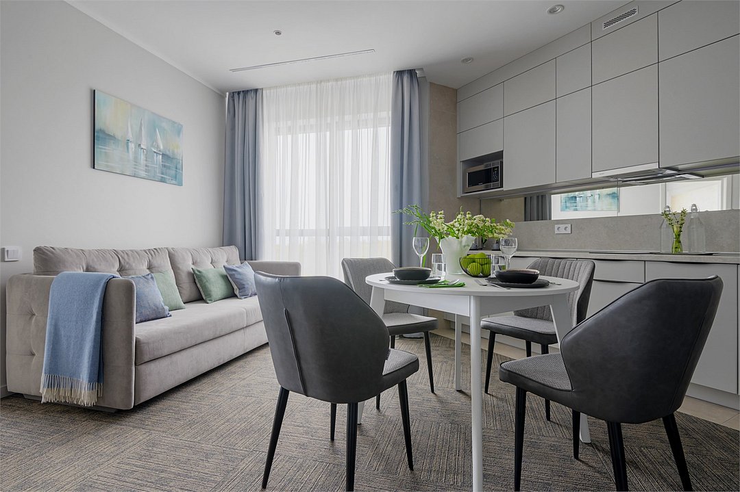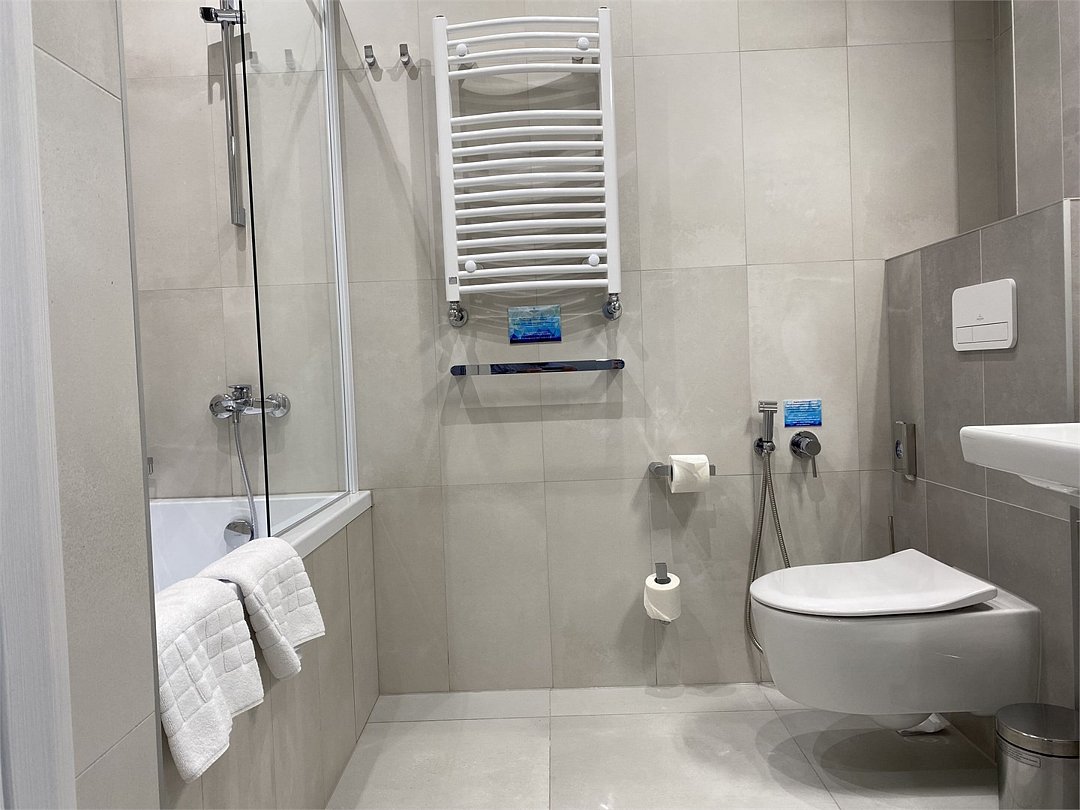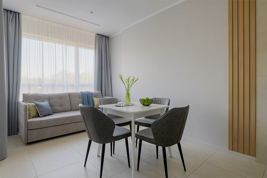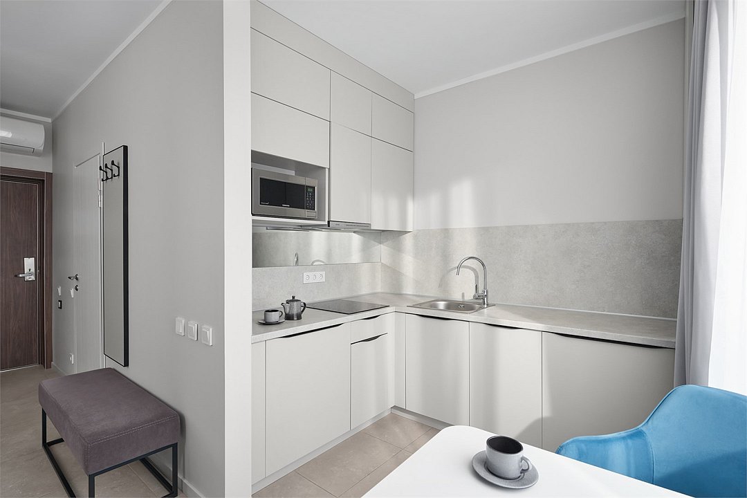 Просторные номера площадью 30-36 м², расположенные на третьем, четвёртом и пятом этажах отеля, рассчитаны на размещение до четырёх гостей. В большинстве номеров есть балкон с видом на город, парк или в сторону моря. В каждом номере — удобная кровать King size, мини-кухня и продуманная планировка. При необходимости в номере можно организовать дополнительное спальное место в виде дивана/диван-кровати или кресла-кровати.Услуги и удобства