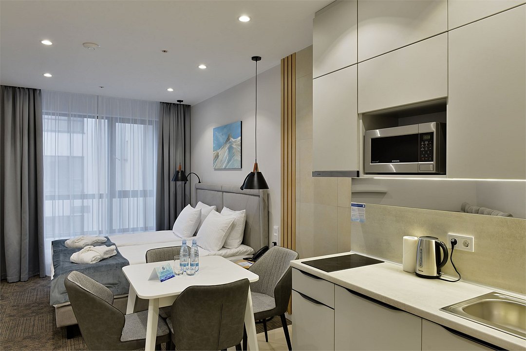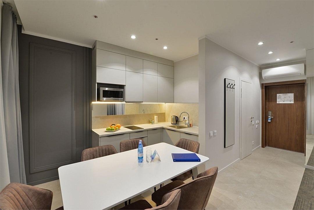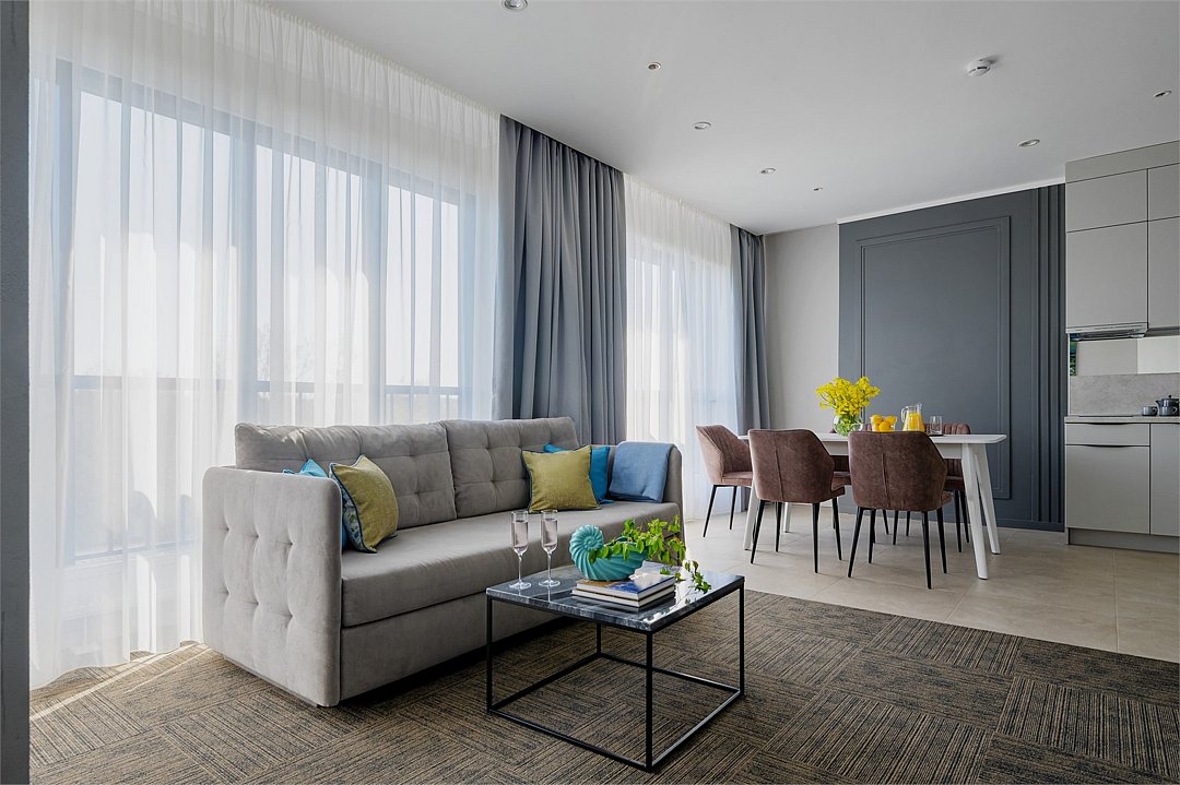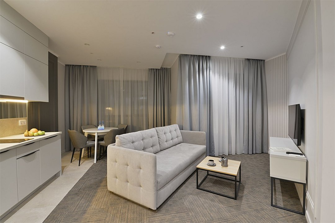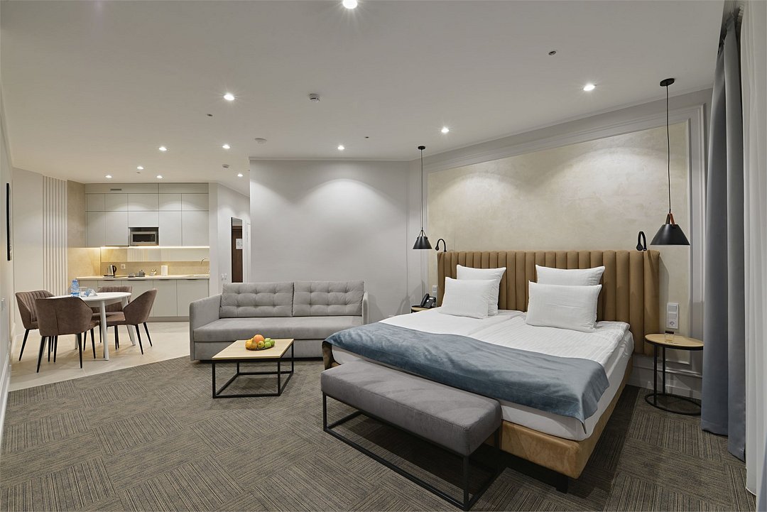 Самый просторный, четырехкомнатный номер отеля — 97 м², рассчитан на проживание до 9 гостей. В номере несколько спален с кроватями King size и Queen size, гостиная с дополнительными местами (диваны и кресла-кровати), 2 санузла, рабочие столы, мини-кухня и обеденная зона. Здесь пространство продумано для большой компании: от отдельных спален до общей зоны, где каждый находит свой уголок для отдыха или общения.Услуги и удобства