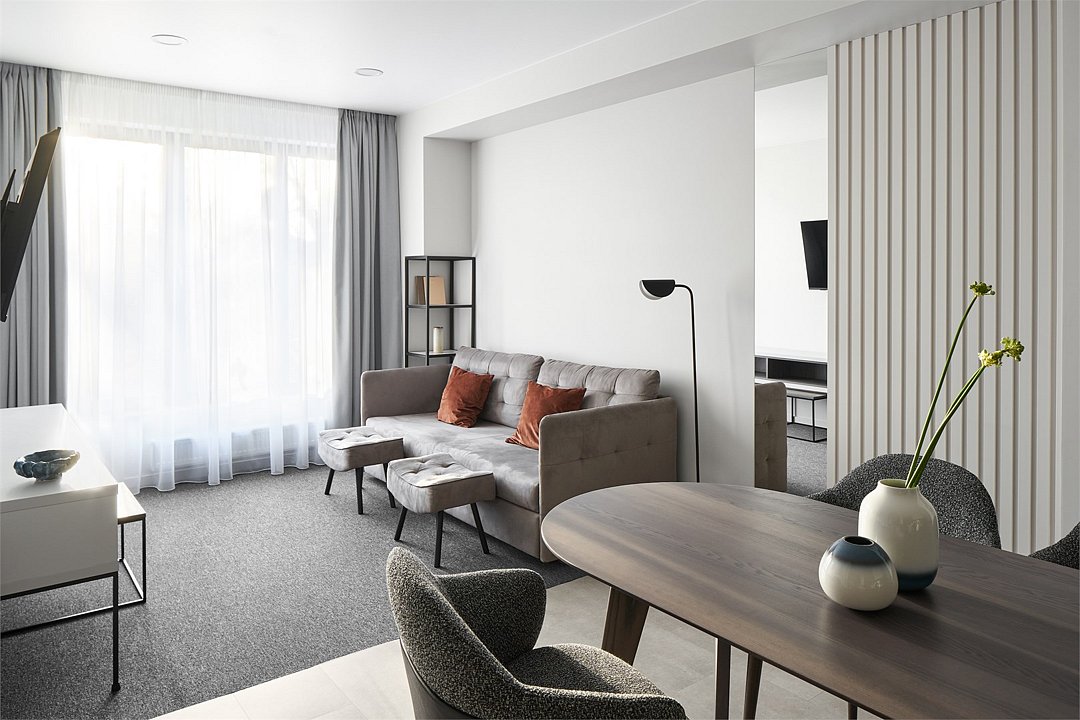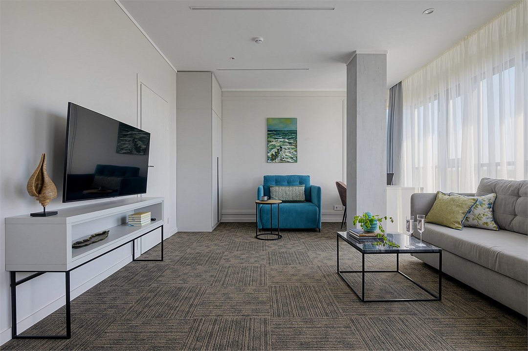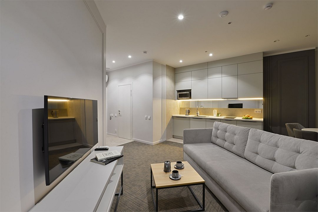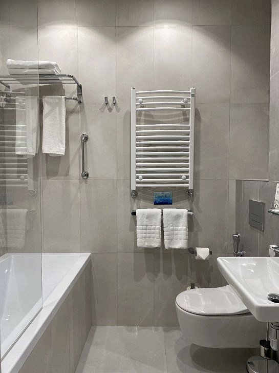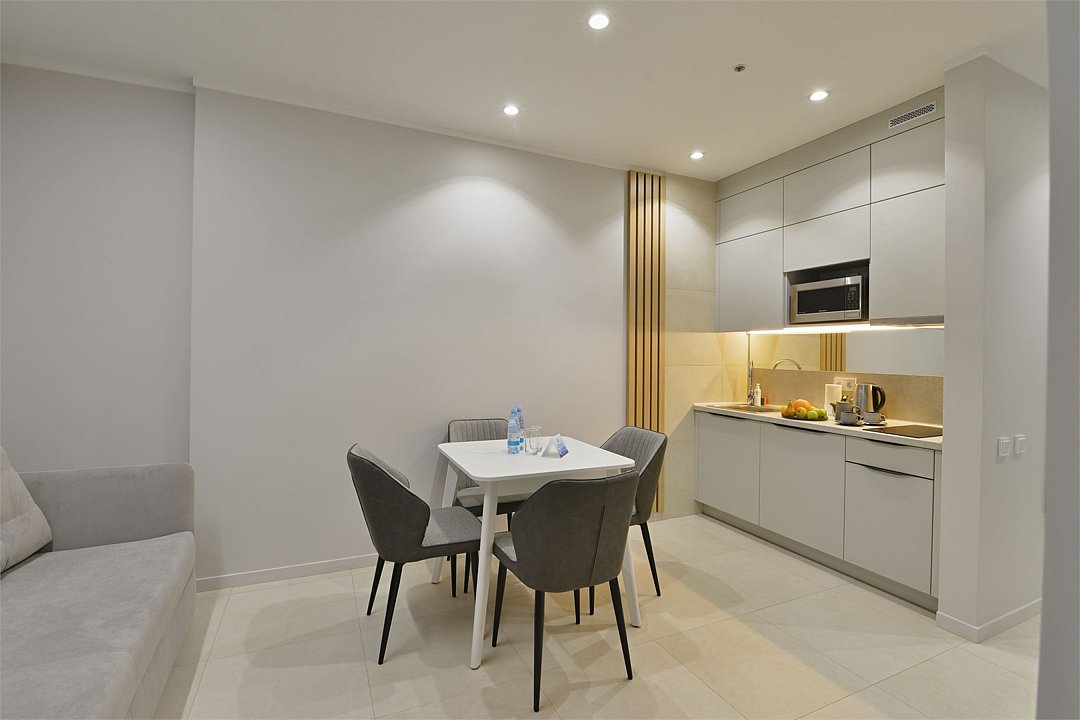 Самый просторный, четырехкомнатный номер отеля — 97 м², рассчитан на проживание до 9 гостей. В номере несколько спален с кроватями King size и Queen size, гостиная с дополнительными местами (диваны и кресла-кровати), 2 санузла, рабочие столы, мини-кухня и обеденная зона. Здесь пространство продумано для большой компании: от отдельных спален до общей зоны, где каждый находит свой уголок для отдыха или общения.Услуги и удобства