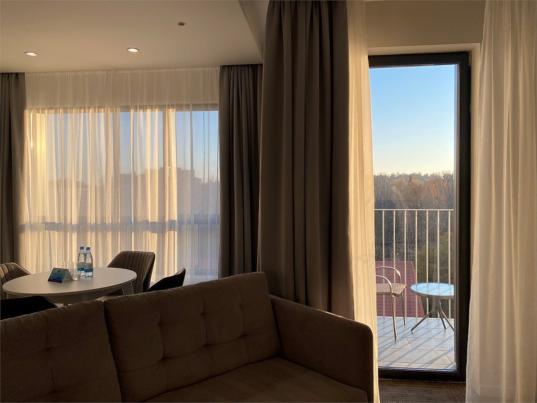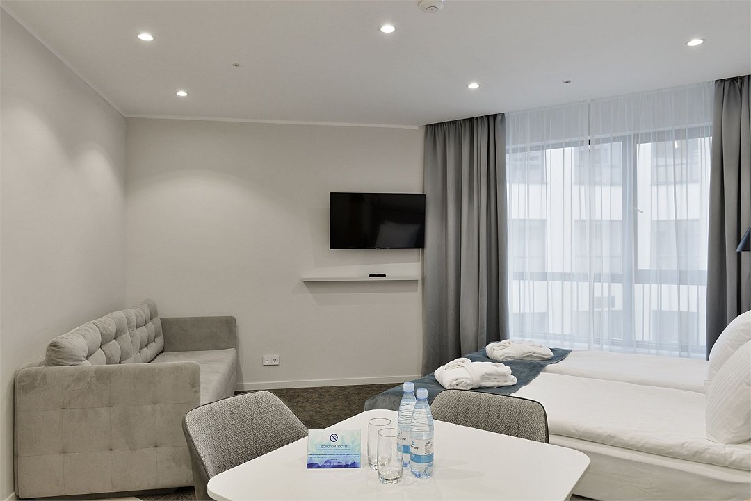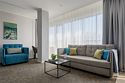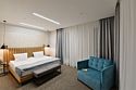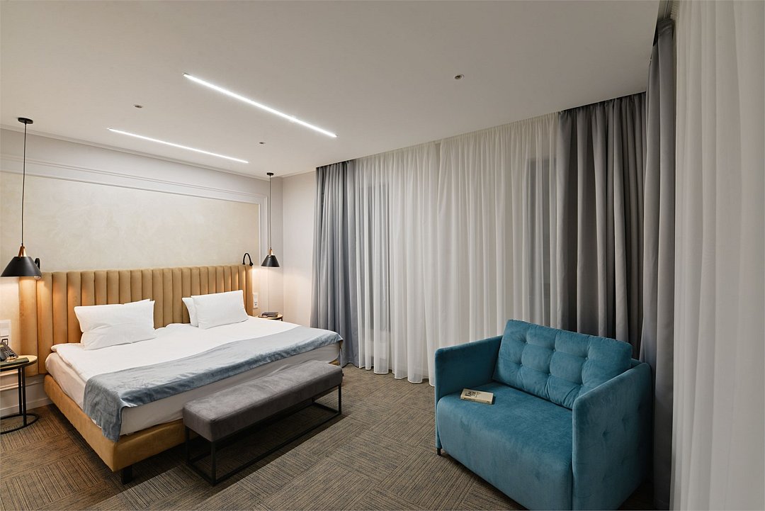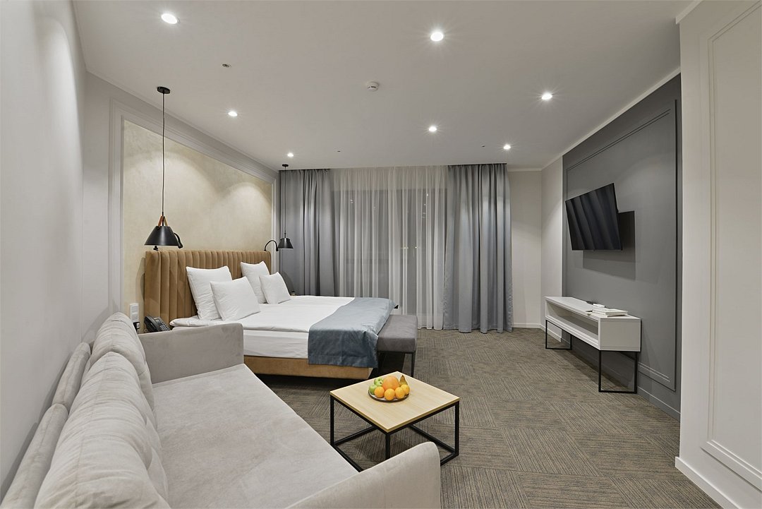 Двухкомнатные номера площадью 40м², расположенные на четвертом и шестом этажах отеля. Рассчитаны на размещение до четырех гостей: в спальне установлена кровать King size, в гостиной — диван-кровать. Каждый номер оборудован ванной комнатой, мини-кухней, обеденной зоной и балконом с видом на парк. Это удобный вариант для отдыха с близкими, предпочитающих дополнительное пространство и зонирование.Услуги и удобства