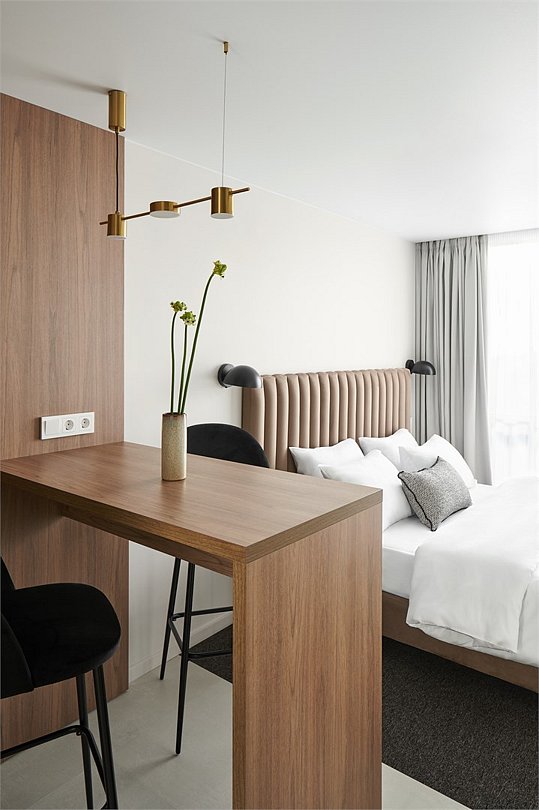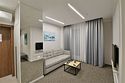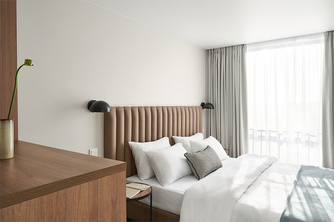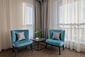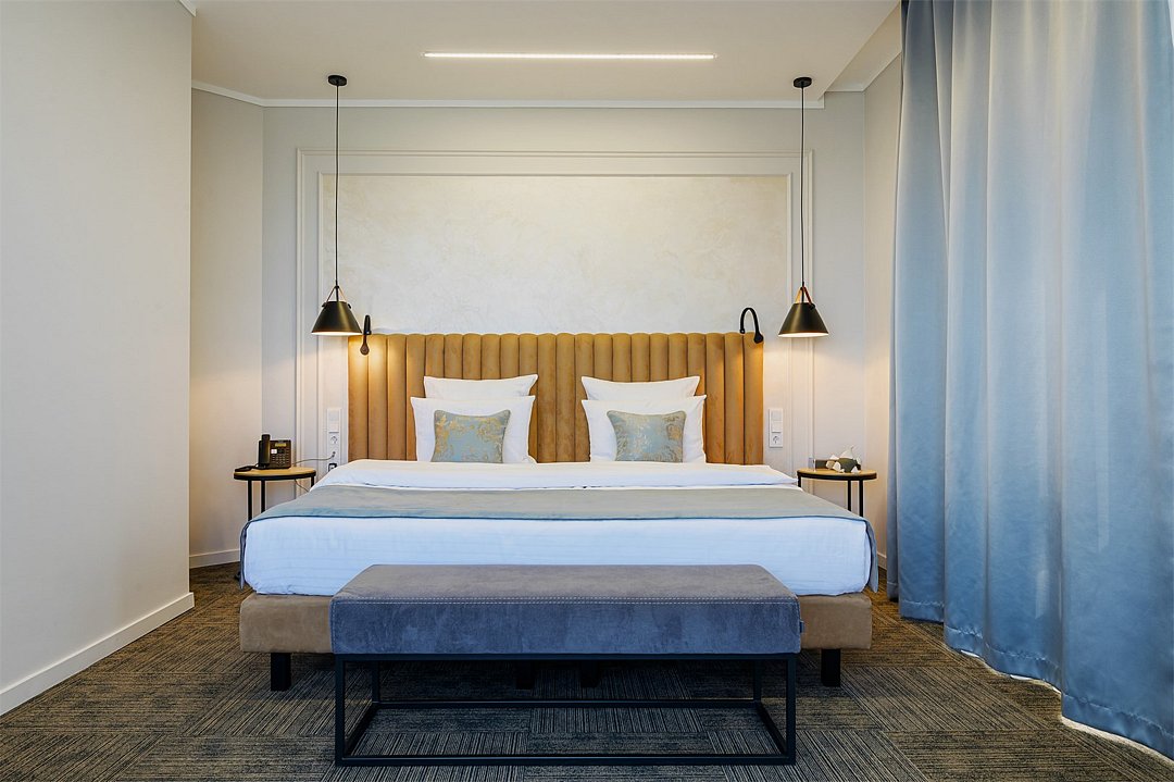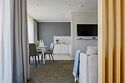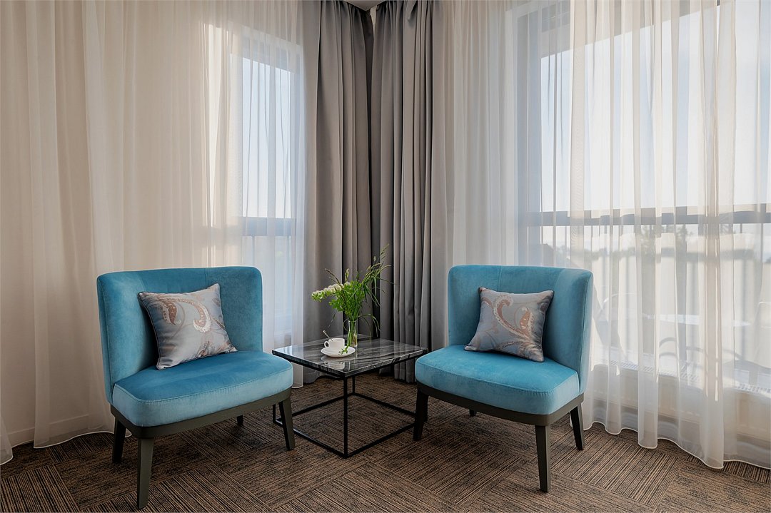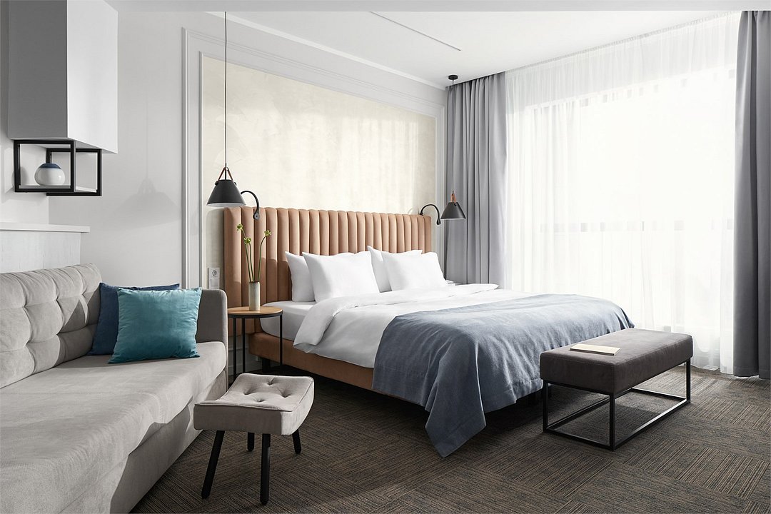 Двухкомнатные номера площадью 40м², расположенные на четвертом и шестом этажах отеля. Рассчитаны на размещение до четырех гостей: в спальне установлена кровать King size, в гостиной — диван-кровать. Каждый номер оборудован ванной комнатой, мини-кухней, обеденной зоной и балконом с видом на парк. Это удобный вариант для отдыха с близкими, предпочитающих дополнительное пространство и зонирование.Услуги и удобства
