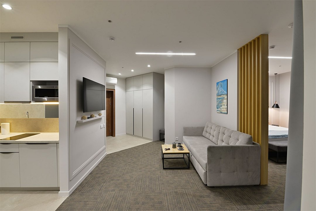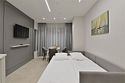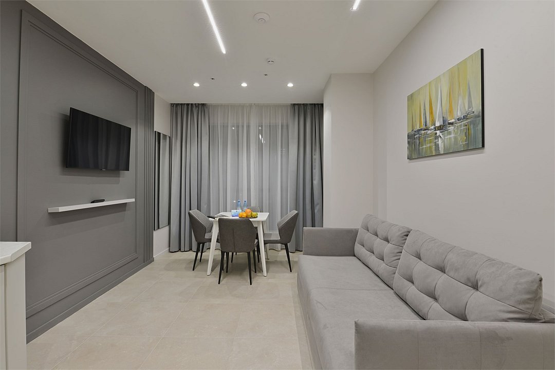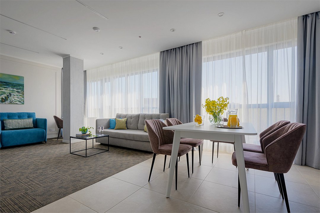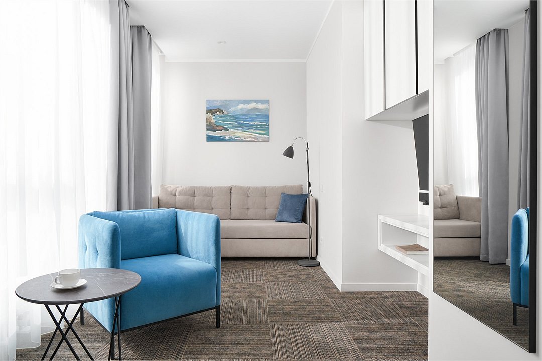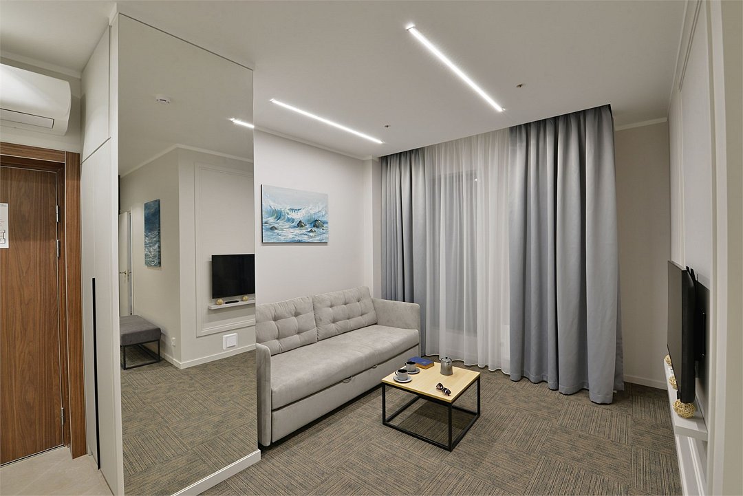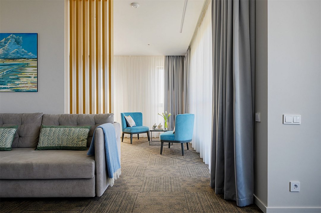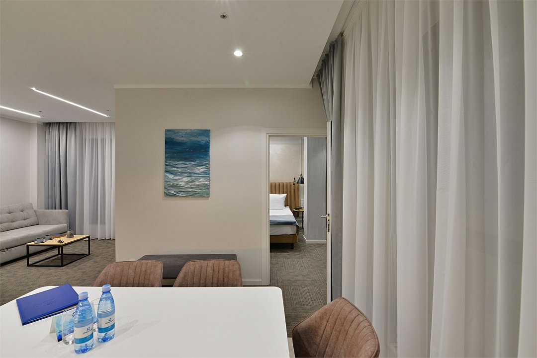 Просторные двухкомнатные номера площадью 45-55 м² с современным интерьером и функциональной планировкой. Рассчитаны на проживание до пяти человек. В спальне установлена кровать King size, в гостиной — дополнительные спальные места (диван-кровать, кресло-кровать). В большинстве номеров есть балкон с видом на город или в сторону моря. Оптимальный выбор для продолжительного отдыха всей семьей.Услуги и удобства