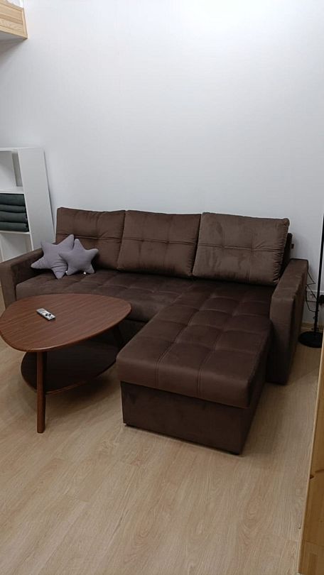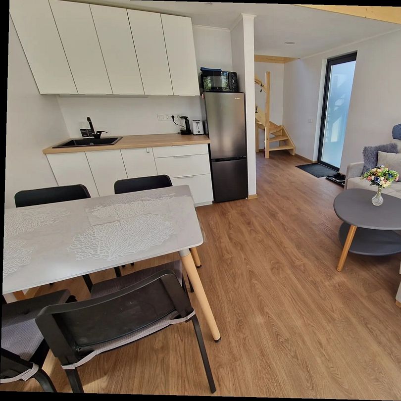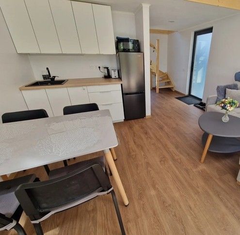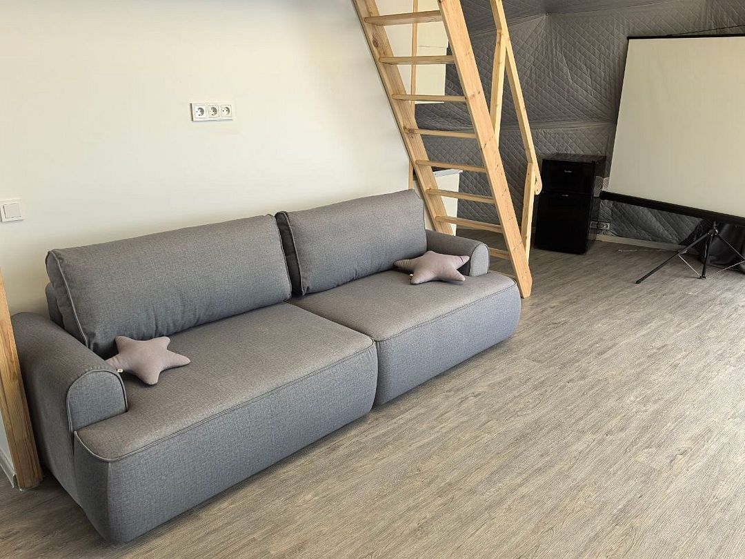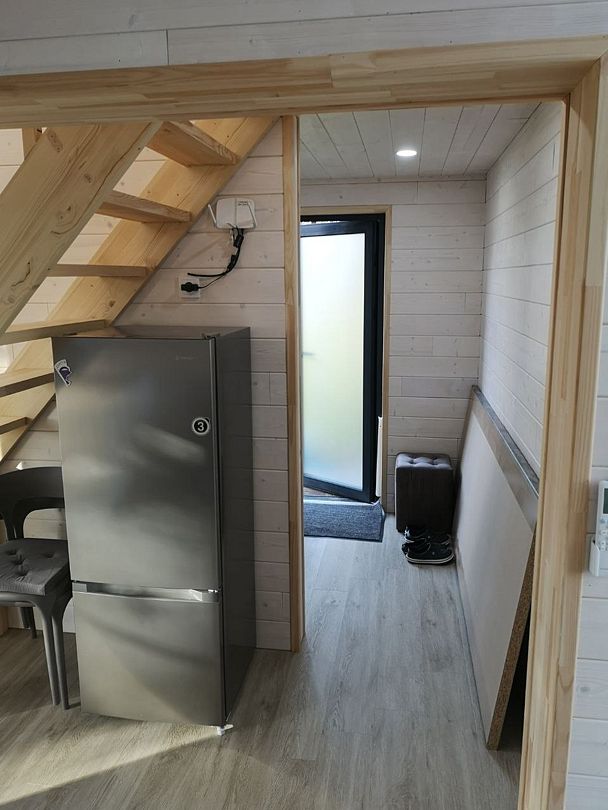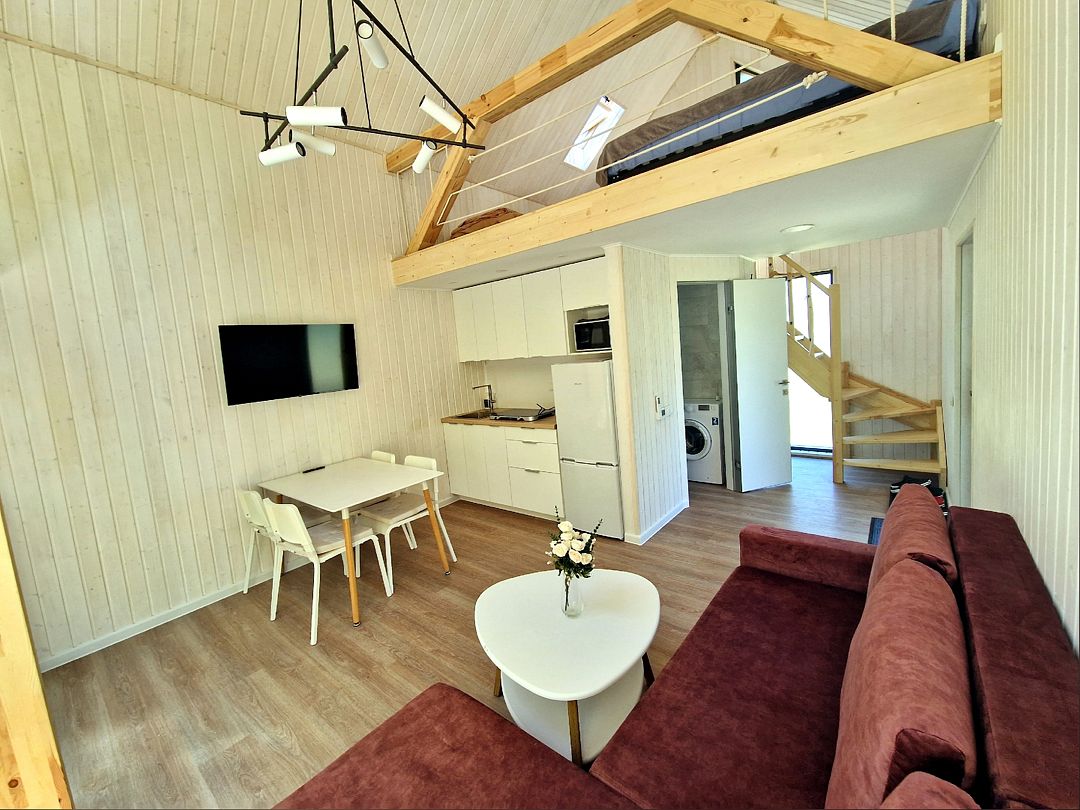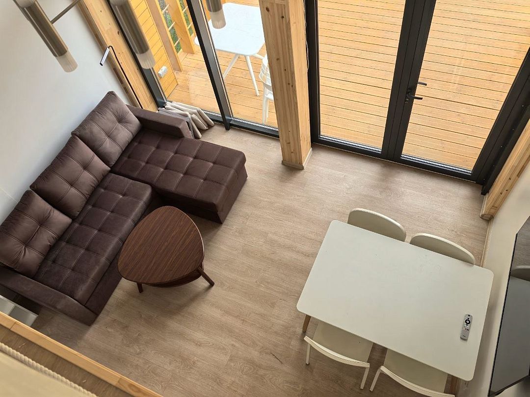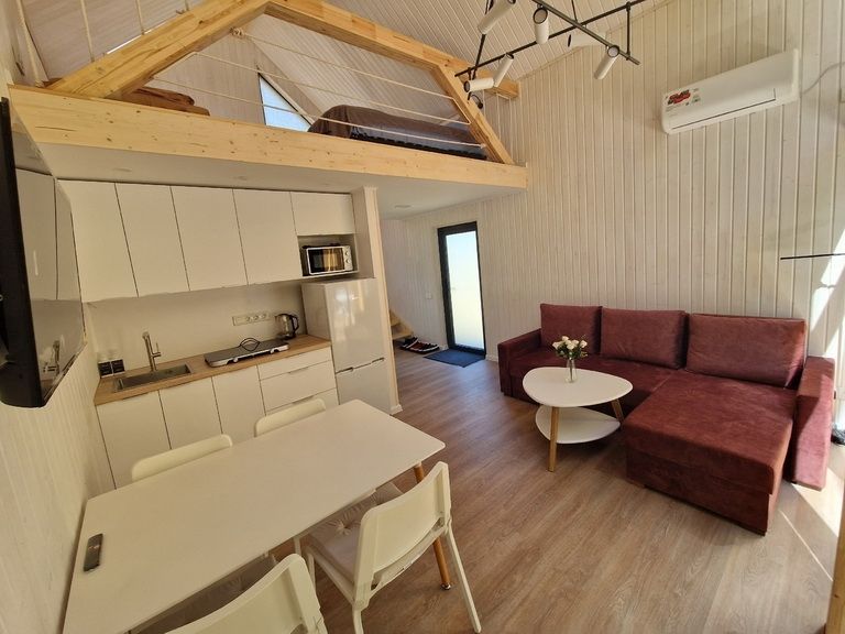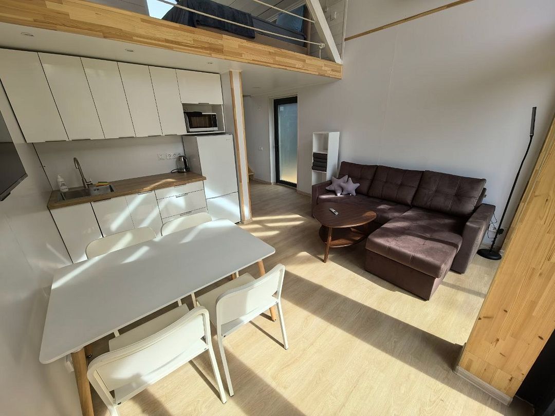 На первом этаже находится укомплектованная кухня (микроволновая печь, чайник, тостер, индукционная двухкомфорочная плитка, полноценный холодильник с морозильной камерой), обеденная зона для четырех гостей и телевизор с SmartTV. В гостевой зоне раскладывающийся диван (190х140 см), журнальный столик. Также есть кондиционер инверторного типа, подогрев полов и рулонные шторы блэкаут. Пользование Wi-Fi входит в стоимость проживания.