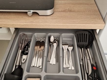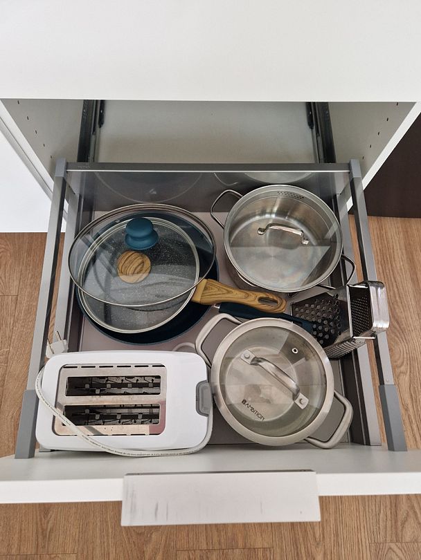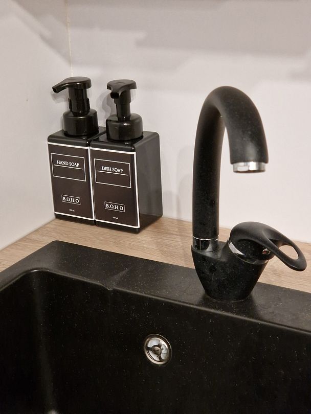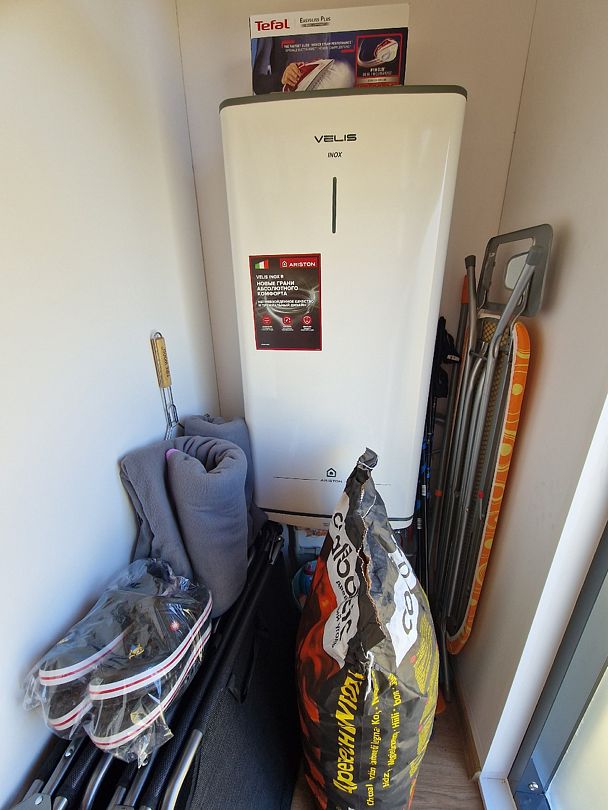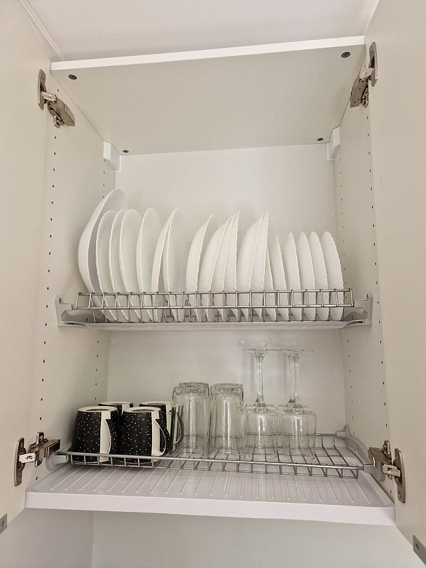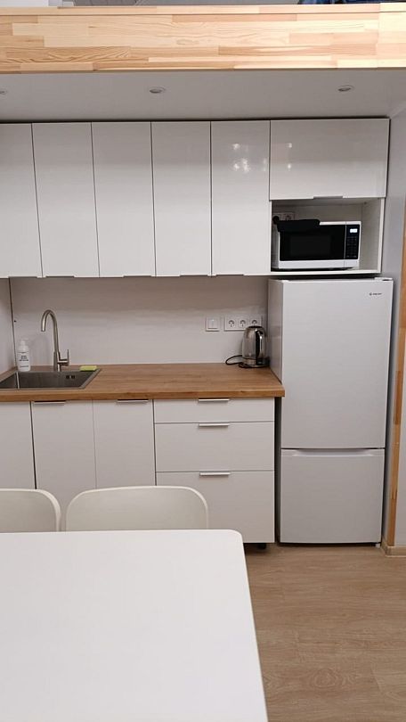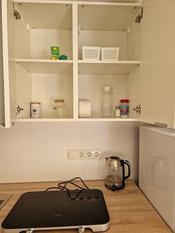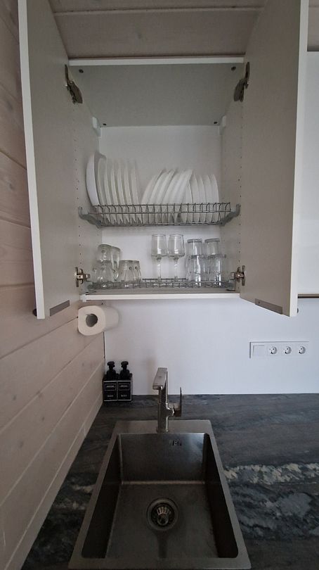 Кухня укомплектована всем необходимым. Газовая поверхность, вытяжка, холодильник с морозильной камерой, микроволновая печь, чайник, тостер, сэндвичница, миксер-блендер, штопор, бокалы, свет под шкафчиками, чай-кофе, необходимая кухонная утварь, средства для уборки, проточные фильтры. Газовый котел и собственный бойлер позволяют с помощью пульта устанавливать комфортную температуру воды и воздуха. Питьевая вода «Айсберг» (баллон 20 литров) входит в стоимость проживания.