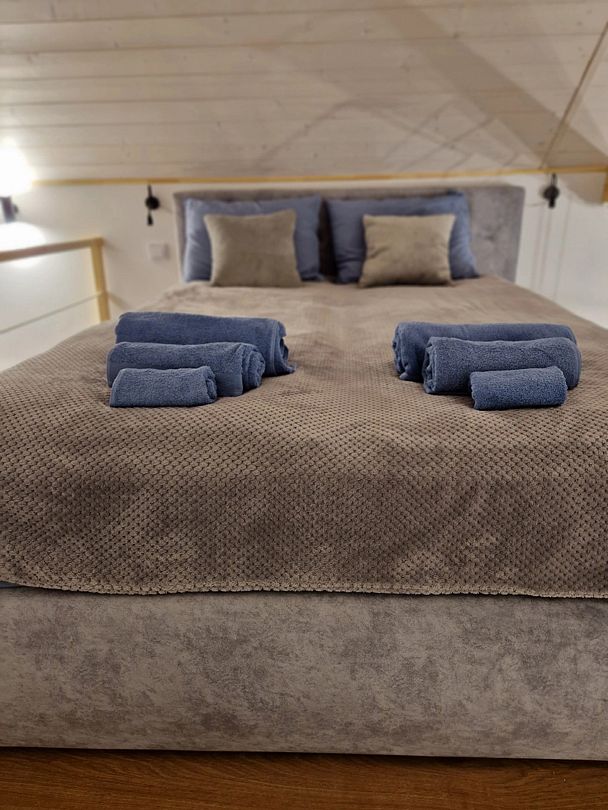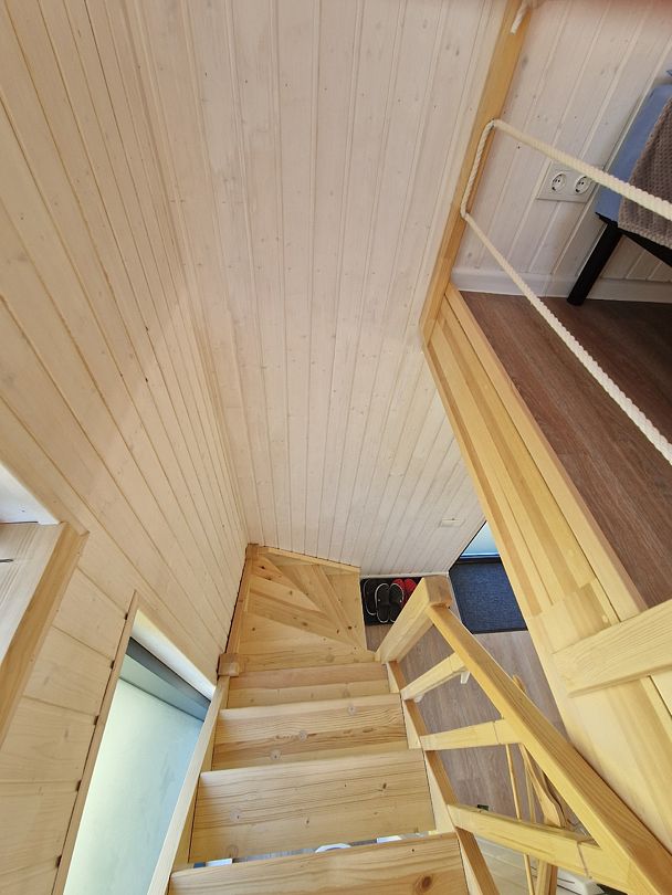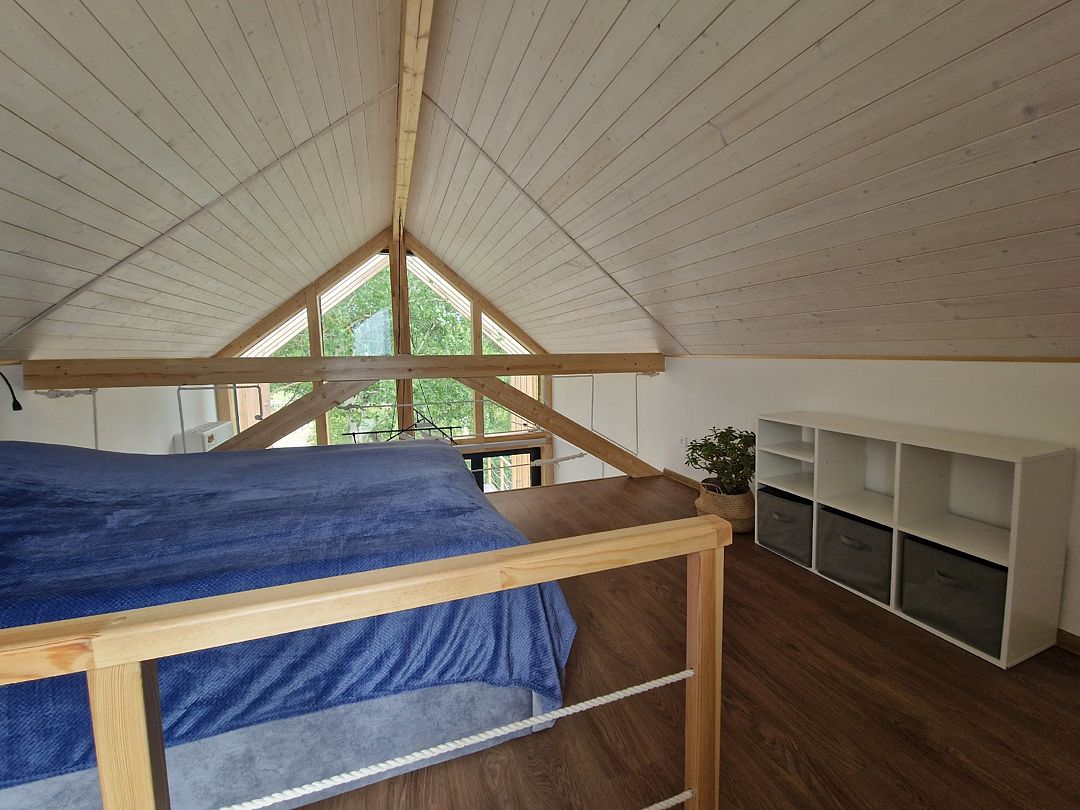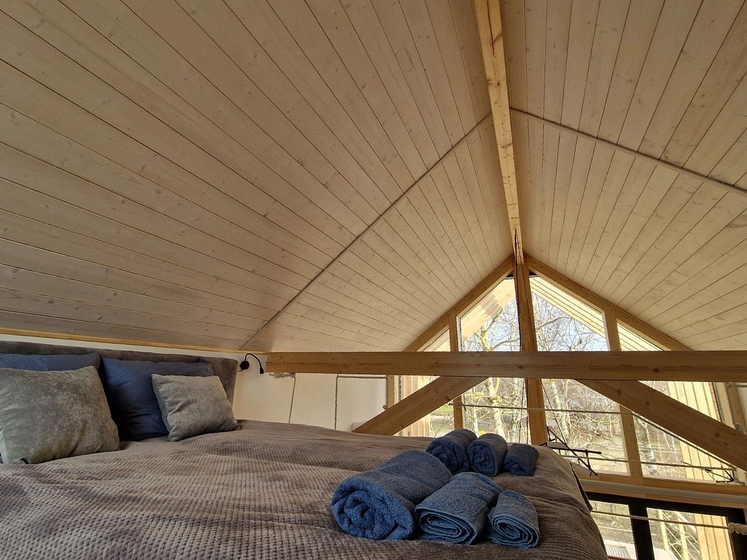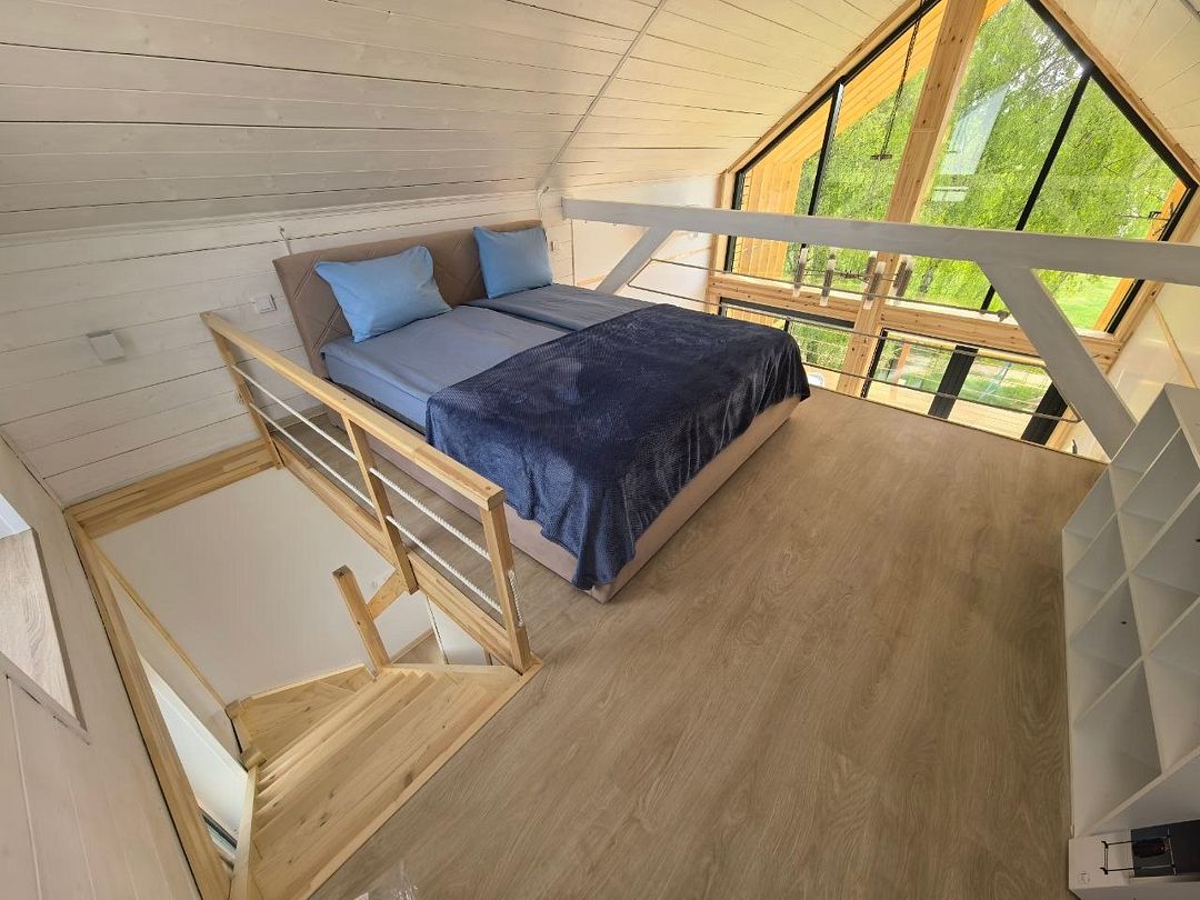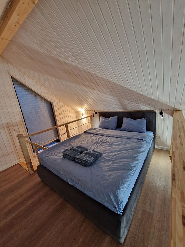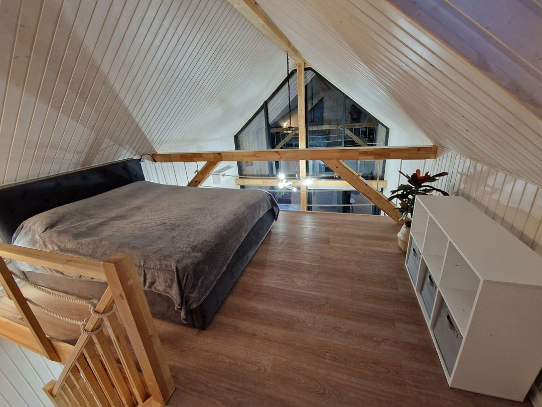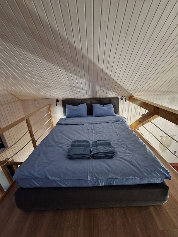 На втором ярусе, куда ведет удобная деревянная лестница, расположена видовая спальня с двуспальной кроватью (200 х 160 см), ортопедическим матрасом премиум-класса и постельным бельем из эко-хлопка, не требующего глажки. Есть стеллаж с коробами для хранения вещей, а также мансардное окно. Пользование Wi-Fi входит в стоимость проживания.