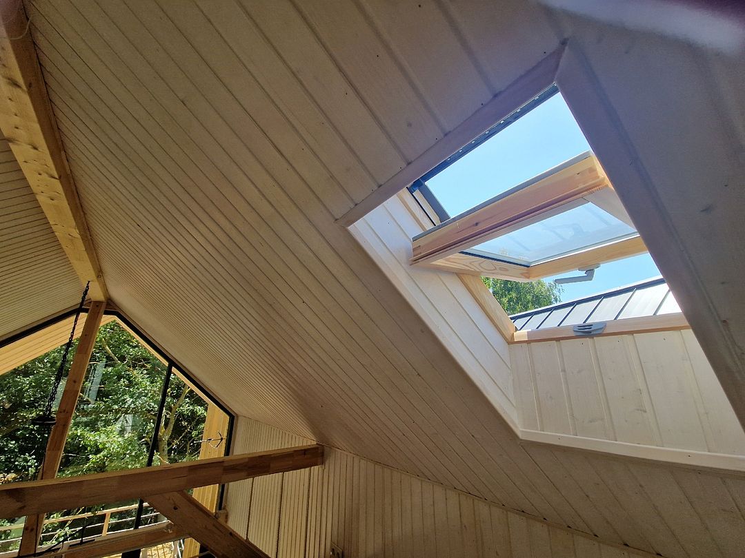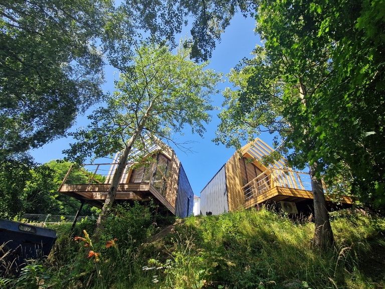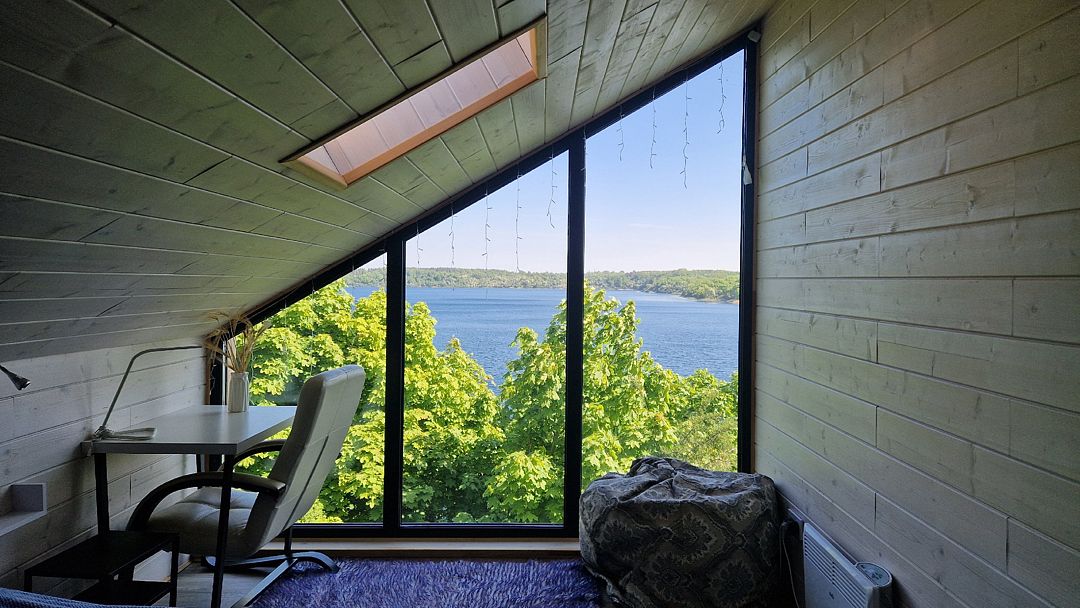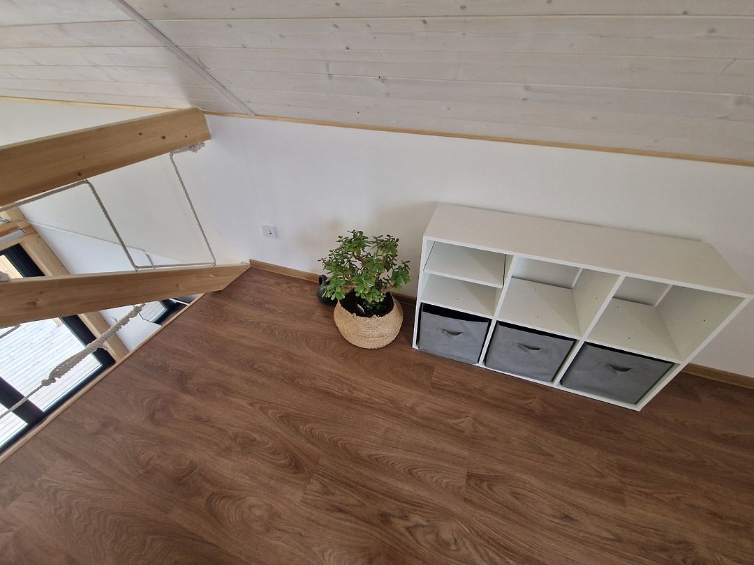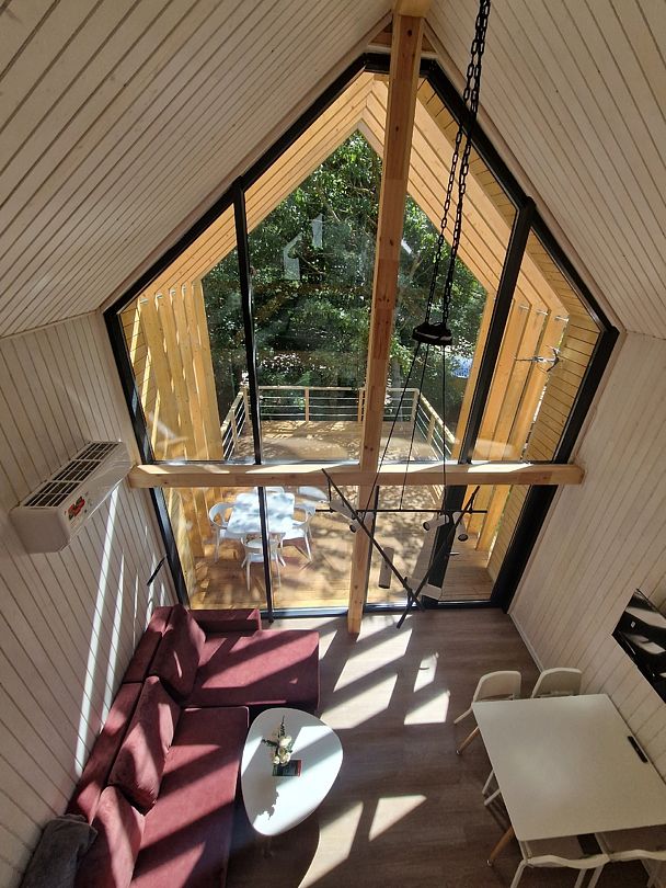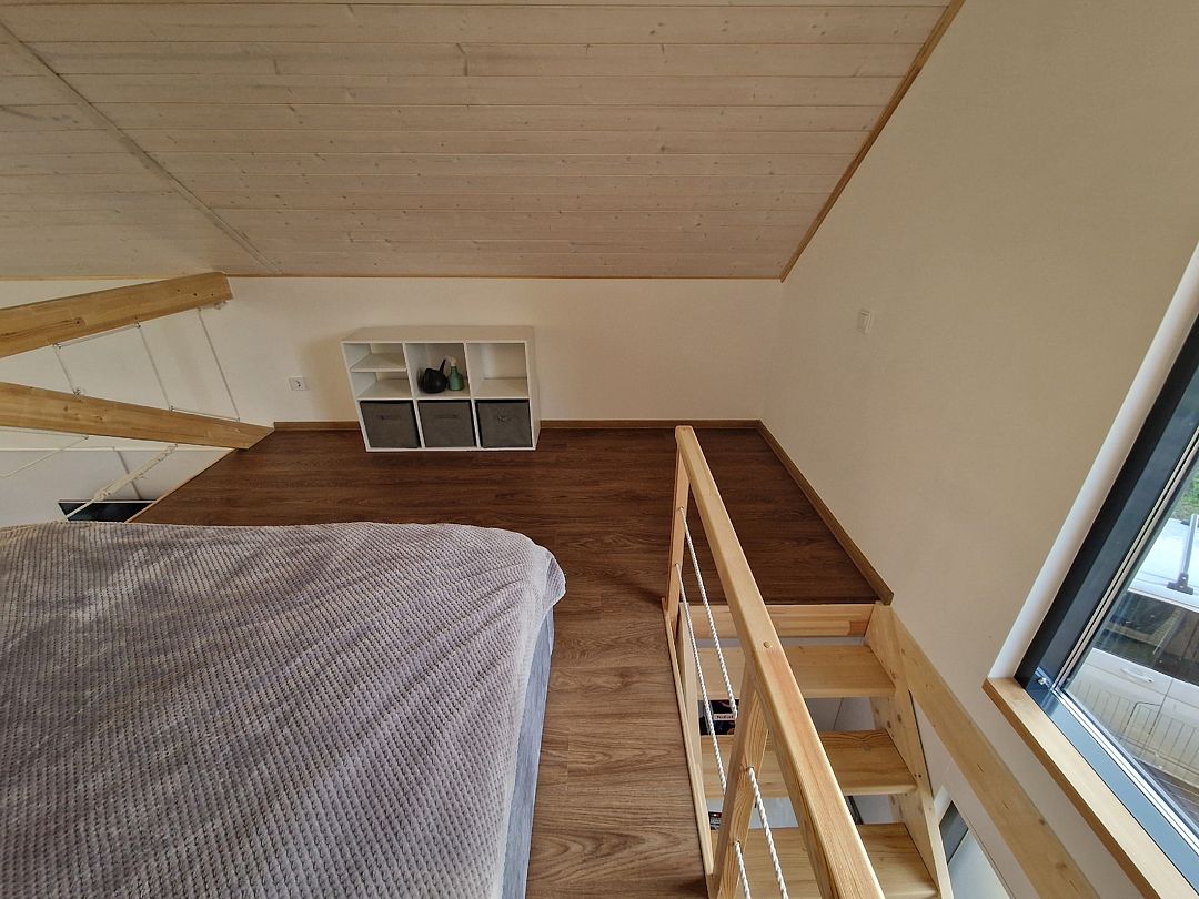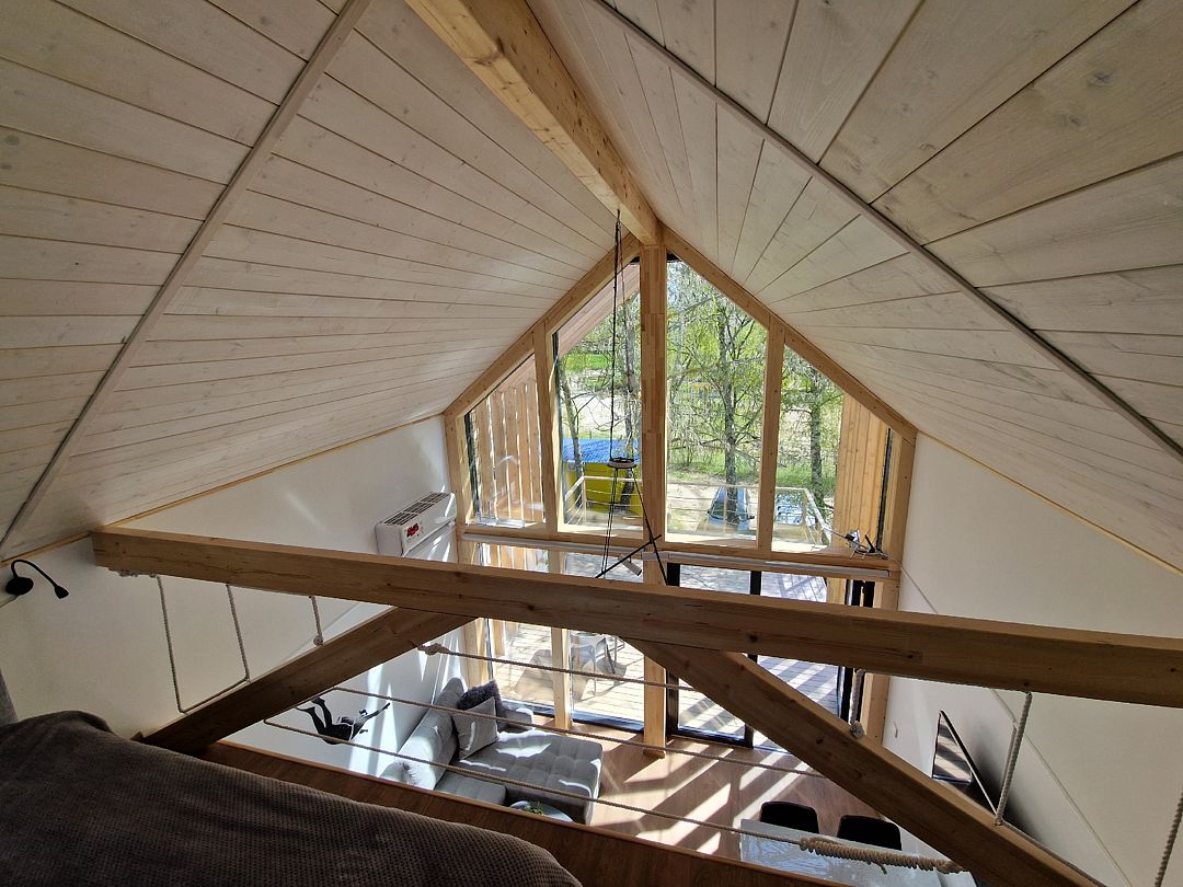 На втором ярусе, куда ведет удобная деревянная лестница, расположена видовая спальня с двуспальной кроватью (200 х 160 см), ортопедическим матрасом премиум-класса и постельным бельем из эко-хлопка, не требующего глажки. Есть стеллаж с коробами для хранения вещей, а также мансардное окно. Пользование Wi-Fi входит в стоимость проживания.