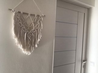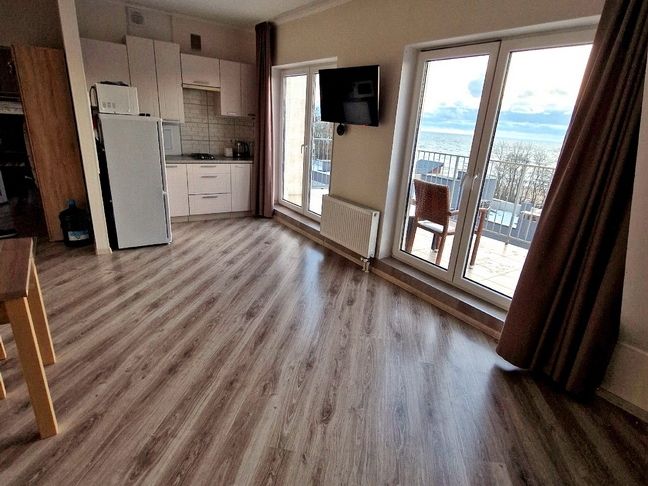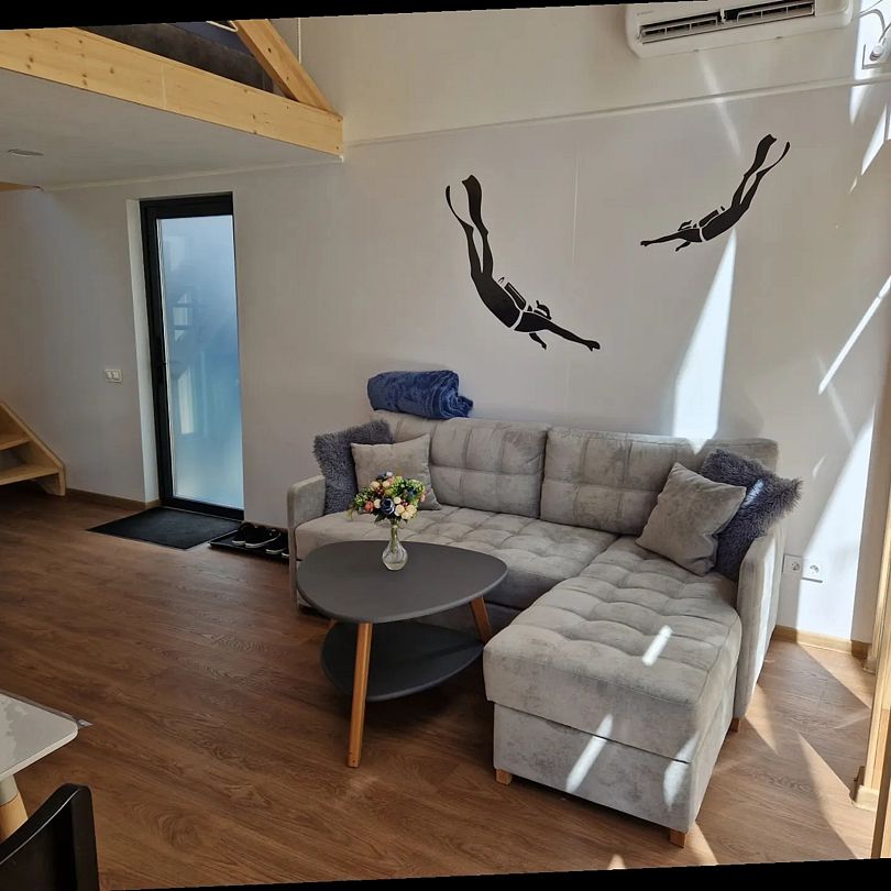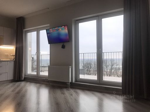 В гостиной раскладывающийся диван, обеденный стол для 4 гостей, телевизор с приставкой Smart TV и доступом в «Окко» и, самое главное, панорамный вид на море! На террасе стоит уличный стол и стулья, где, укутавшись в плед, можно любоваться закатом.