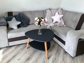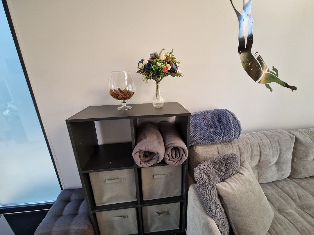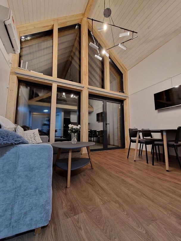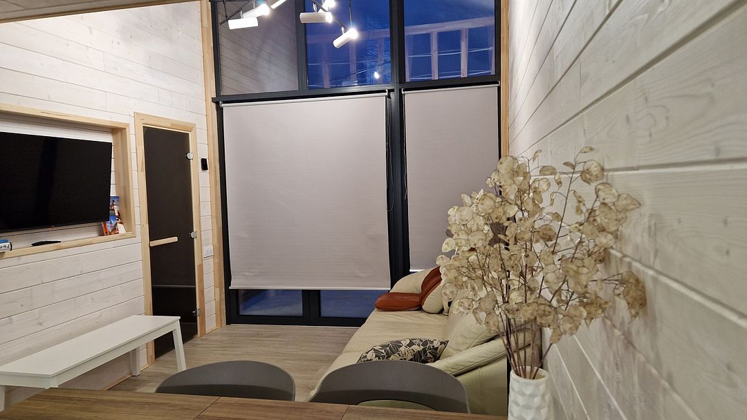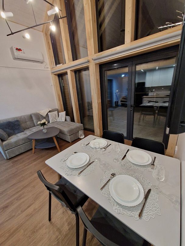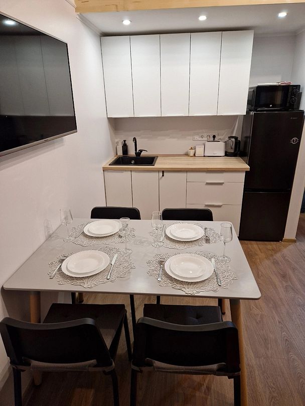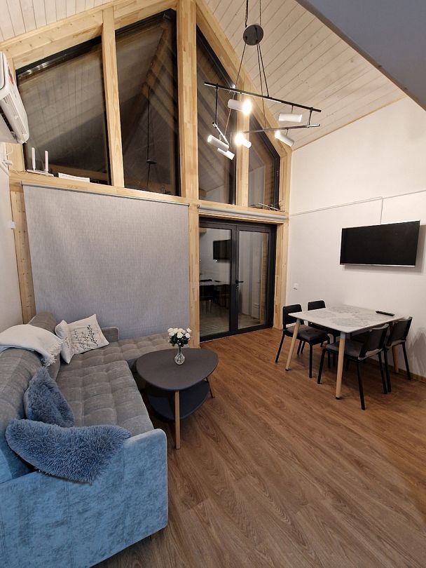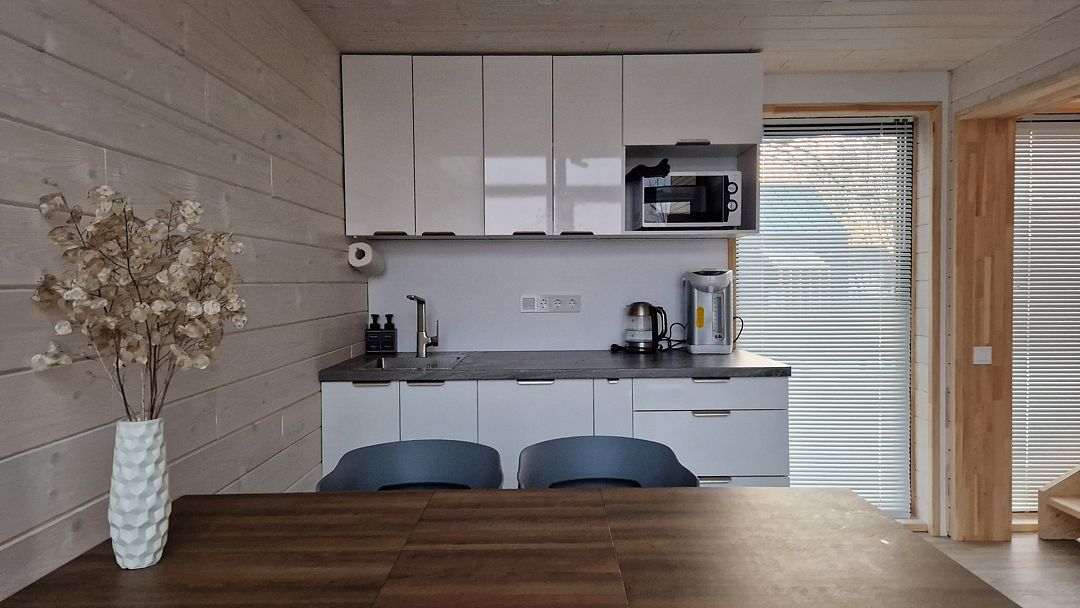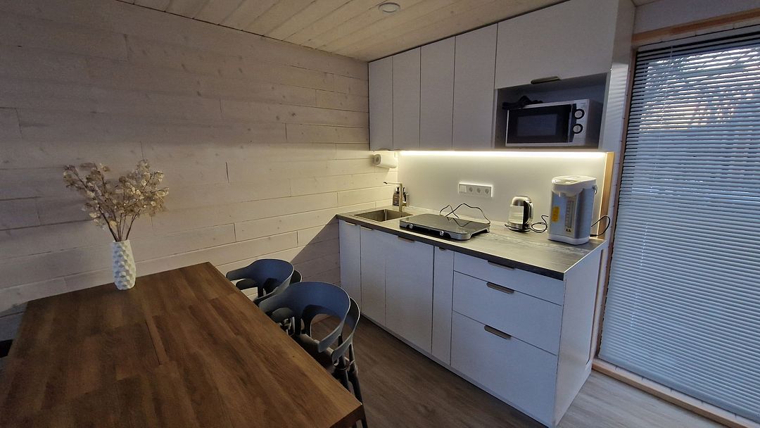 Кухня - полностью укомплектованная с бытовой техникой - посудомоечная машина, микроволновая печь, чайник, тостер, индукционная двухкомфорочная плитка, полноценный холодильник с морозильной камерой, термопот на 6,5 л, обеденный стол и стулья для шести гостей. В гостевой зоне раскладывающийся гостевой диван (200 х 150 см), журнальный столик, напольный светильник, телевизор со SmartTV. Также есть супер-тихий кондиционер инверторного типа, подогрев полов, на панорамных окнах - рулонные шторы блэкаут, полотенцесушители, фен, беспроводной ручной пылесос. Гель для душа, шампунь и кондиционер для волос, набор полотенец отельного качества (плотностью 500 г/м), кроксы, уличные пледы, халаты, шапочки для бани и банные простыни и многое другое предлагаются гостям (использование входит в стоимость проживания).