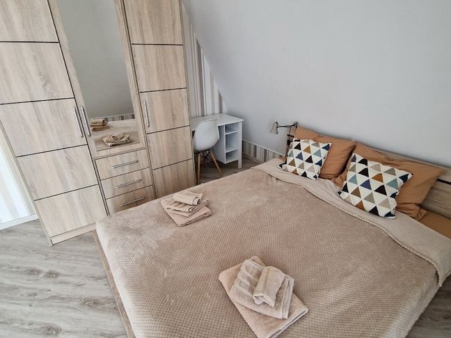 Спальня — отдельная, запирающаяся на ключ комната, с ортопедическим матрасом на кровати Queen size (160 на 200 см), постельным бельем из эко-хлопка, не требующего глажки, светом для чтения, рабочим столом и шкафом. Сушильная и гладильная доски, утюг, обогреватель — предоставляются. Терраса в спальне открывает вид на Янтарный.