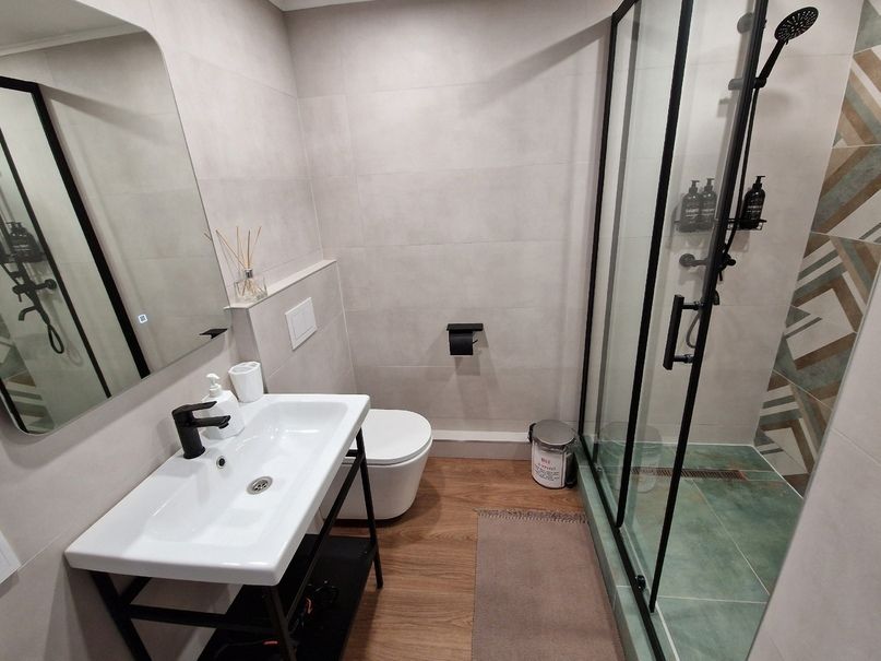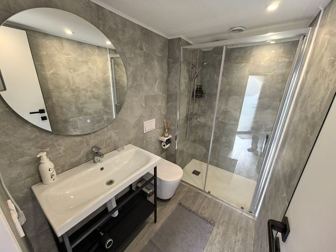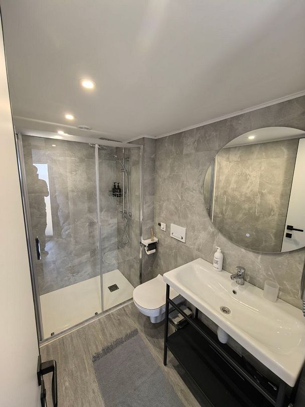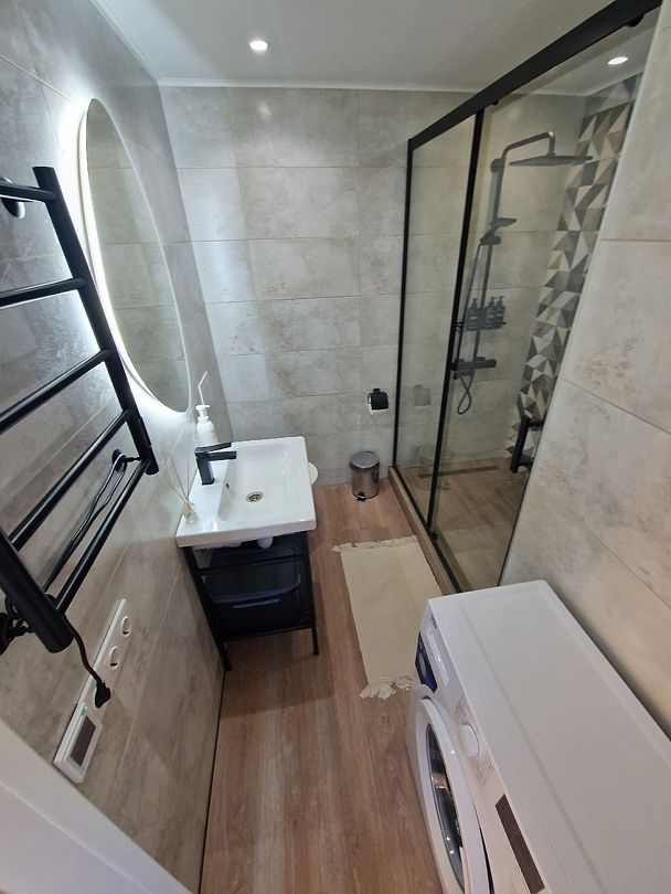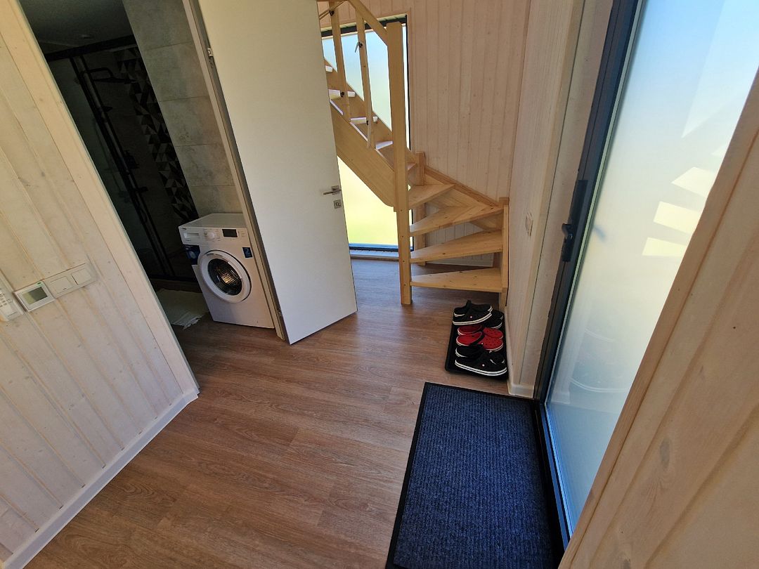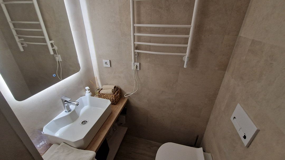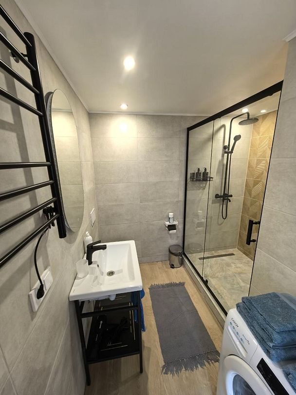 На первом этаже расположен с/у: большая душевая кабина с тропическим душем, подвесной унитаз с инсталляцией, зеркало с парящей подсветкой, беспроводной пылесос, полотенцесушитель и стиральная машина. Фен, утюг, гель-шампунь и кондиционер для волос, набор полотенец отельного качества (плотностью 500 г/м) входят в стоимость проживания.
