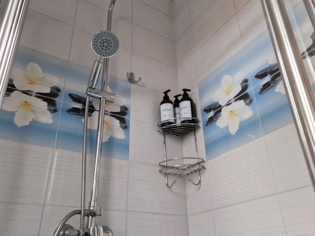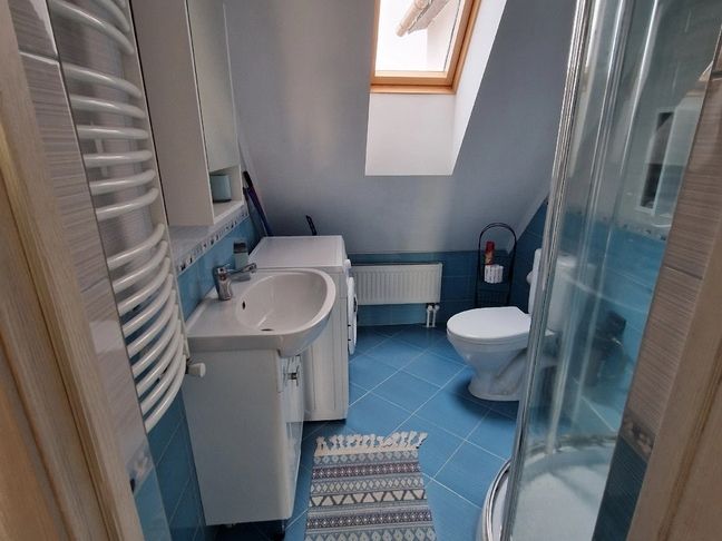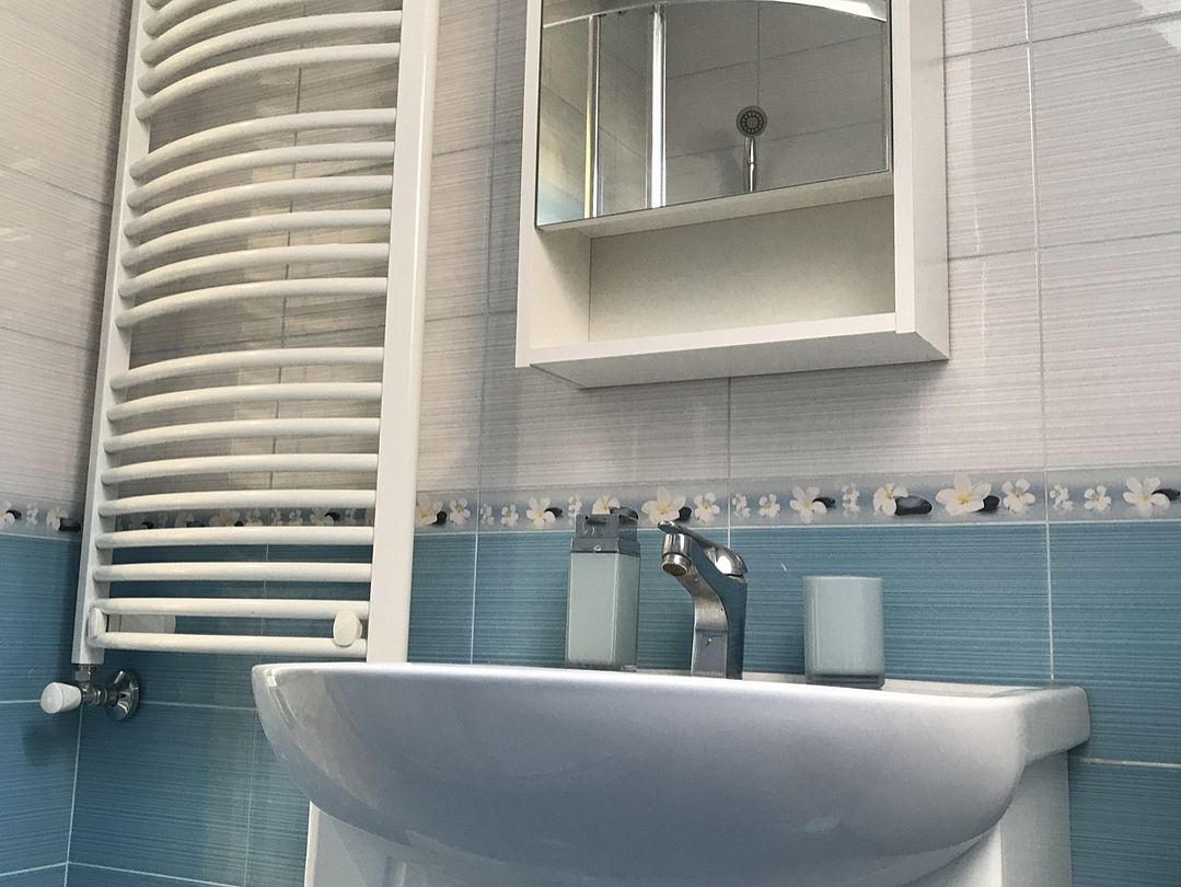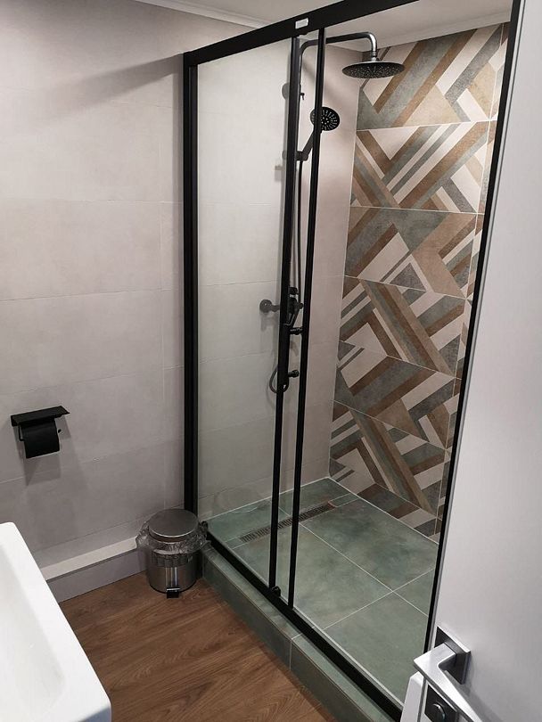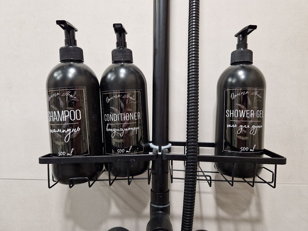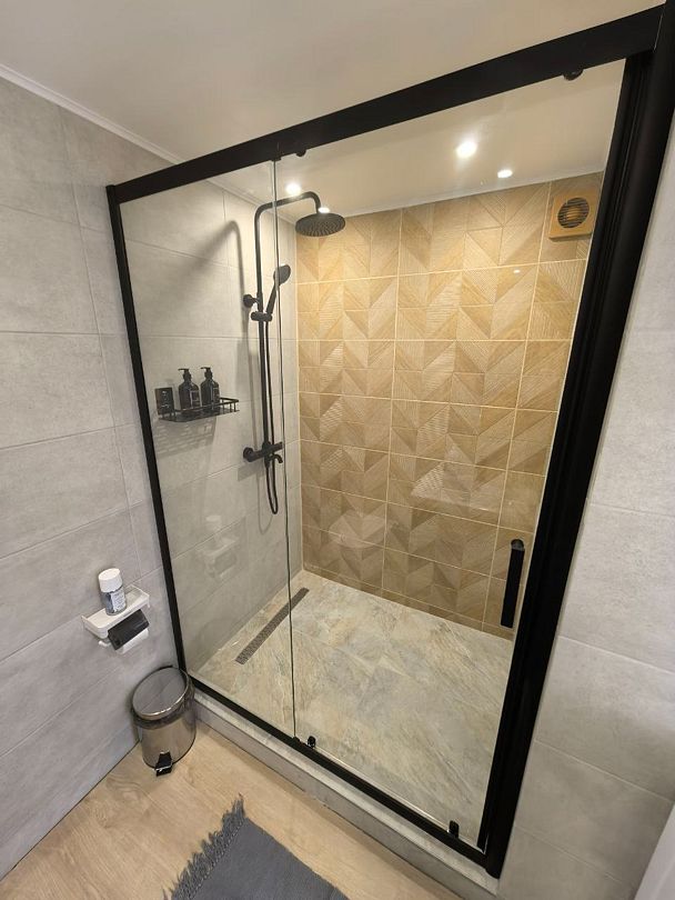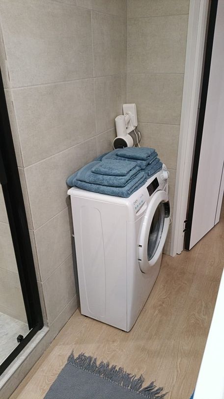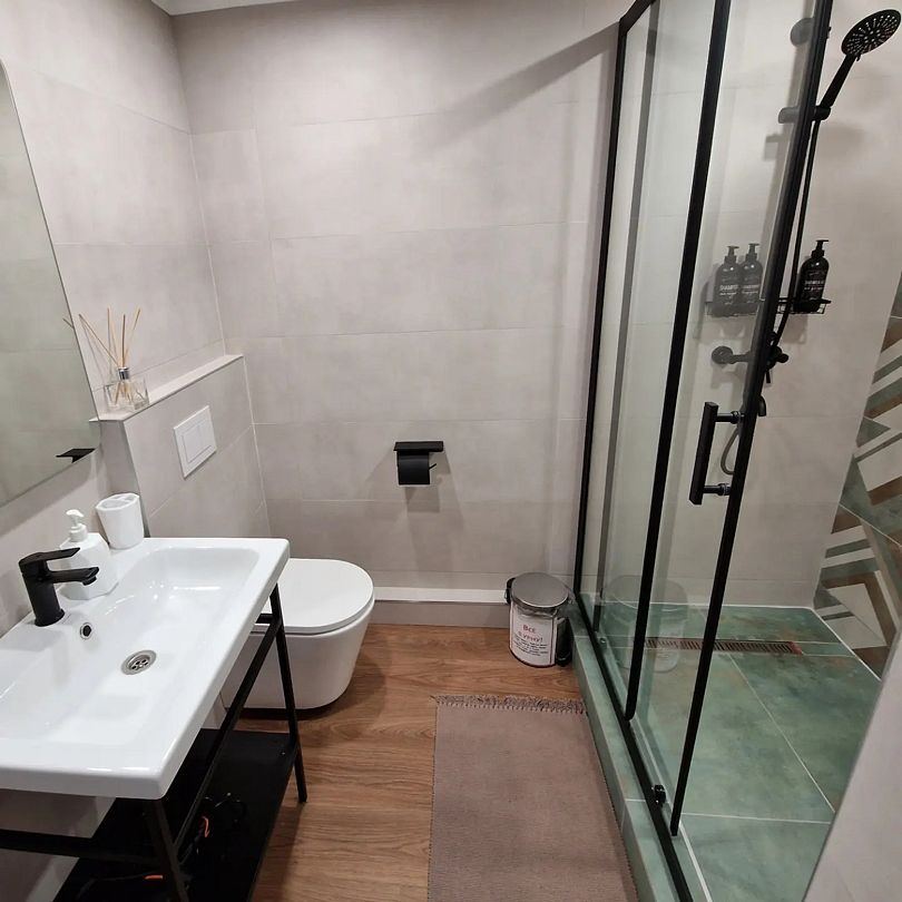 На первом этаже расположен с/у: большая душевая кабина с тропическим душем, подвесной унитаз с инсталляцией, зеркало с парящей подсветкой, беспроводной пылесос, полотенцесушитель и стиральная машина. Фен, утюг, гель-шампунь и кондиционер для волос, набор полотенец отельного качества (плотностью 500 г/м) входят в стоимость проживания.