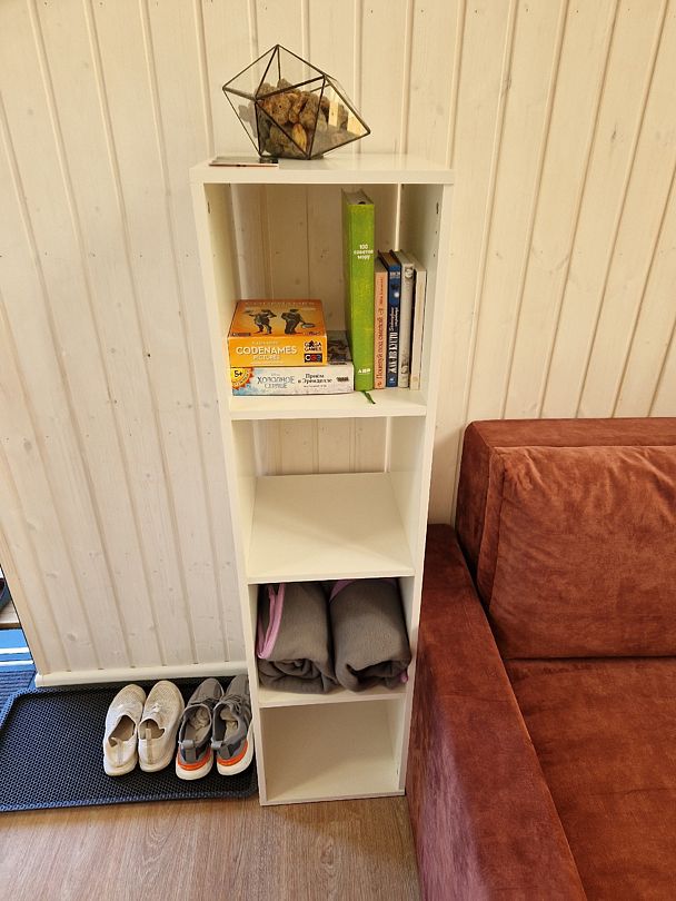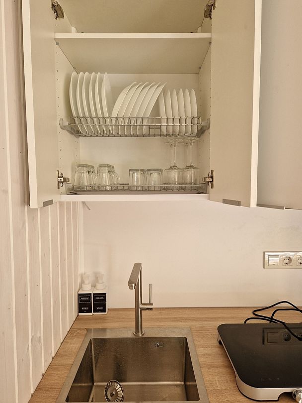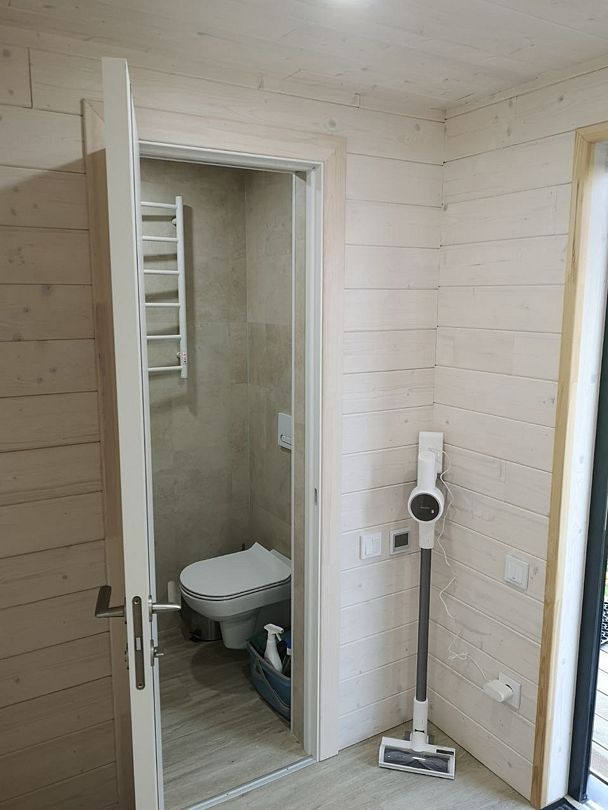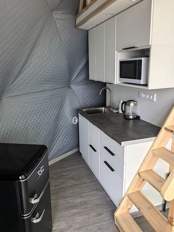 Санузел с душем, полотенцесушитель расположены в доме, как и полноценная кухонная зона с микроволновкой, индукционной плитой и холодильником, и всей необходимой утварью (посуда, кастрюли и тд).