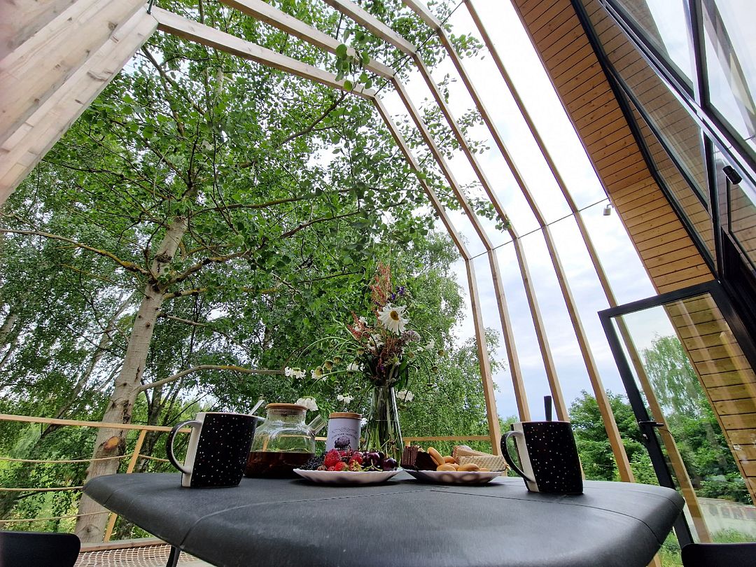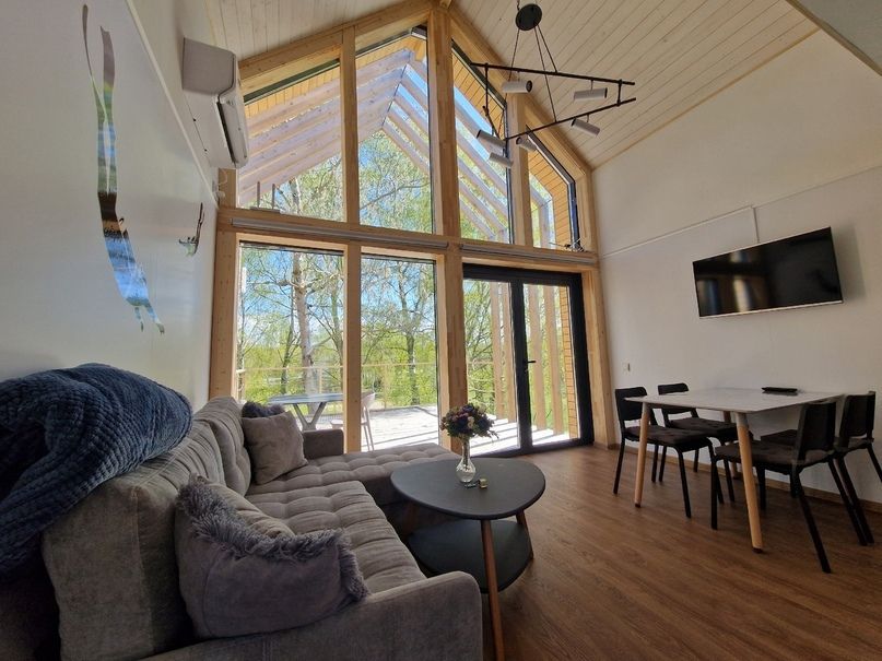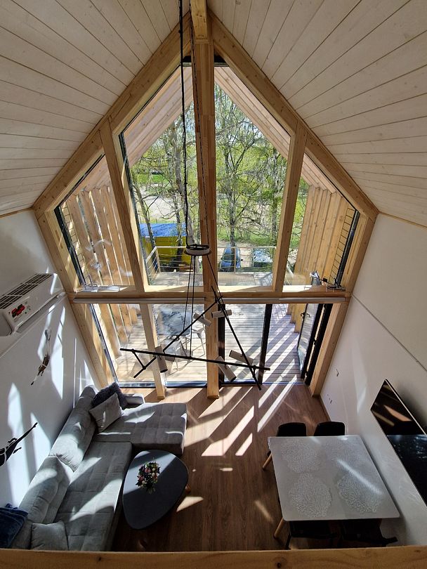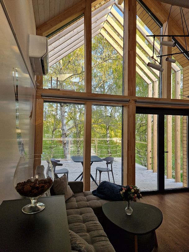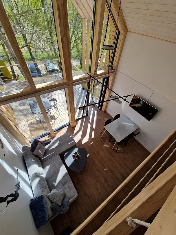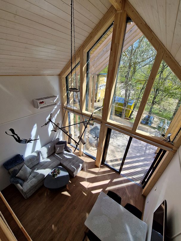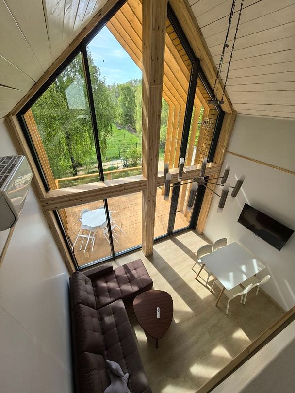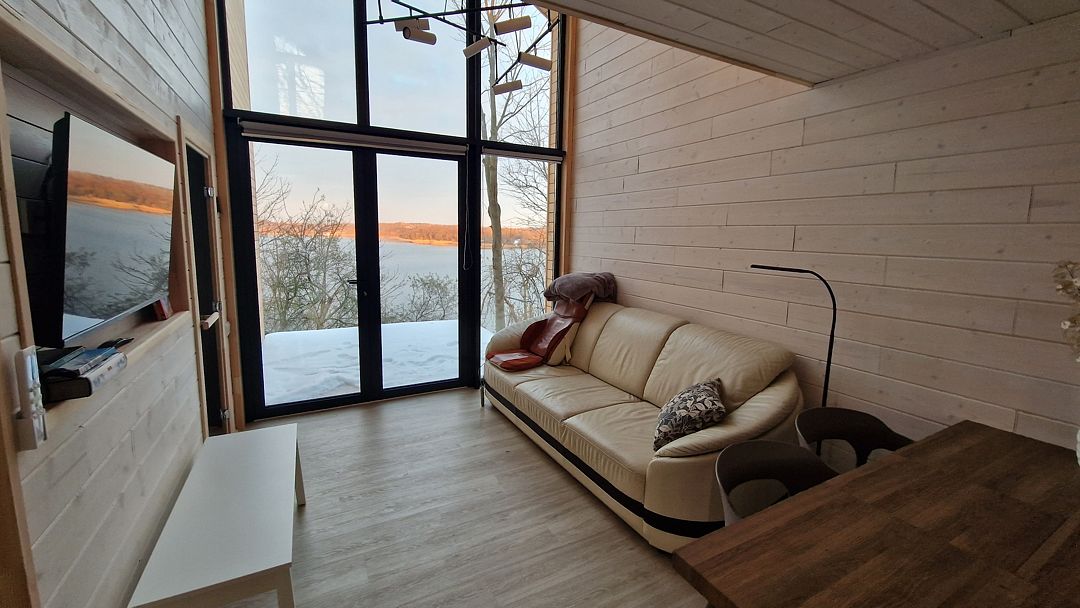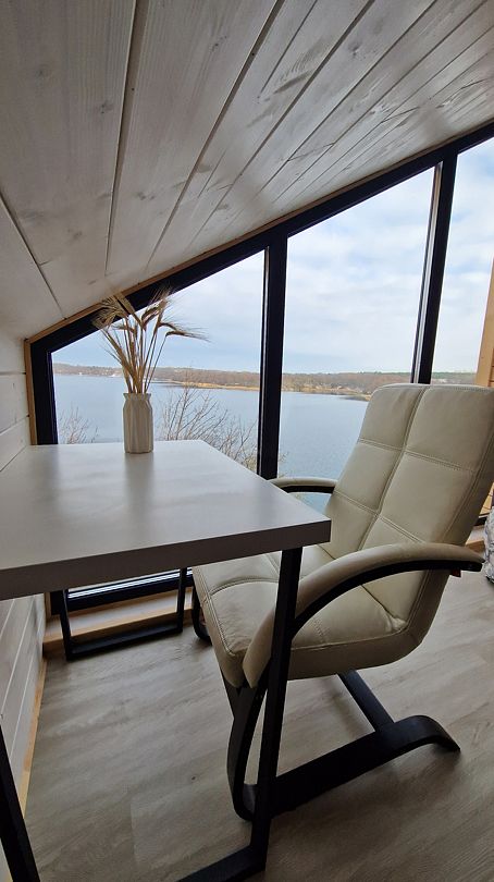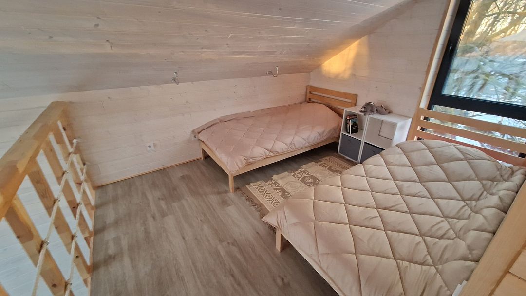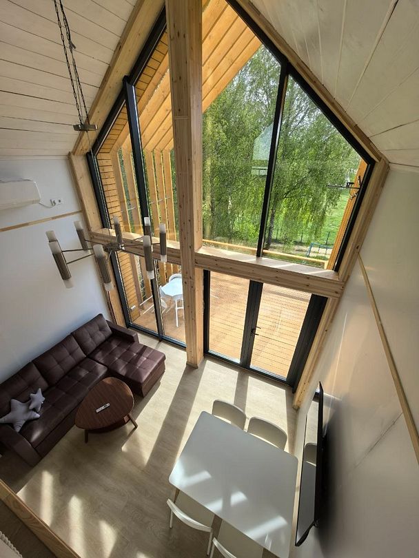 Площадь 50 кв.метров. Внизу два гостевых раскладных дивана, с которых открывается потрясающий вид на все Янтарное озеро. Наверху двуспальный ортопедический матрас, свет для чтения, розетки, стеллаж для вещей.
