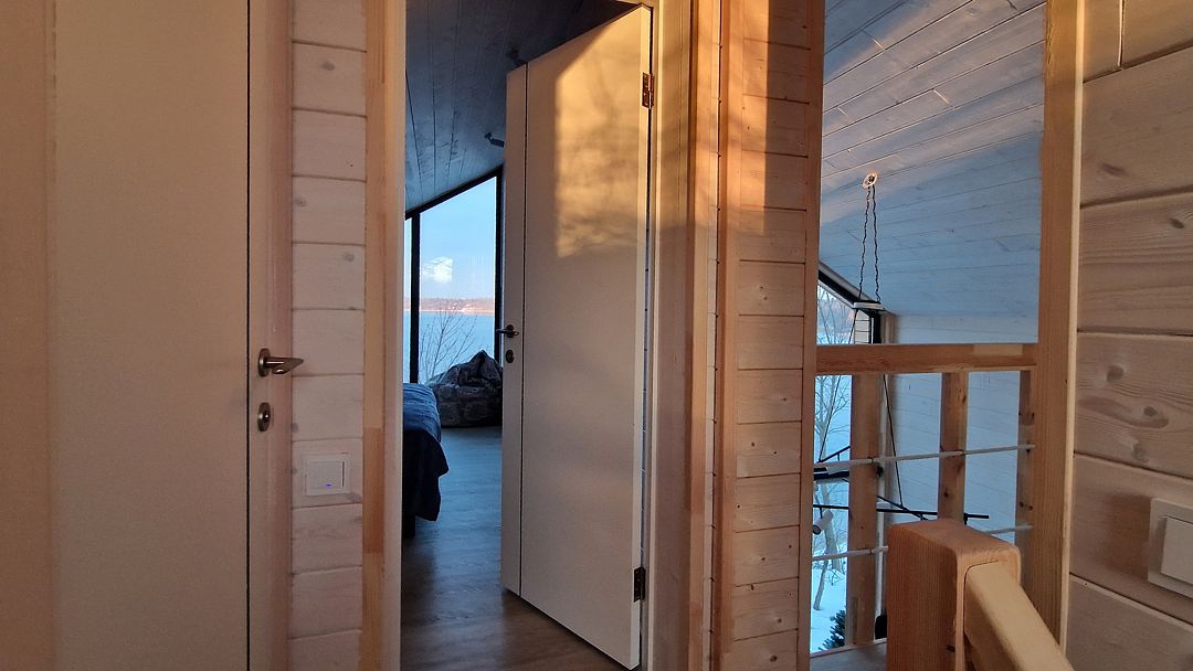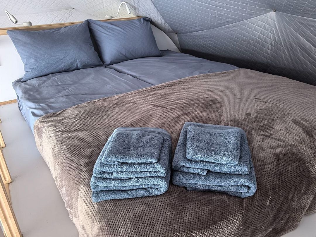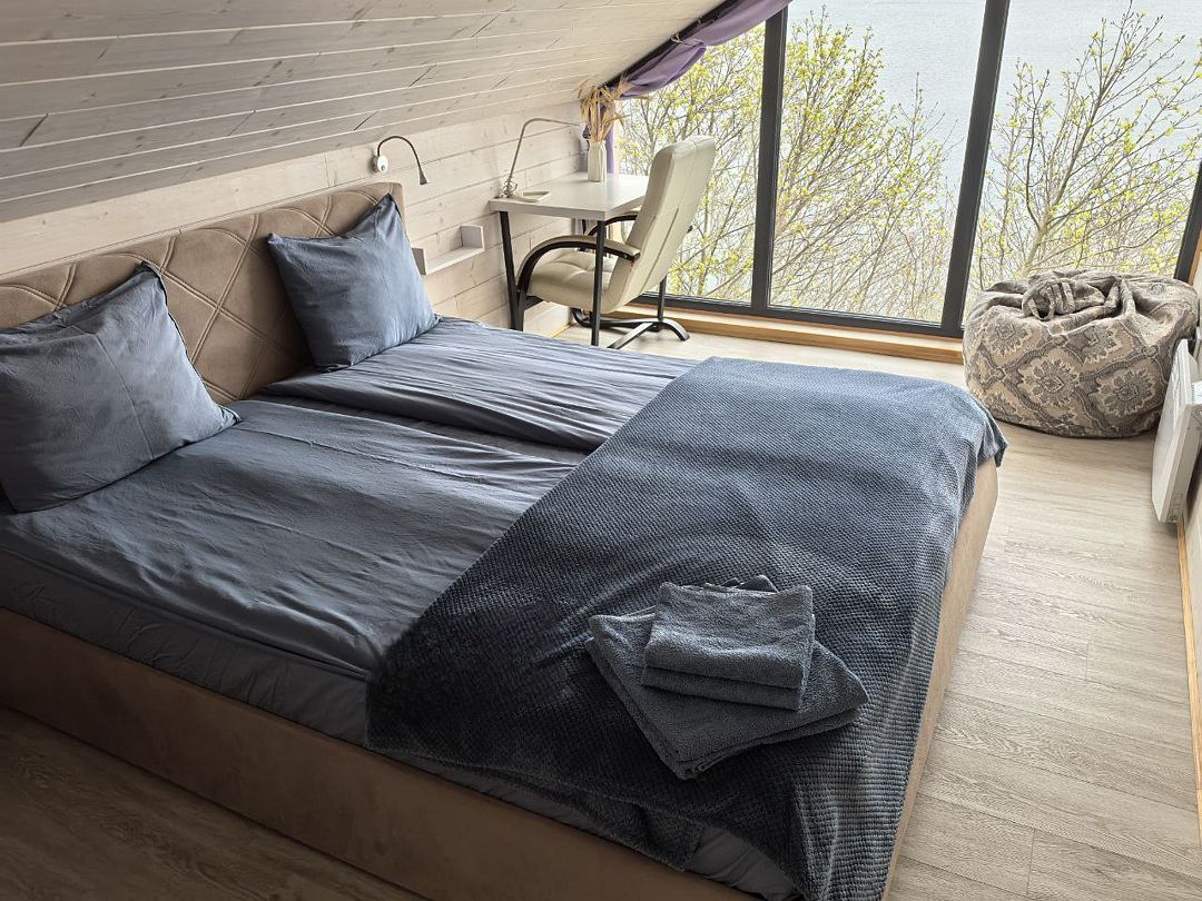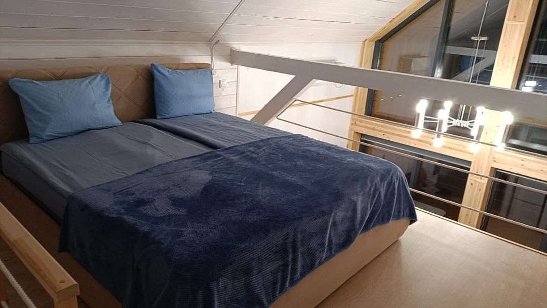 Рассчитан для 4 гостей. Внутри двуспальная кровать 180х200 с ортопедическим матрасом, с которой открывается захватывающий вид на всю панораму озера. Наверху также спальное место для двоих со светом для чтения, розетками и стеллажом. Постельное белье, полотенца гель-шампунь, кондиционер предоставляются.