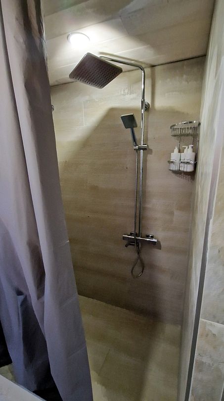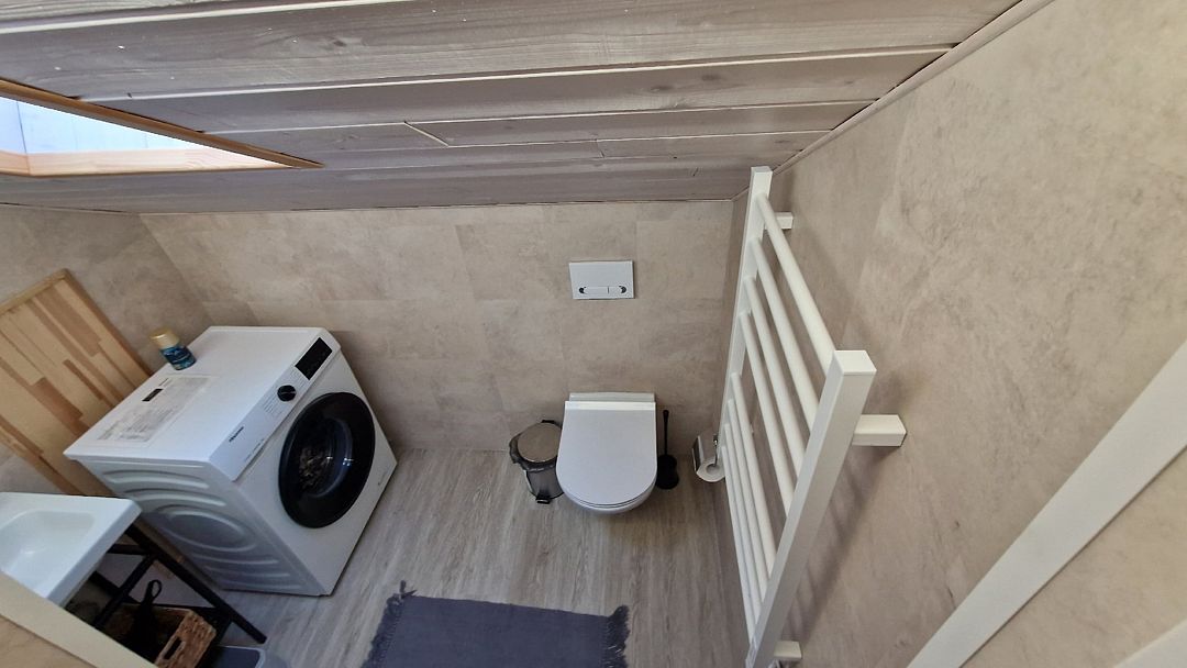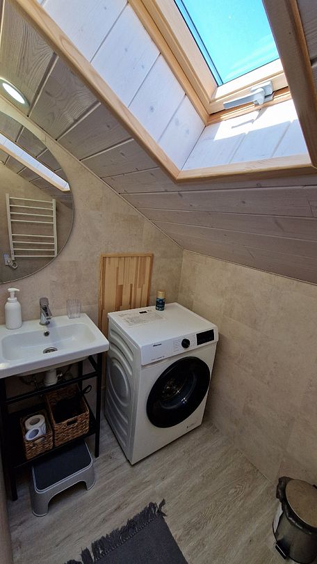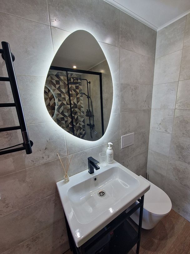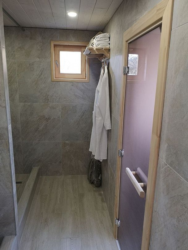 Внизу расположен с/у: большая душевая кабина с обычным и тропическим душем, унитаз с инсталляцией, зеркало необычной формы с парящей подсветкой, полотенцесушитель, беспроводной ручной пылесос и стиральная машина. Фен, утюг, гладильная и сушильная доски, гель для душа, шампунь и кондиционер для волос, набор полотенец отельного качества (плотностью 500 г/м2), кроксы, уличные пледы и многое другое — их использование входит в стоимость проживания.