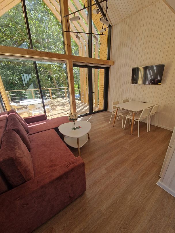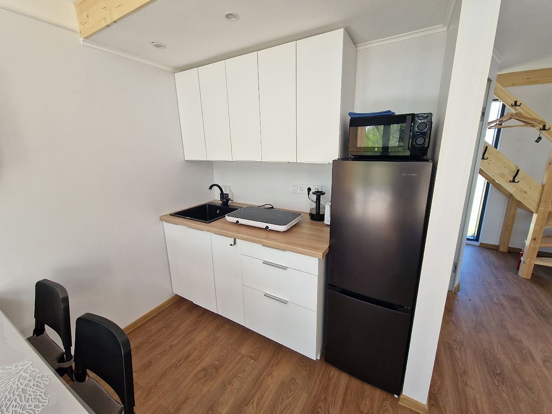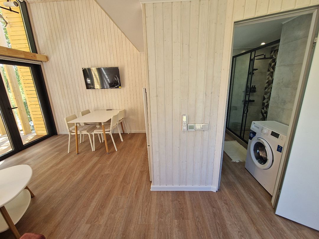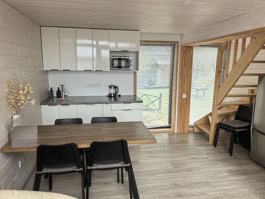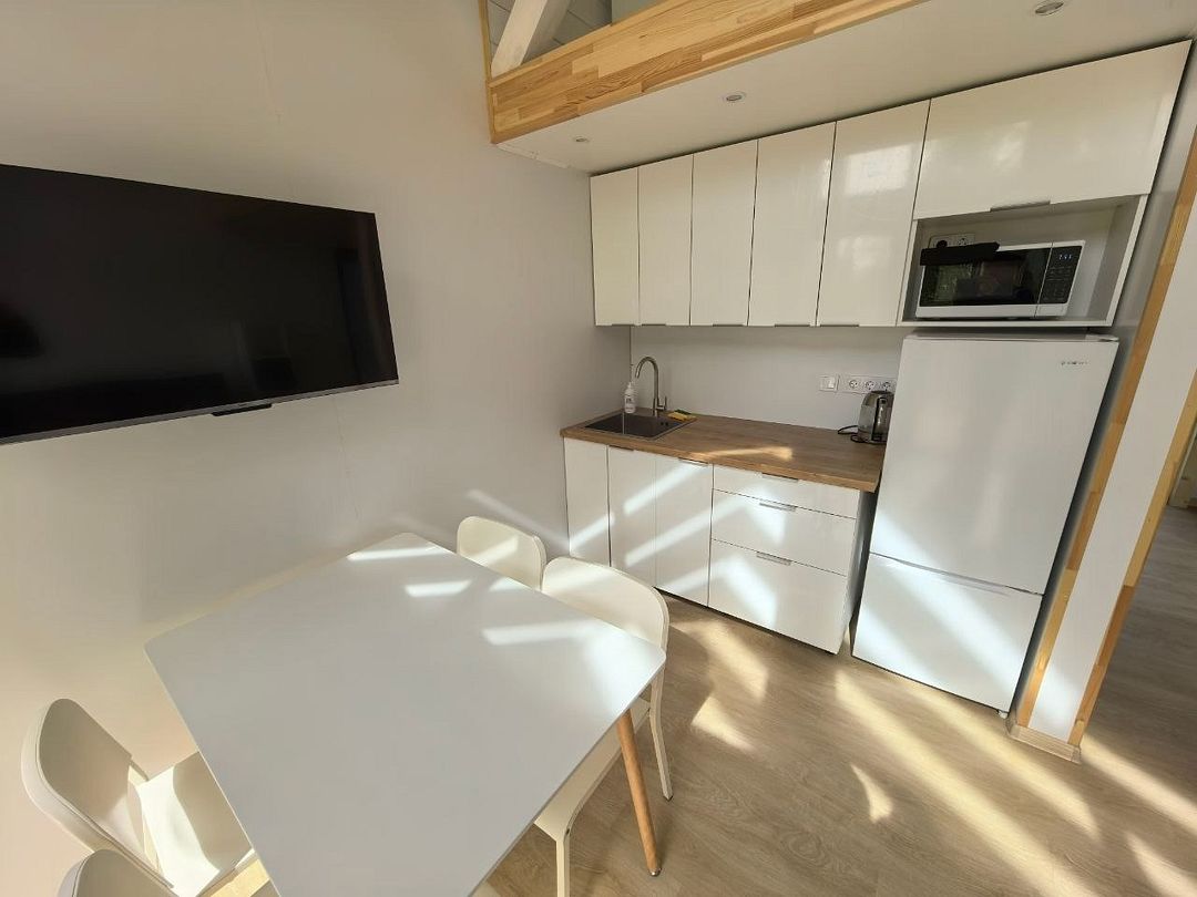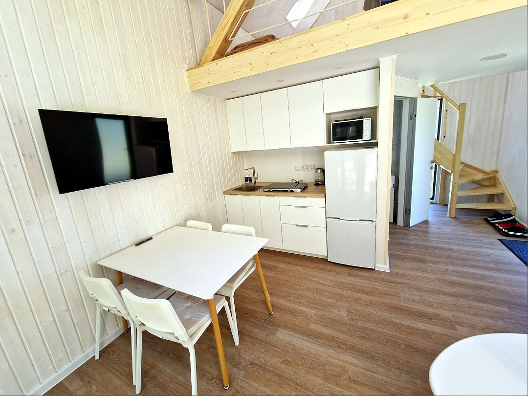 В коттедже полностью укомплектованная кухня с бытовой техникой (микроволновая печь, чайник, тостер, индукционная двухкомфорочная плитка, полноценный холодильник с морозильной камерой), обеденная зона для четырех гостей и телевизор с Smart TV.