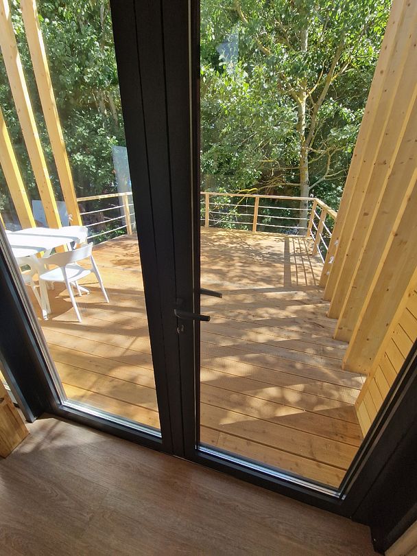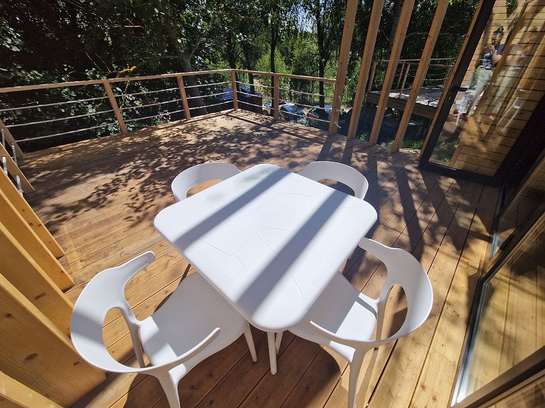 С детьми до 3х лет: обратите внимание, что ограждение террас и верхнего яруса в домиках - канатные.
