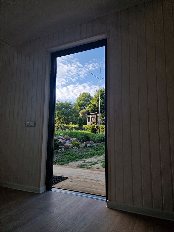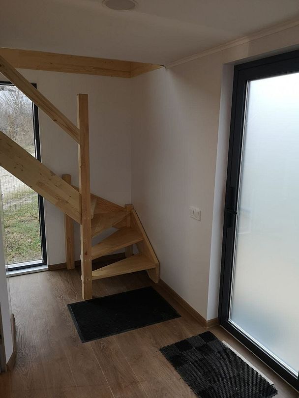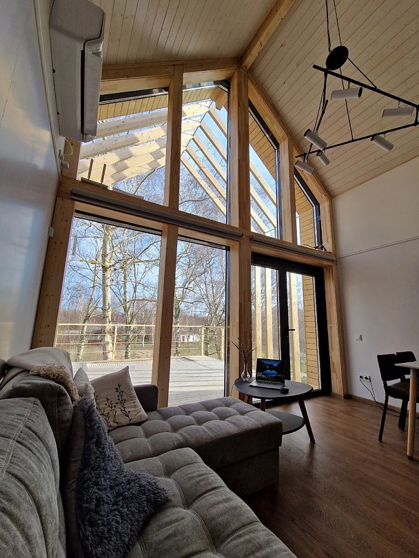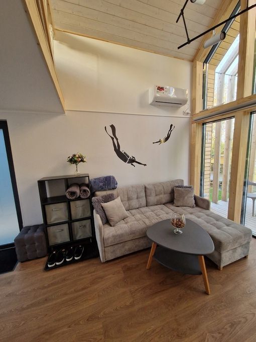 🏡Расположен на базе отдыха "Кусто" в Янтарном, в 50 метрах от пляжа Янтарного озера и в 700 метрах от Балтийского пляжа. Открытая планировка создает ощущение простора, а двусветное остекление наполняет дом естественным светом. На первом этаже находится укомплектованная кухня (микроволновая печь, чайник, тостер, индукционная двухкомфорочная плита, полноценный холодильник с морозильной камерой), обеденная зона для четырех гостей и телевизор с SmartTV. В гостевой зоне раскладывающийся диван, журнальный столик. Также есть кондиционер, подогрев полов и рулонные шторы блэкаут.