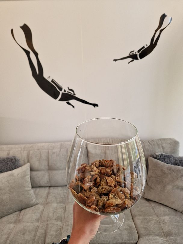 Коттедж базы отдыха "Кусто" имеет площадь около 40 кв. м (плюс терраса 25 кв. м) в стиле барнхаус и расположен на участке 0,4 га в Янтарном, в 50 метрах от пляжа Синявинского (Янтарного) озера и в 1,5 км от Балтийского моря. Коттедж спроектирован известным калининградским архитектором с учетом рельефа и видовых особенностей участка. Открытая планировка создает ощущение простора, а двусветное остекление наполняет дом естественным светом. Заселение бесконтактное 24/7 по индивидуальному паролю для электронного замка.