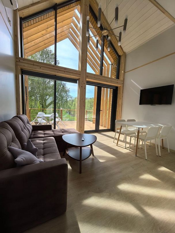 Коттеджи базы отдыха выполнены в современном стиле барнхаус, что гармонично сочетается с окружающим ландшафтом и создает атмосферу простора и света благодаря панорамному двусветному остеклению. Каждое помещение наполнено естественным светом и обеспечивает комфортный отдых для семей и дружеских компаний.