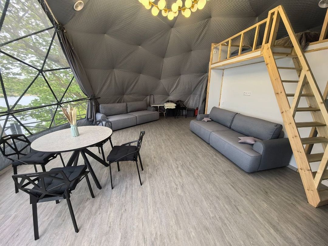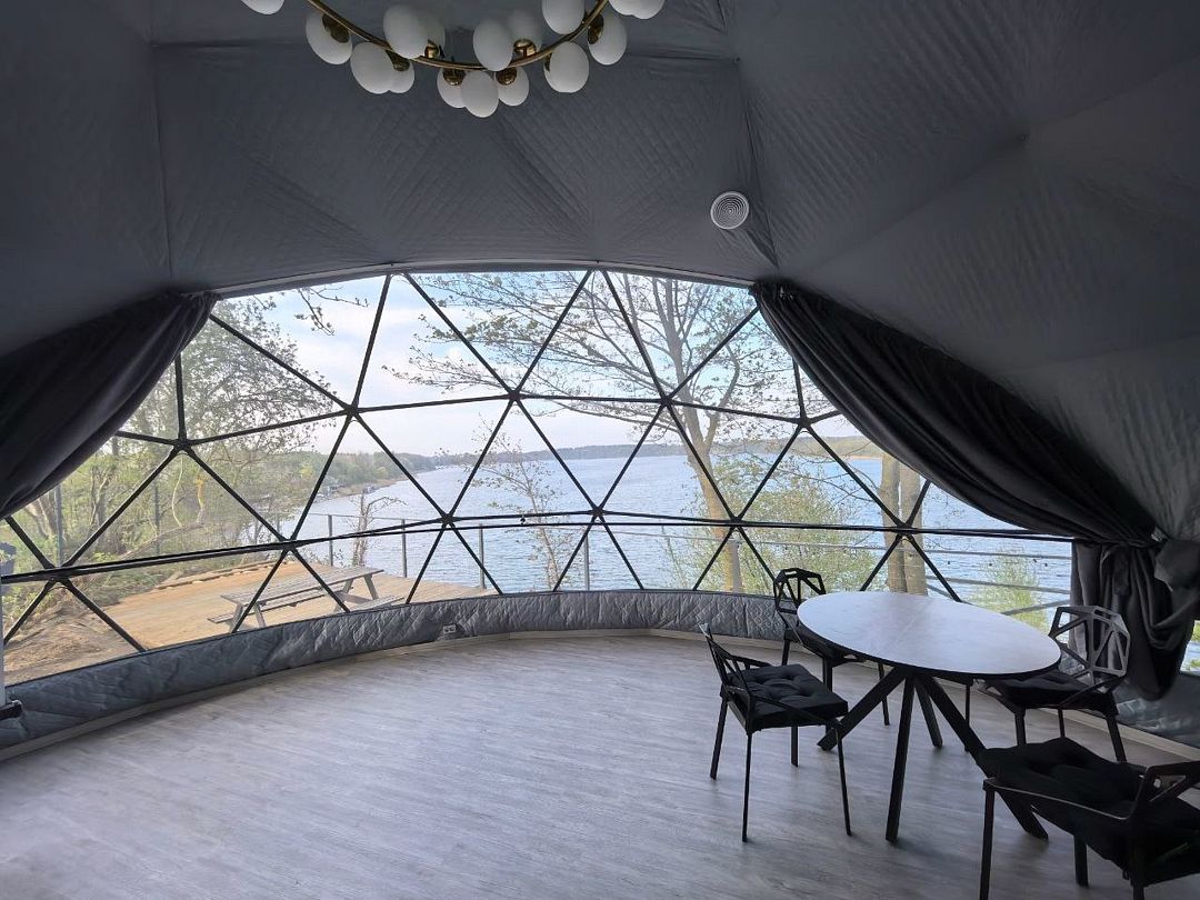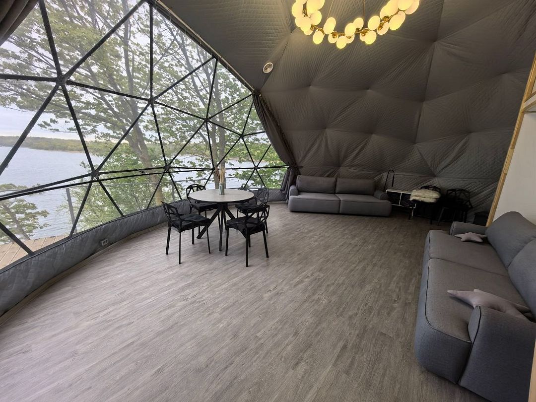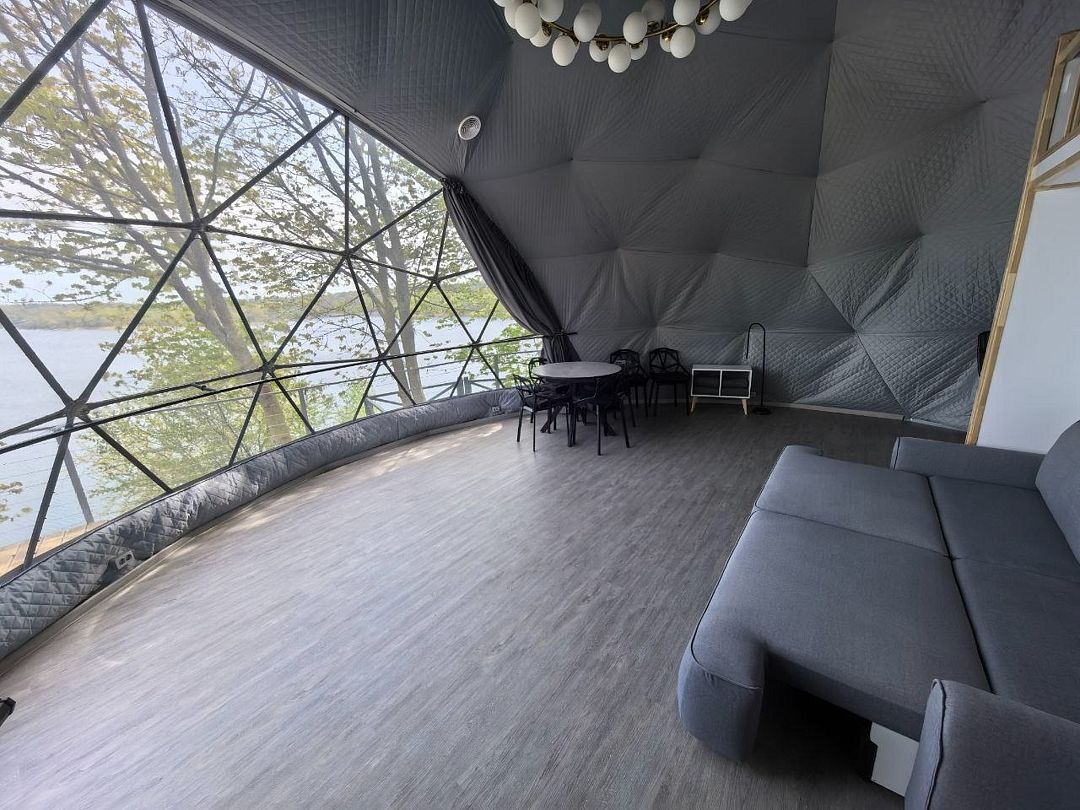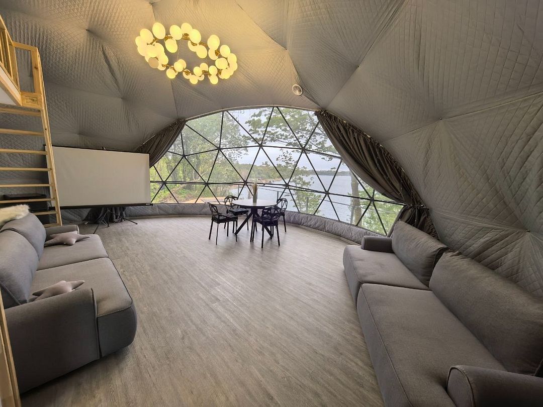 Комфортабельный круглогодичный купольный дом "Атлантика" №5 с шикарным видом на озеро и большой террасой. Построен в 2025 году. Заселение бесконтактное по электронному коду 24/7.
