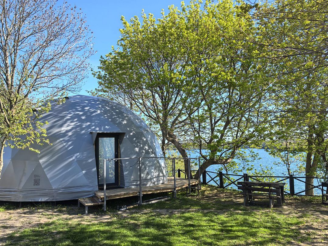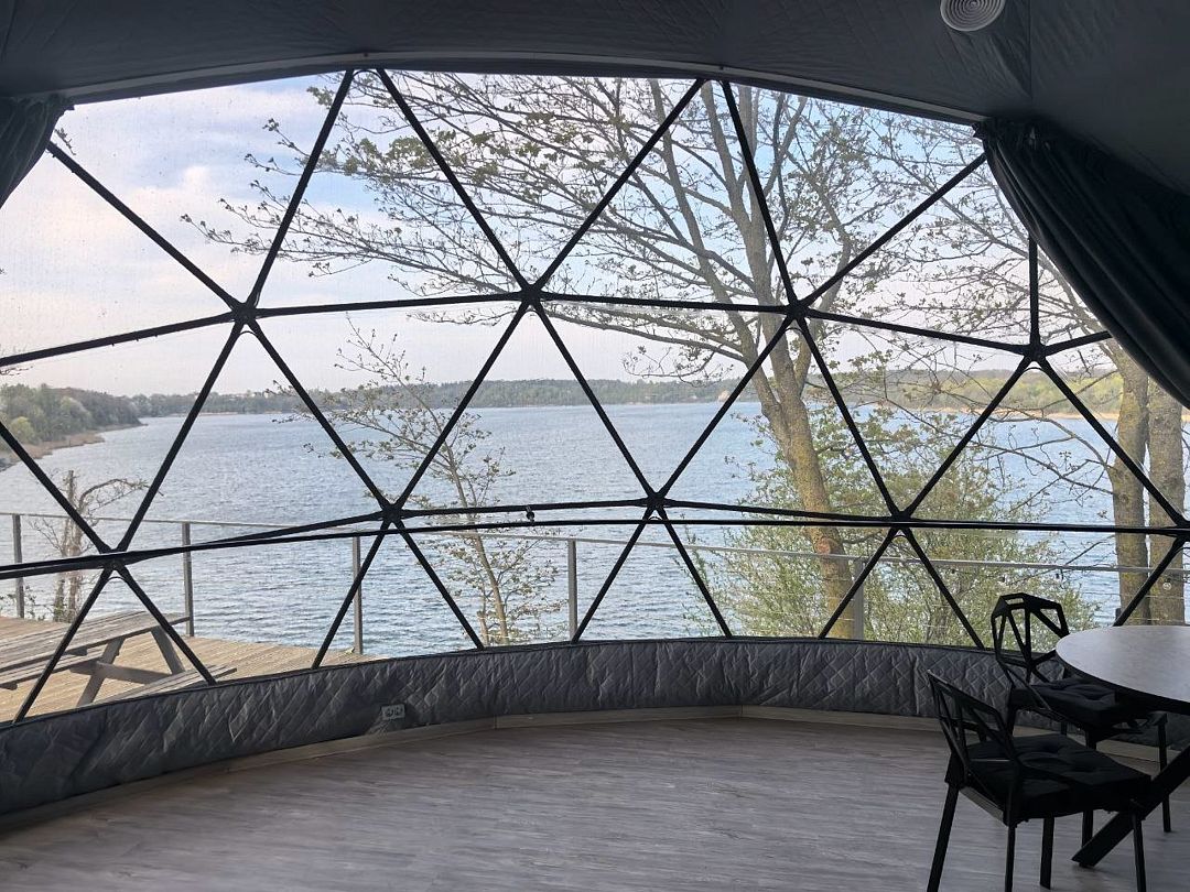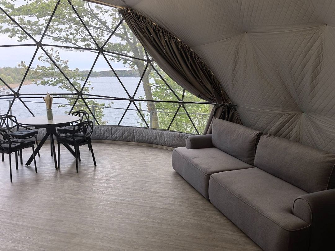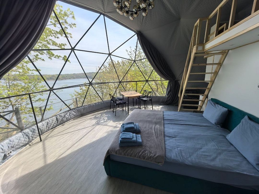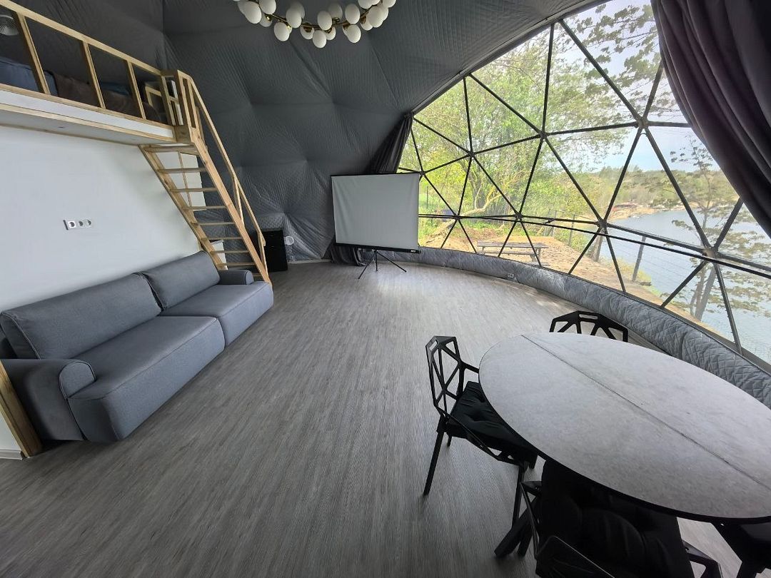 Комфортабельный круглогодичный купольный дом "Атлантика" №5 с шикарным видом на озеро и большой террасой. Построен в 2025 году. Заселение бесконтактное по электронному коду 24/7.
