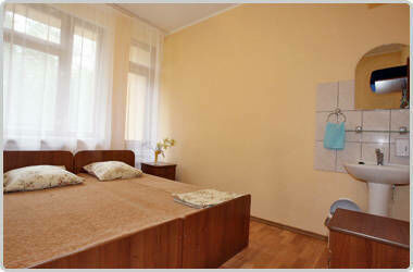 2-х спальная кровать, балкон, умывальник, полотенца, косметика, туалет и душ в коридоре.
