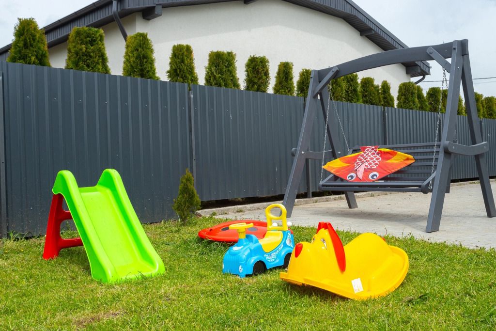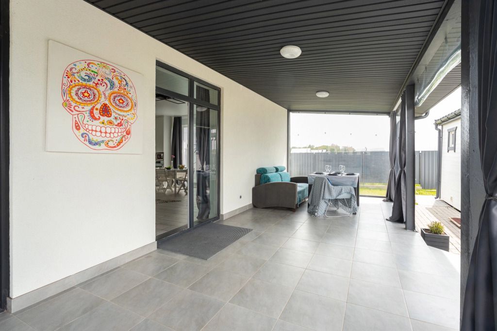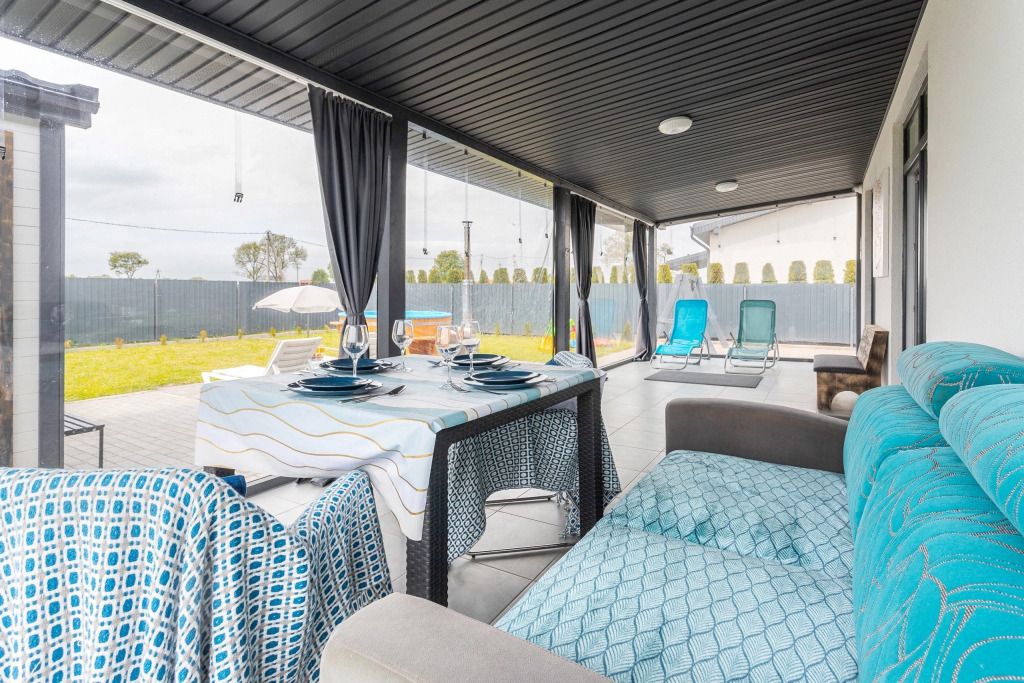 Гости могут воспользоваться 4 лежаками. На террасе имеется зона отдыха, где есть стол, стулья и двуспальный диван, колонка. Весь участок закрыт высоким забором.