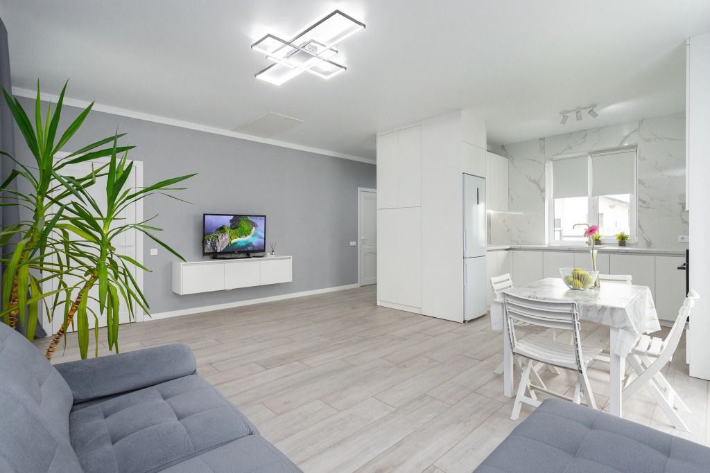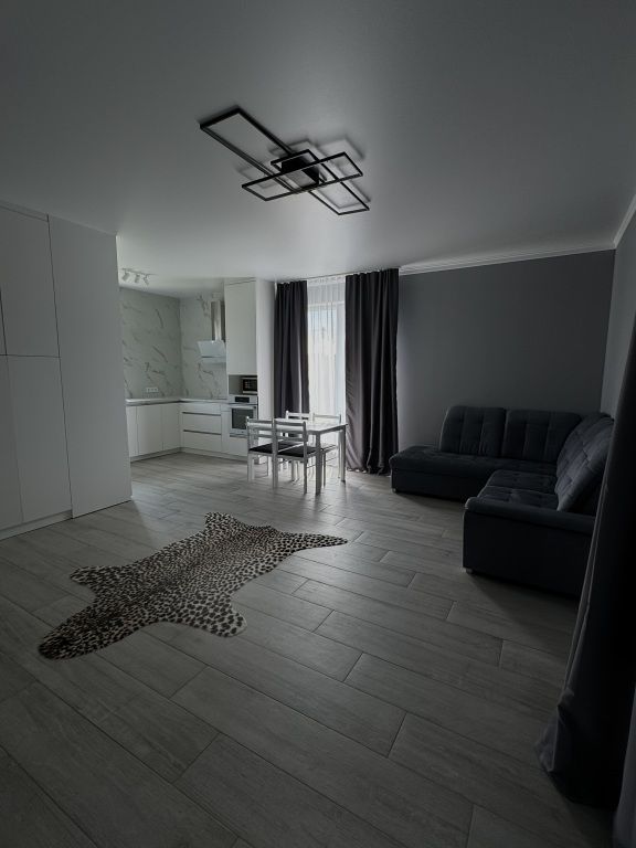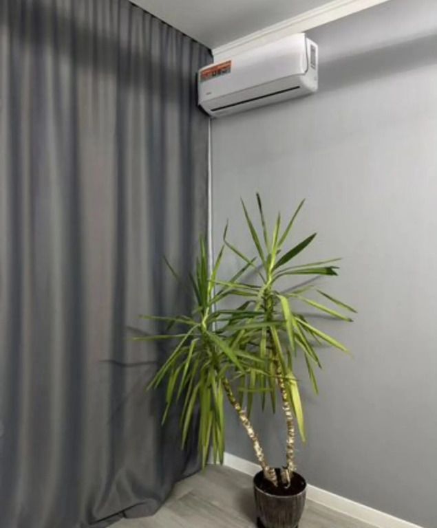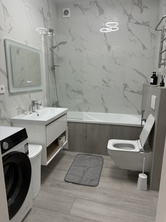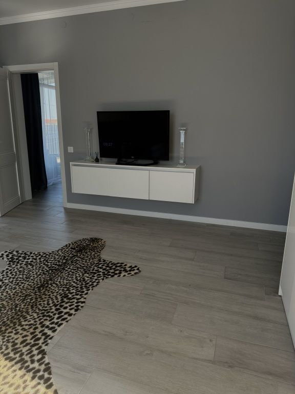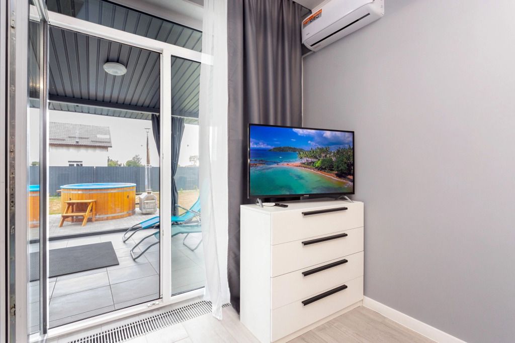 Гостиная оборудована телевизором и двуспальным диваном. В спальне есть кондиционер и двуспальная кровать. А также стиральная машина, гигиенические средства, фен в санузле.