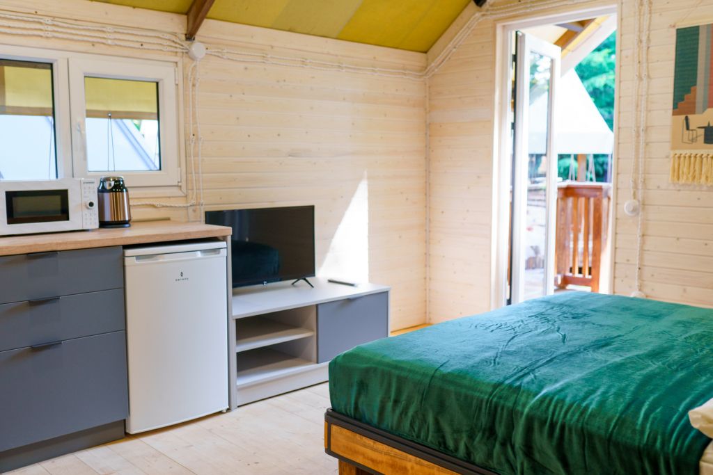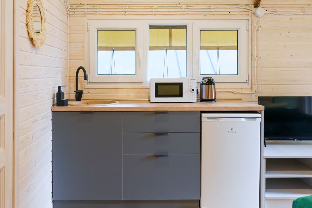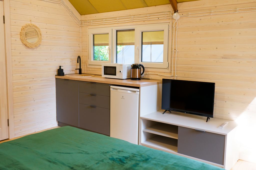 В каждом домике есть душ, туалет, кухнный уголок, телевизор, микроволновая печь и кондиционер. Погрузиться в атмосферу полного релакса возможно в банном чане. Также в глэмпинге «ШАЛАШ» открылся «Банкетный зал» в формате большой беседки. Зал подходит для празднования Нового года, Дня рождения, корпоратива или любого другого праздника.