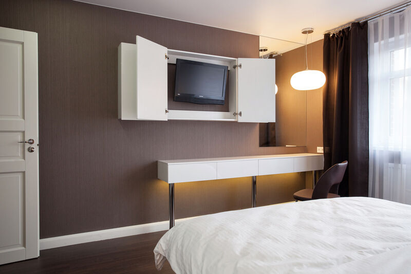 7. Телевизор это отдельная тема, во-первых можно спокойно брать флешку и смотреть на большом экране вечерами что душе угодно. НО. телевизор повешен так, что с кровати его не посмотришь. Мы предположили что может он висит на механизме с поворотом. И бинго! Да! Так оно и вышло!